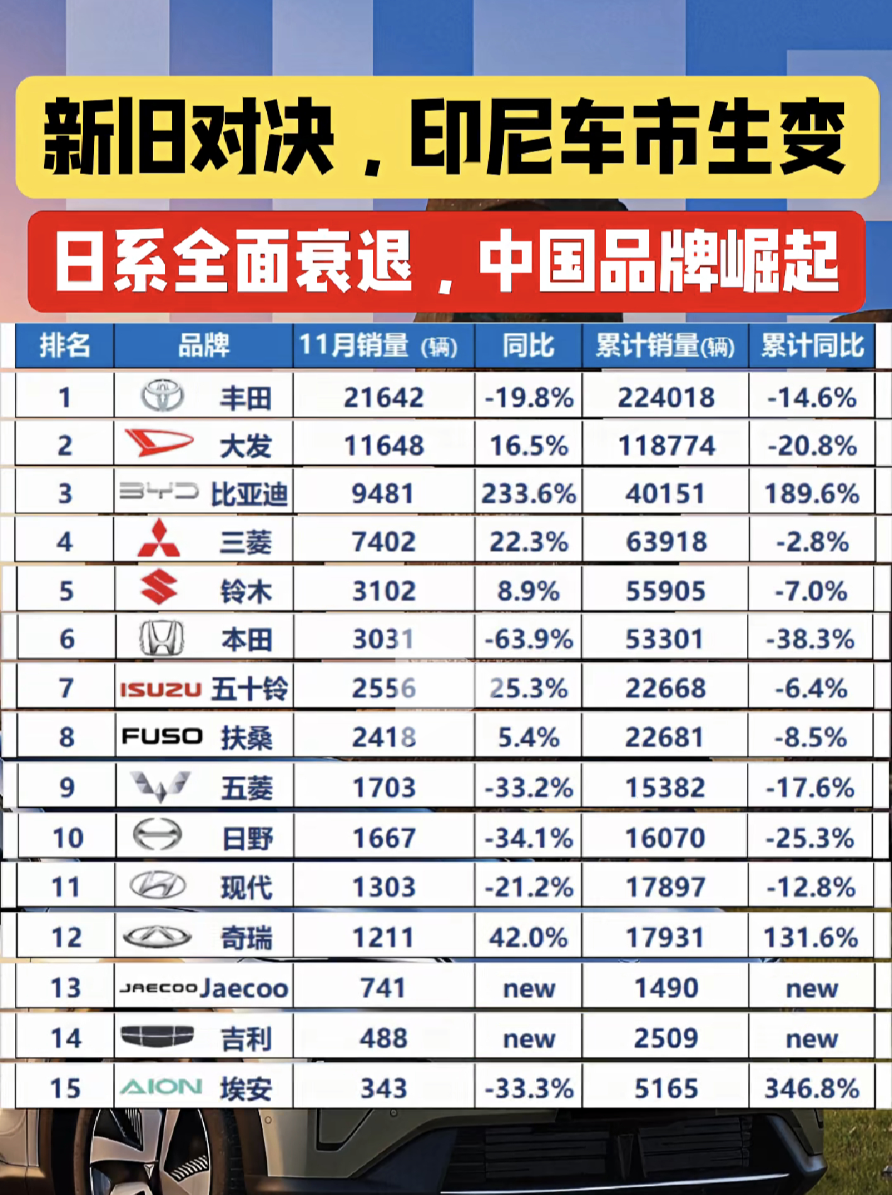 比亚迪带领中国汽车又在东南亚最大的国家印度尼西亚开始发力了。在印度尼西亚,比亚迪和中国汽车的前面只有日本汽车,没有美国汽车,也没有德国汽车,只要把日本汽车打败了,天下就是中国人的,很容易。