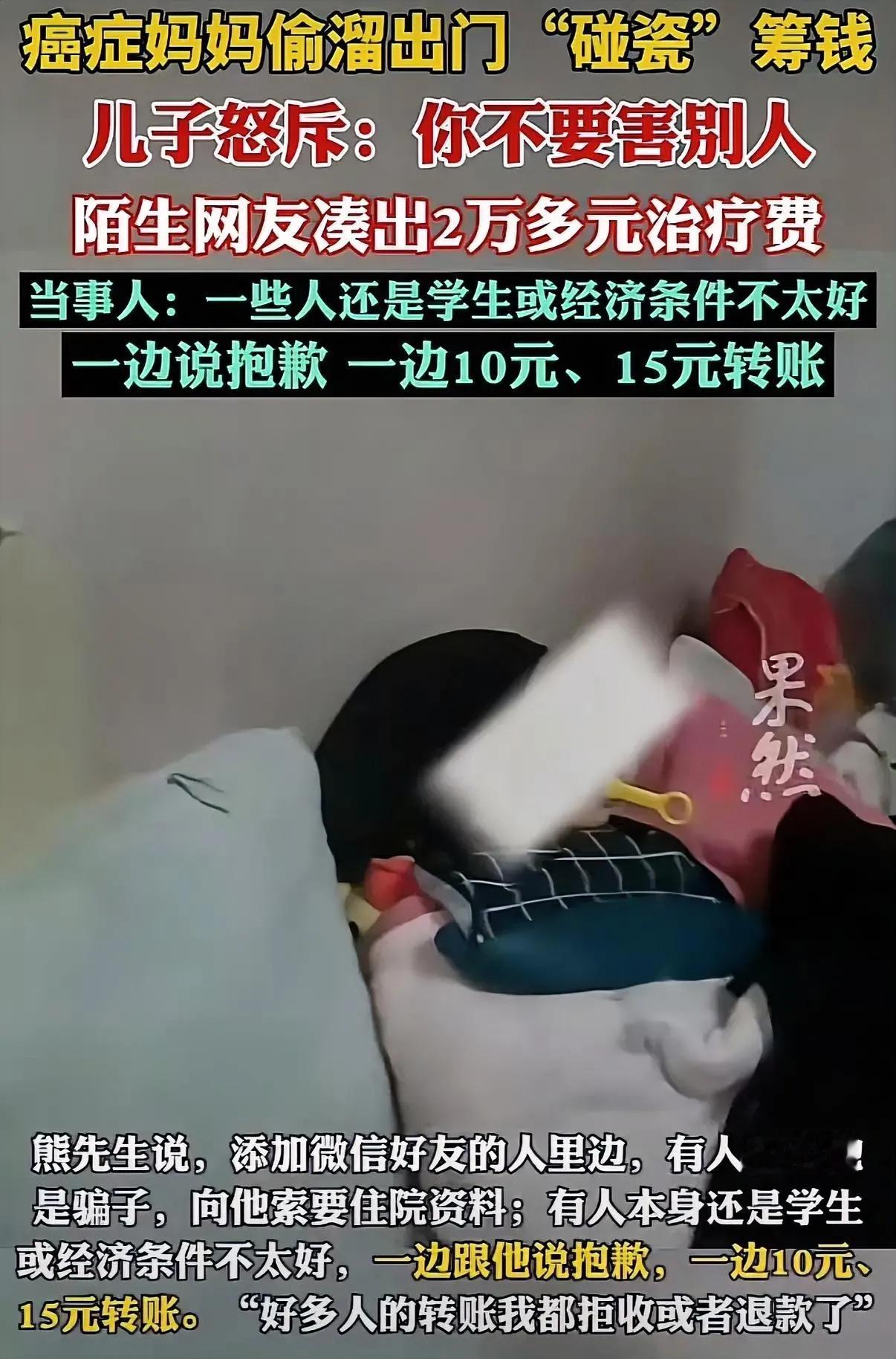 湖北武汉街头一癌症妈妈为了筹钱碰瓷,被儿子怒吼"别祸害人”。 故事的主角是64岁的王秀兰老人和她的儿子熊先生。王秀兰老人不幸患上了口腔癌,治疗过程漫长又痛苦,多次手术下来,癌细胞还转移到了脑部。尽管有医保报销,家里实际也花了11万多元,而且老人工作单位还能二次报销,报销比例也不低,可这病就像个无底洞,压得这个单亲家庭喘不过气来。 熊先生从小父母离异,一直跟着母亲生活,父亲经济和身体状况都不好,母亲生病后,照顾母亲的重担就全落在了他一个人身上。为了照顾母亲,他辞去了原本稳定的工作,靠送外卖那微薄的收入艰难维持着母子俩的生计。 1月17日中午,熊先生像往常一样在出租屋里准备午饭,却发现母亲不见了。他心急如焚地四处寻找,打电话也联系不上。就在他焦急万分的时候,接到了交警的电话,说母亲可能被货车撞了,口吐白沫,脸部还因为手术后面部肌肉变形无法解锁手机,大家正急着找家属呢。 熊先生急忙赶到医院,看到母亲只是脚腕有轻微磕伤,心里松了一口气,但紧接着,一个可怕的念头涌上心头——母亲会不会是碰瓷?因为之前母亲就因为治疗费用的问题有过类似念头。 带着满心的怀疑,熊先生去交警队查看了监控,监控画面证实了他的猜测:货车正常行驶,母亲是自己朝着车的方向摔倒的,双方根本没有发生碰撞。 回到病房,熊先生坐在母亲床边,强压着火气追问母亲。母亲一开始还含糊地辩解,在熊先生反复追问下,终于哭着承认:“我就是想着货车有保险,能赔点钱,帮你少分担点……” 听到这句话,熊先生的情绪瞬间崩溃,他对着母亲怒吼:“你不要祸害别人!别人也有家庭要养,为什么这样去祸害别人!”他还把这段“教训”母亲的视频发布到了网上,一是想提醒其他司机注意,二是实在不知道该怎么办了。 看到这个视频,我的心里真是五味杂陈。我特别理解王秀兰老人的无奈,她被病痛折磨,又心疼儿子辛苦,才会想出这种荒唐的办法,这是她作为母亲,在绝望中能想到的“为儿子减轻负担”的唯一办法,这份沉甸甸的母爱,让人心酸。 可我也特别敬佩熊先生,在家庭如此艰难的情况下,他依然坚守着做人的底线,没有被生活的重压压垮,没有让母亲在错误的道路上越走越远。 他的那声怒吼,是对母亲的爱,更是对道德底线的坚守,他用自己的行动告诉我们,再难,也不能把自己的困难转嫁成对无辜他人的伤害。 这件事在网络上发酵后,网友们的反应让我特别感动。大家没有被老人的错误行为一味指责,而是充满了共情与温暖。一场自发的捐助悄然开始,陌生人通过微信、支付宝,1块、5块、10块地给熊先生转账。 有学生留言说“哥哥辛苦了,我没多少钱,一点心意别嫌弃”;有上班族表示“想起了照顾家里老人的自己,这点钱希望能帮到你”。短短几天,素不相识的网友们,用点滴善意凑出了两万多元的治疗费,解了母子俩的燃眉之急。 甚至武汉本地的一家养老院主动联系熊先生,提出可以免费为他的母亲提供护理服务和专门的饮食。 这件事就像一面镜子,照出了我们生活中那些被忽视的温暖与力量。它让我们看到,在这个世界上,总有一些人在困境中坚守着善良和底线,也总有一些人在别人需要帮助时伸出援手。 它也让我们思考,如何才能让这样的悲剧不再发生,如何才能构建一个更完善、更有温度的大病救助体系,让每一个家庭在面对疾病时,都不至于陷入绝望的境地。 大家对这件事有什么看法呢?是被王秀兰老人的母爱感动,还是被熊先生的坚守打动,又或者对完善救助体系有自己的想法?快来评论区说说吧。癌症母亲 癌症妈妈碰瓷筹钱儿子怒吼别祸害人