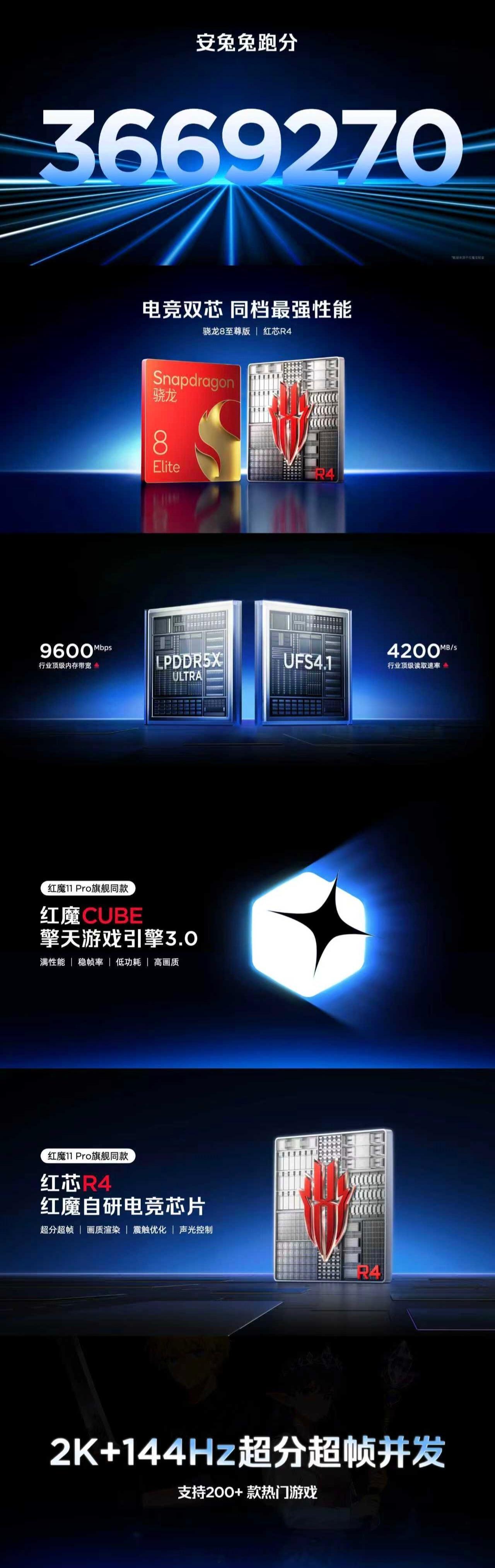 红魔11Air电竞双芯拉满!搭载骁龙8至尊版+红芯R4,安兔兔跑分3669270分,搭配CUBE擎天游戏引擎3.0稳帧低耗,2K+144Hz超分超帧适配200+热门游戏