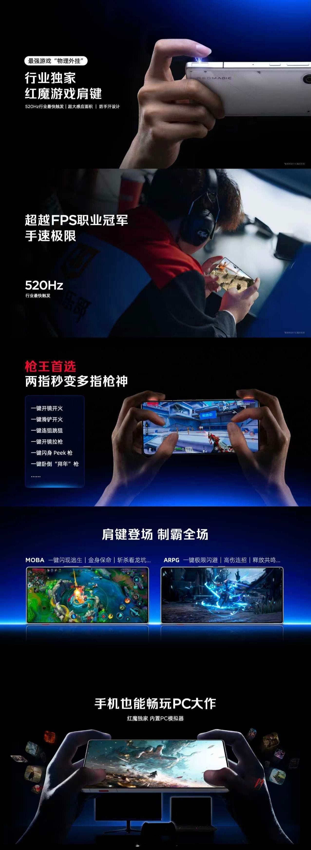 红魔11Air搭载行业独家红魔游戏肩键,520Hz最快触发+超大感应面积+防手汗设计。内置PC模拟器,用手机也能畅玩PC大作。
