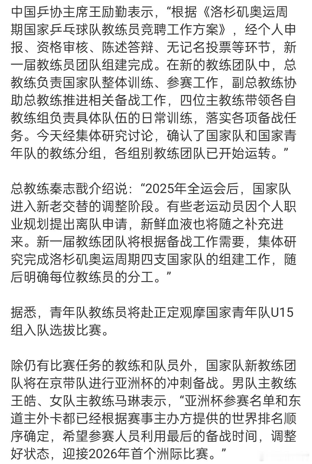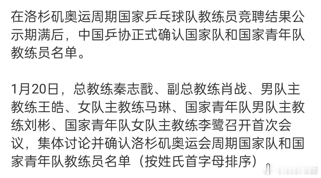 中国乒协确认国家队教练员名单根据中国乒协2026年1月20日发布的消息,洛杉矶奥运周期国家乒乓球队教练员名单已正式确认,具体如下:国家队教练员名单· 总教练:秦志戬· 副总教练:肖战· 国家队男队主教练:王皓· 国家队女队主教练:马琳· 国家青年队男队主教练:刘彬· 国家青年队女队主教练:李鹭各队教练员团队· 国家男一队:主教练王皓,教练员刘恒、刘志强、孙逊、王建军、吴颢、徐辉· 国家女一队:主教练马琳,教练员李大成、马俊峰、邱贻可、任浩、于子洋、郑长弓· 国家青年男队:主教练刘彬,教练员李振山、申超、王雪松、赵渤际· 国家青年女队:主教练李鹭,教练员杜鹏、黄海城、金凤宇(女)、刘曦(女)新一届教练团队将负责国家队和国家青年队的训练与备战工作,目标是冲击洛杉矶奥运会佳绩。v观体育