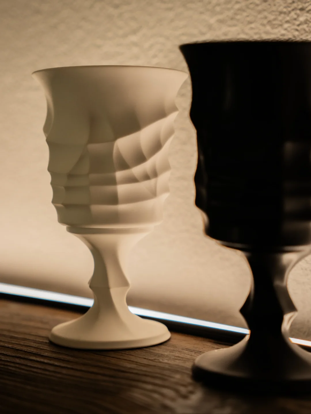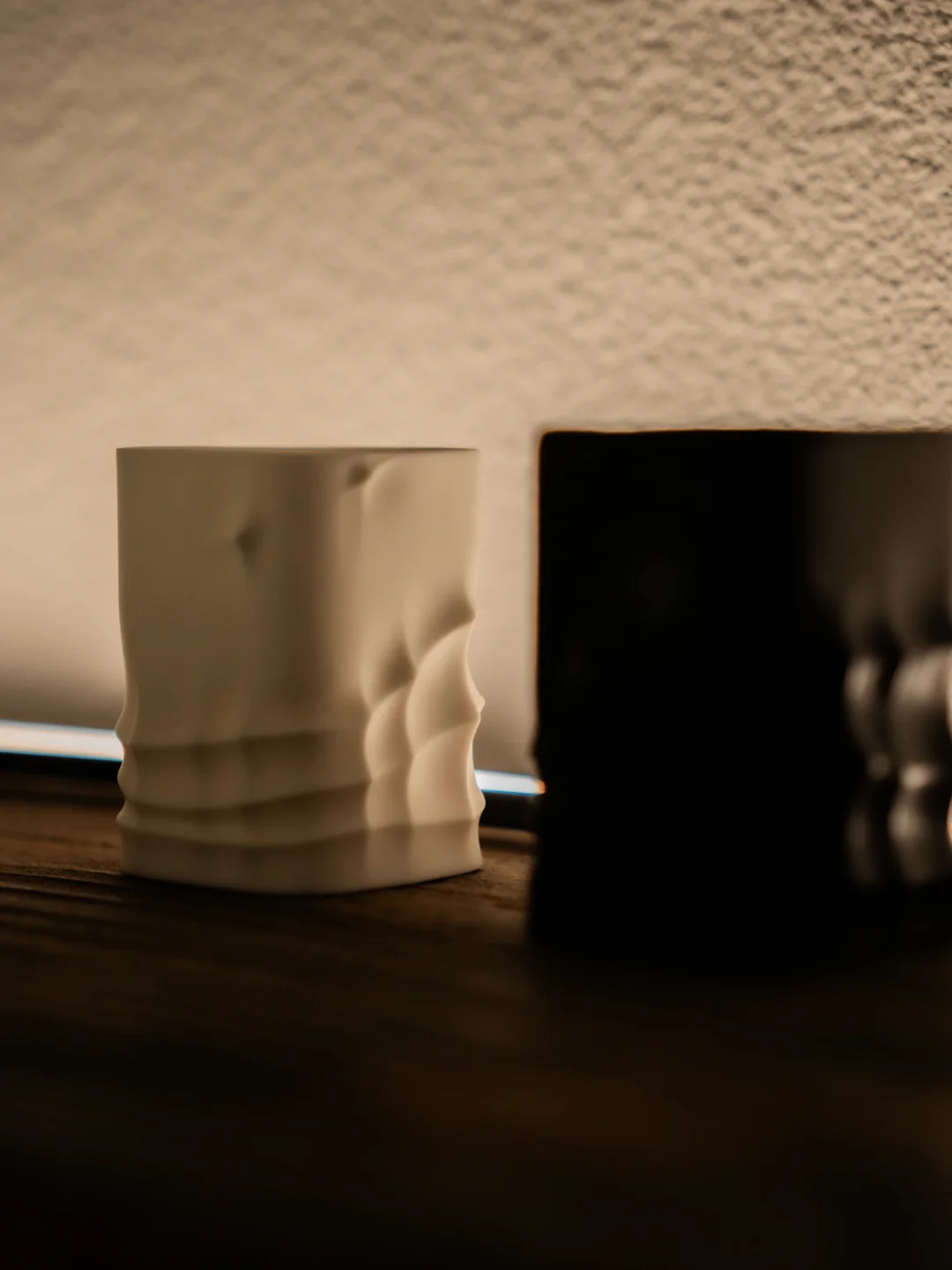 白瓷的通透里,包裹着 “空” 的松弛;黑陶的厚重里,藏着 “实” 的沉静。杯身的褶皱肌理,是对 “流动” 的封装;黑白的极致对比,是对 “平衡” 的诠释。