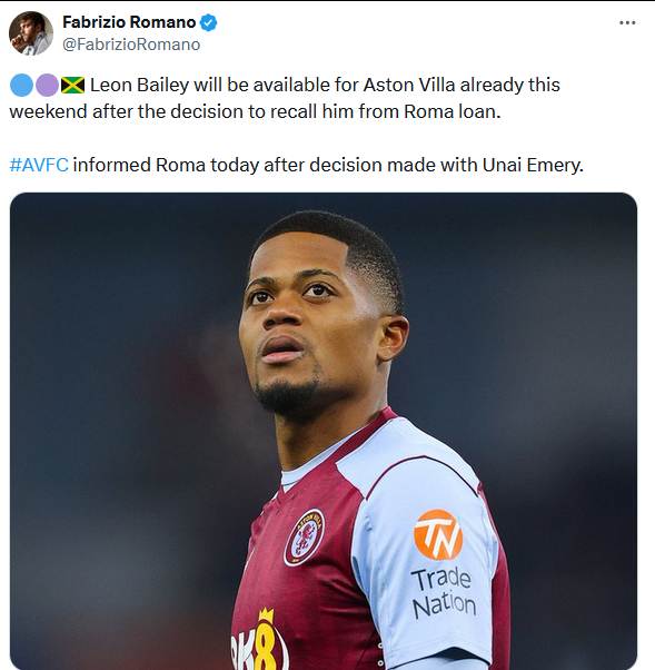 罗马诺:退租贝利的决定是埃梅里做的,他本周末就可以代表维拉出场。买马伦真是神之一手,不仅补了自家短板,维拉锋线少人还把贝利召回去了
