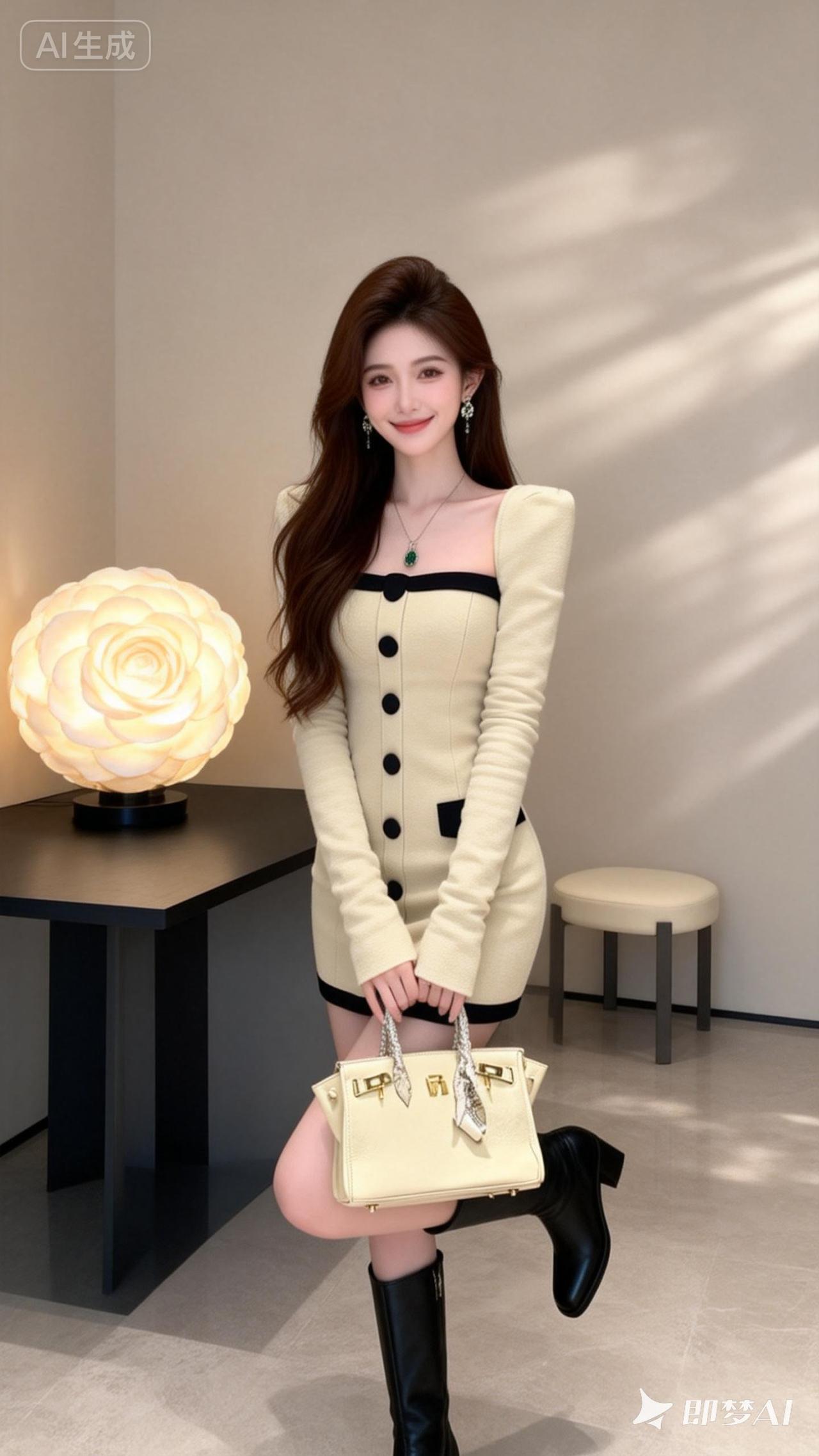 一位25岁绝世美女,棕色自然长发,高颅顶,戴着精致的耳饰和项链,脚上穿一双3厘米黑色气质长靴,保持图中衣服颜色材质和细节不作任何改变,妆容精致,皮肤白皙,身材纤细,面带温和的微笑。