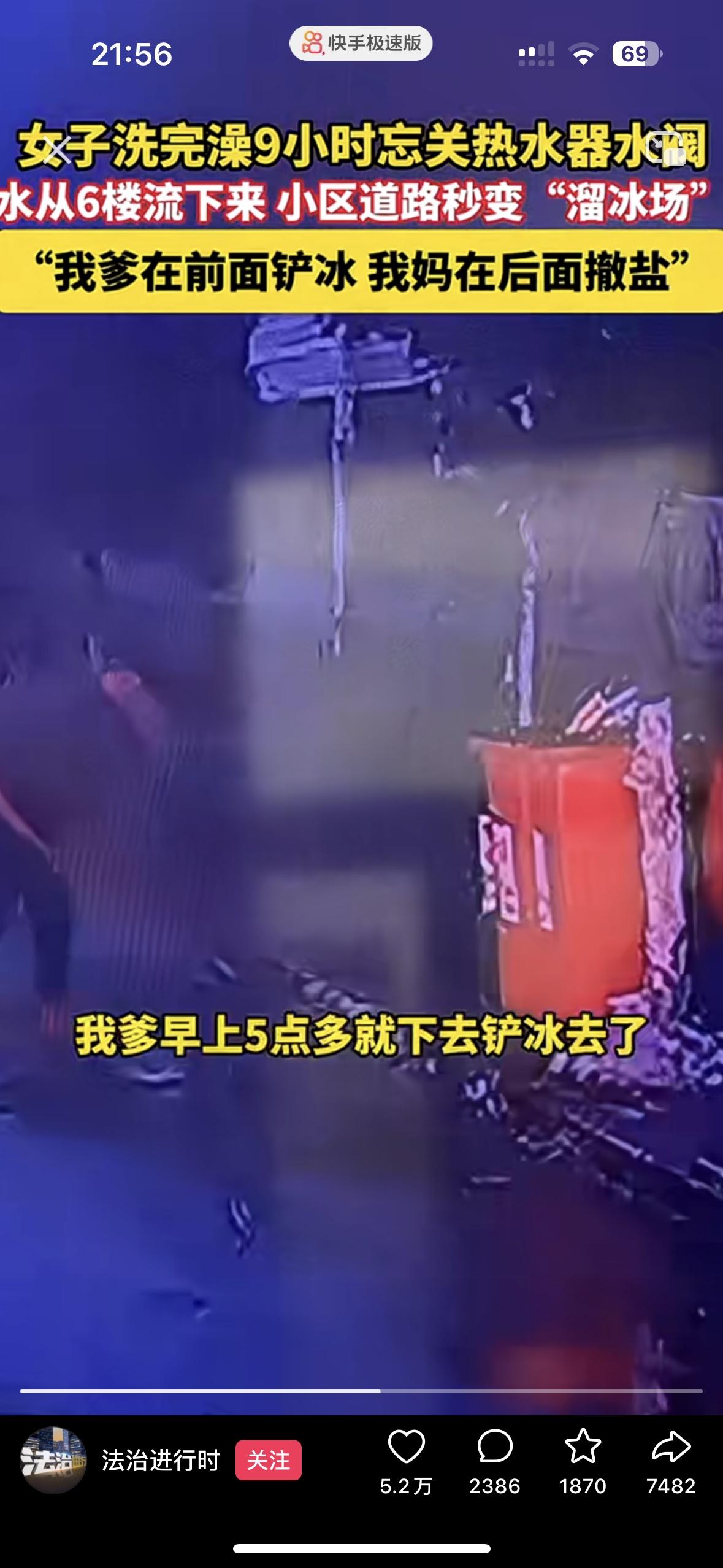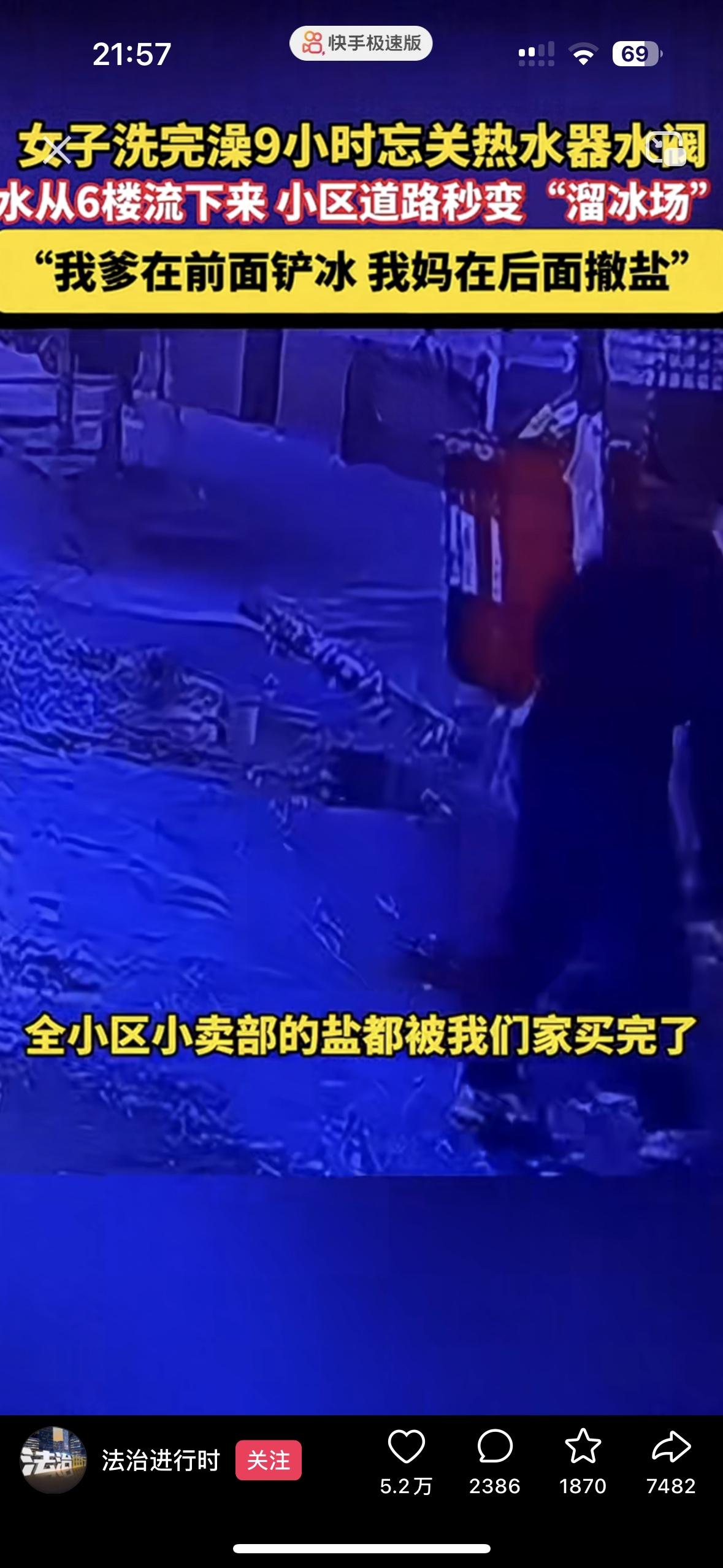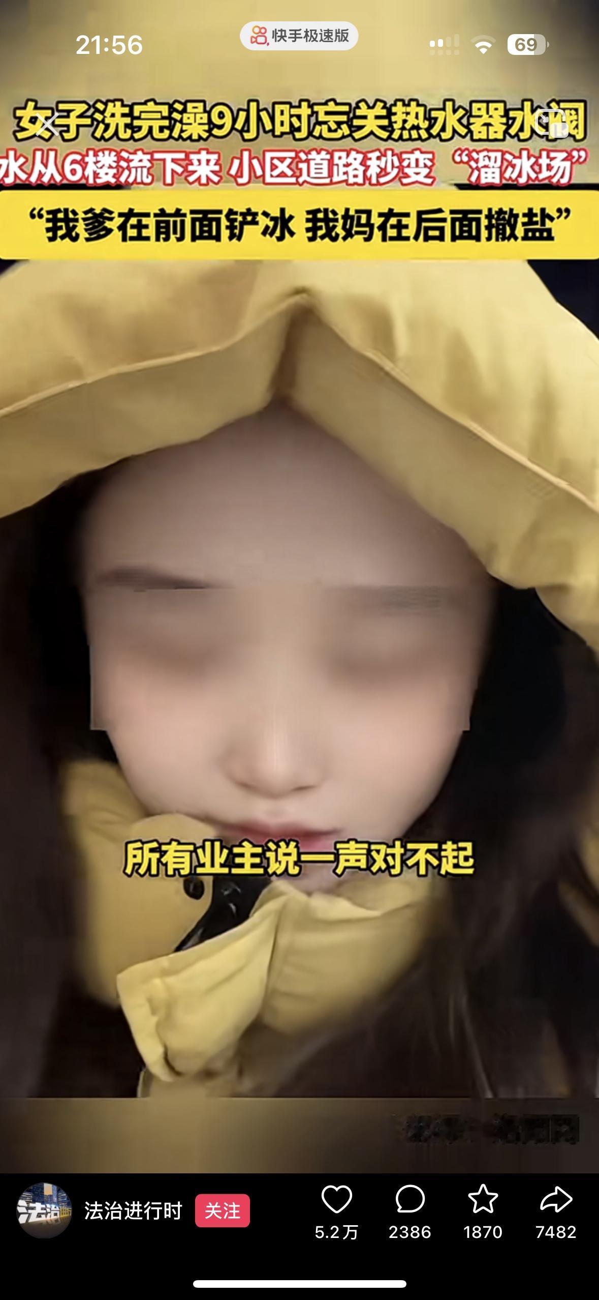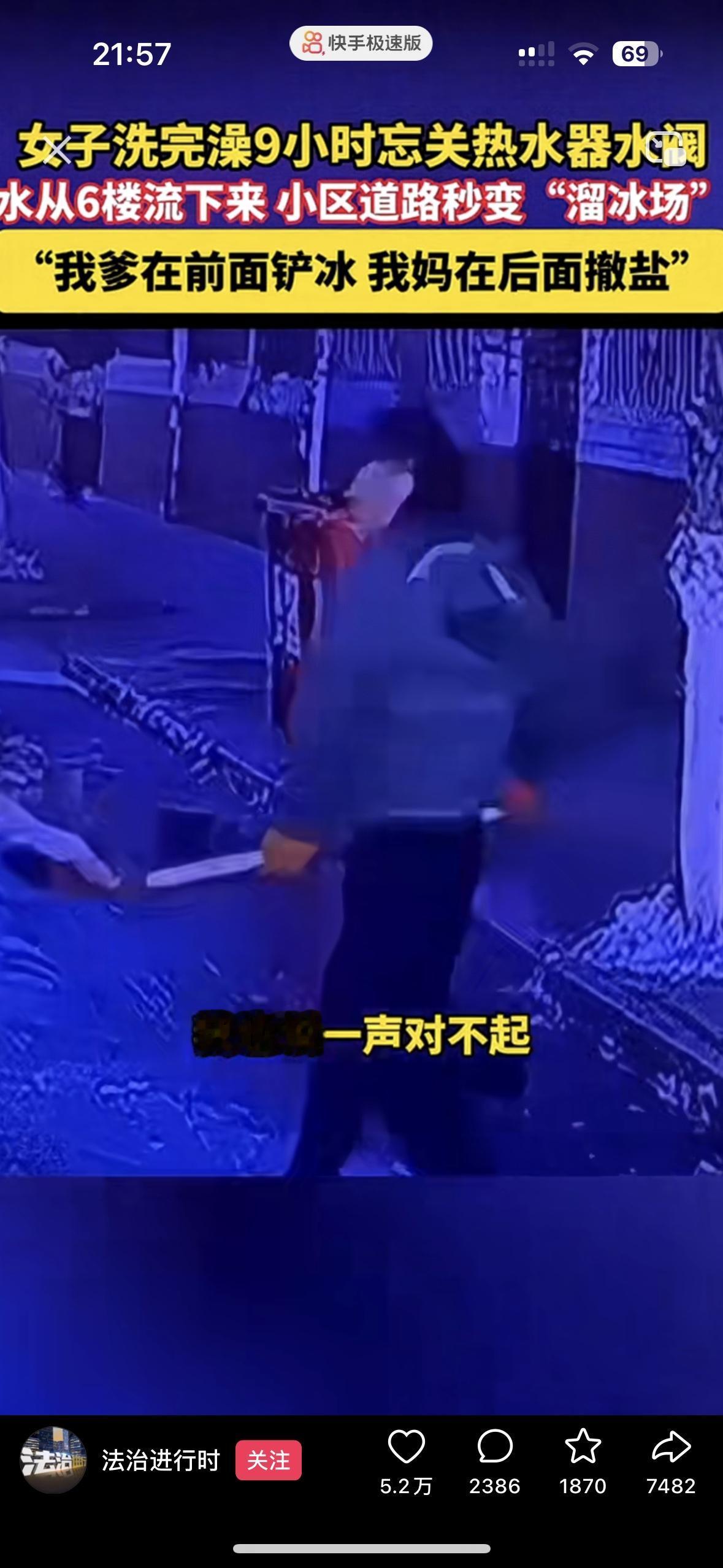 兰州这位姑娘出了名了!不是她长得太好看,也不是她多么有才 实在是她让人感到又好气又好笑!洗完澡随手一放,忘记关太阳能的水阀,这热水哗哗的流了9个多小时!从她们家6楼一路流淌到小区的路上!冬天这么冷直接冻成了冰,好好的路面直接变成了溜冰场 可这位姑娘又特别实在,她爸凌晨5点起床去楼下铲冰,妈妈就在后面撒盐!一家子人出动,还把小区超市的盐都买光了!不仅如此还给大家道歉,为她的原因导致结冰道歉,还有大家如果想买盐买不到也道歉!让人生不起气来,多么可爱又粗心的小姑娘
