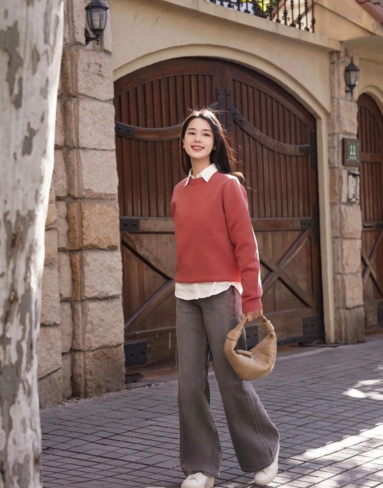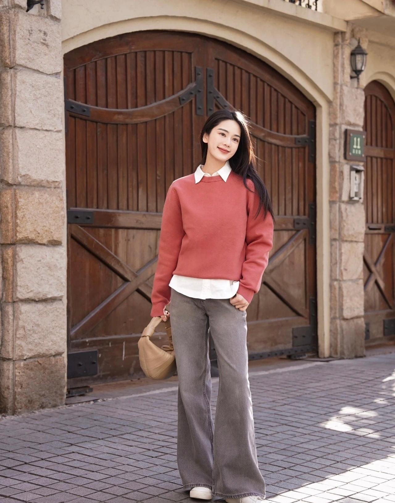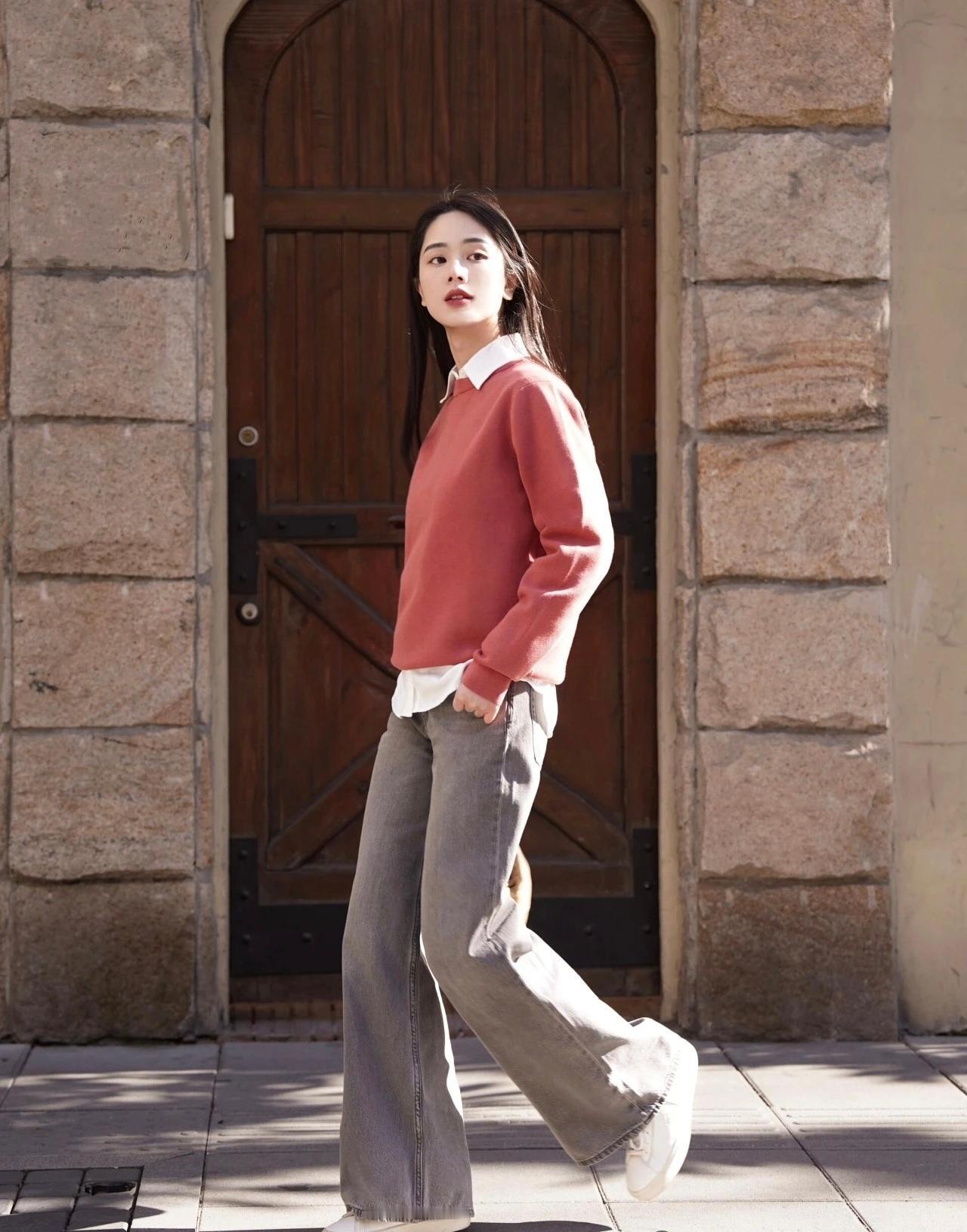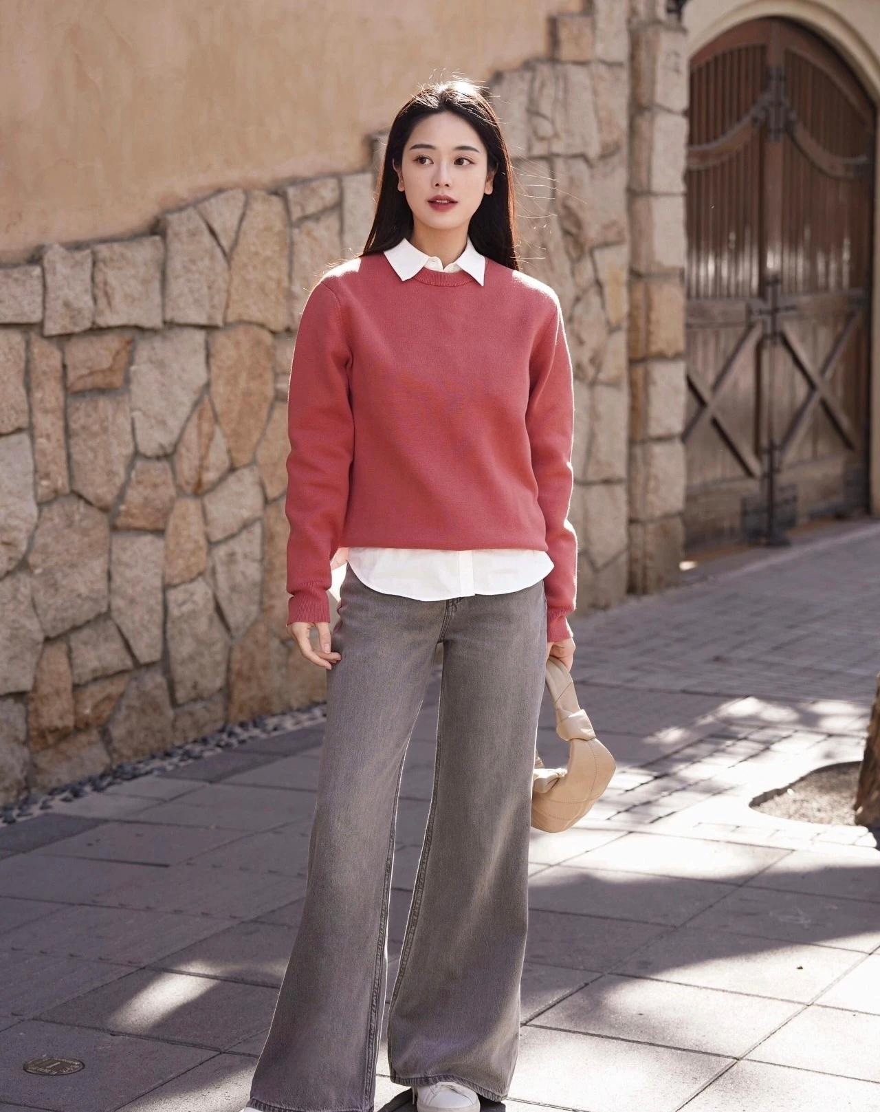 牛仔裤穿搭风格/上身白衬衫红毛衣,下身牛仔裤