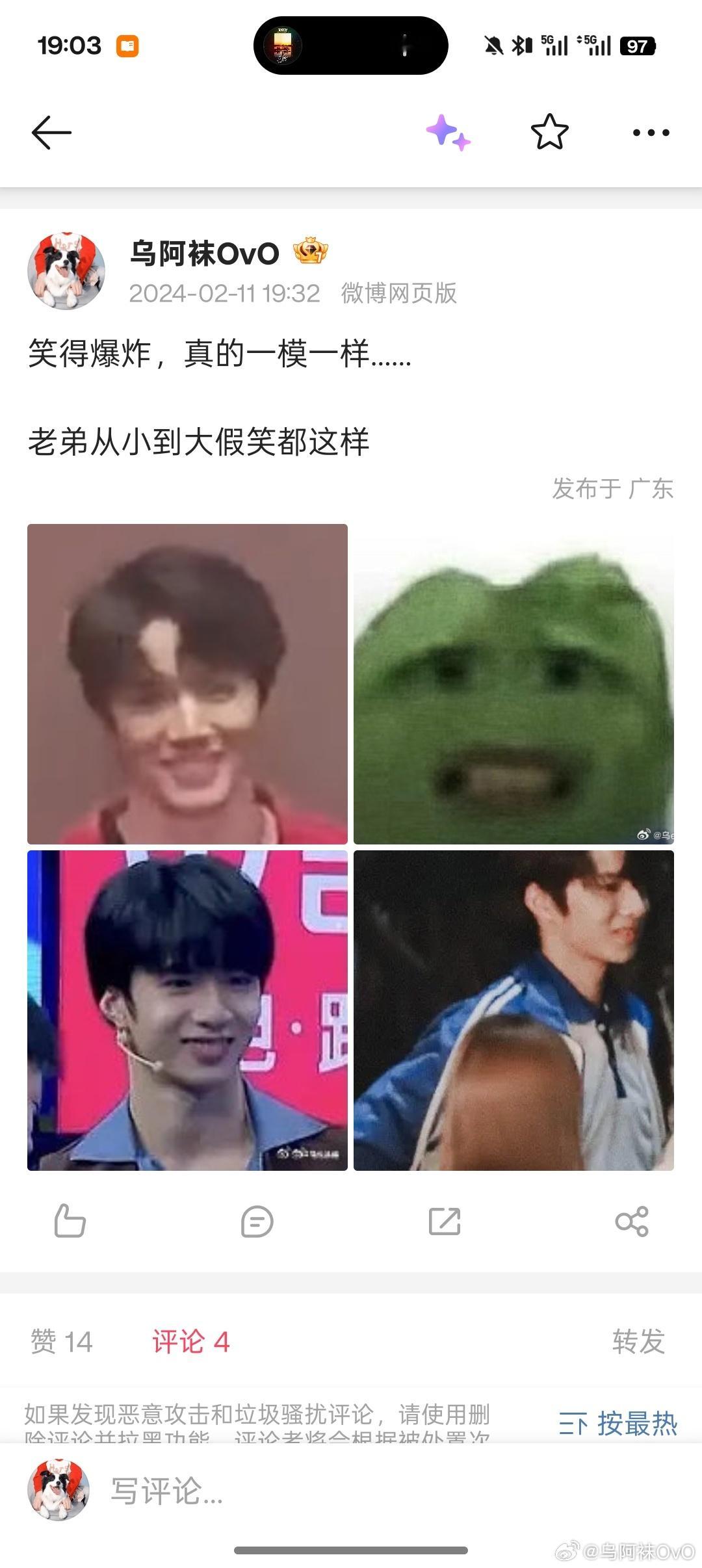 最新物料我觉得最搞笑的就是36撕纸那段3号参赛选手家属的反应 看多少遍都要笑 完全诠释月螺看这期物料如何装松弛 非要嘴见在那儿说不恐怖呀刺激老婆(因为他觉得和t5t玩这些咋可能输 他自己能赢就觉得老婆也能) 气得他老婆心一横把纸撕的只有一个角儿这个看戏的立马笑不出来了 没一会儿听见大家起哄被吓得心率狂飙的老婆表情更是精彩 又露出了p5这个经典的笑比哭还难看的表情(对比了一下还附加了挑眉) 我真的不行了(p6这个古早战神是初版 后面升级了能露牙了)我就说这个表情怎么那么眼熟的。。。我看了十几遍总算想起来原来是假笑男孩重出江湖了 这种嘴巴在前面跑脑子在后面追 一天不惹老婆浑身难受 占有欲超强的小心眼儿子男就这样回回给大家看装松弛翻车的乐子