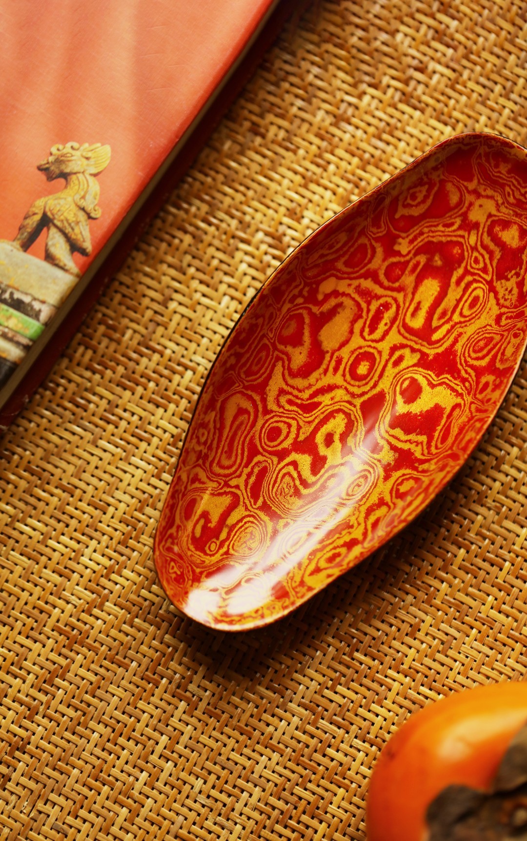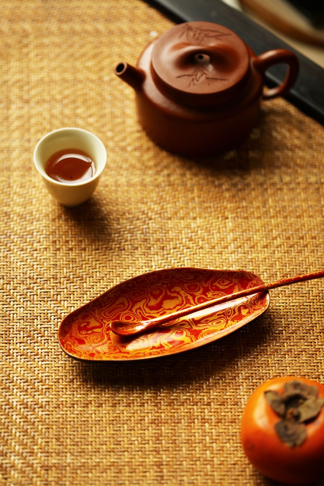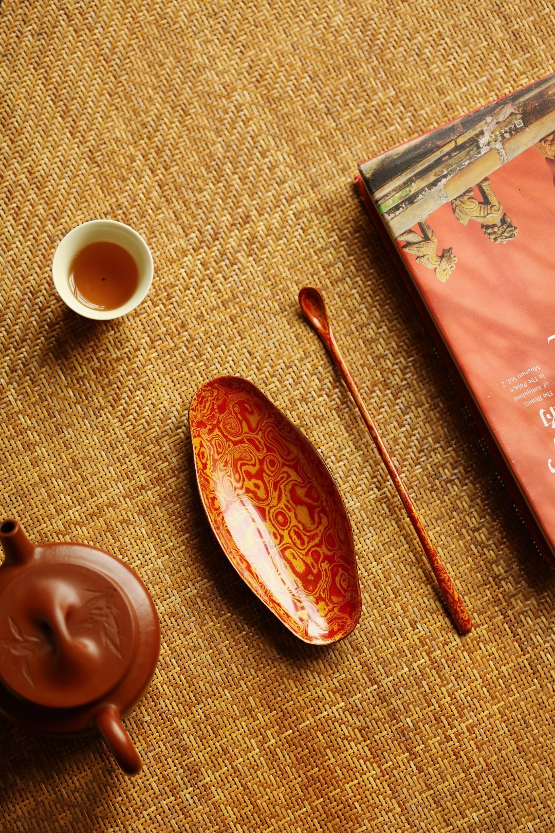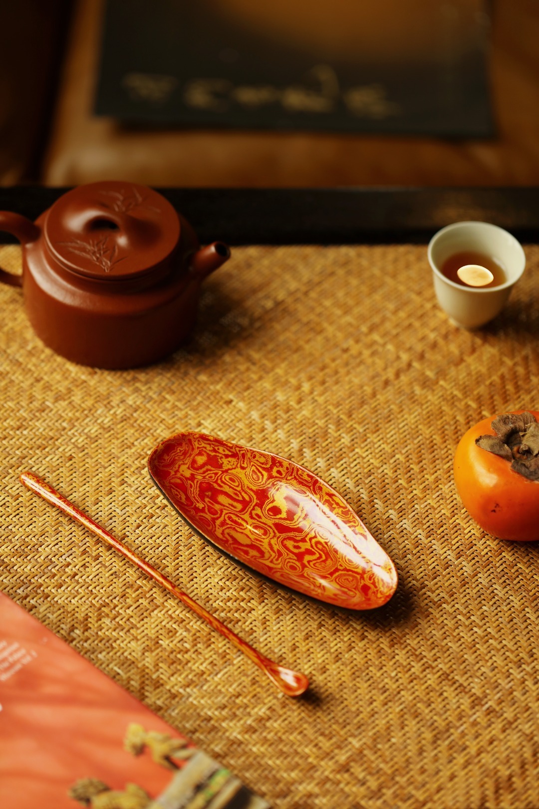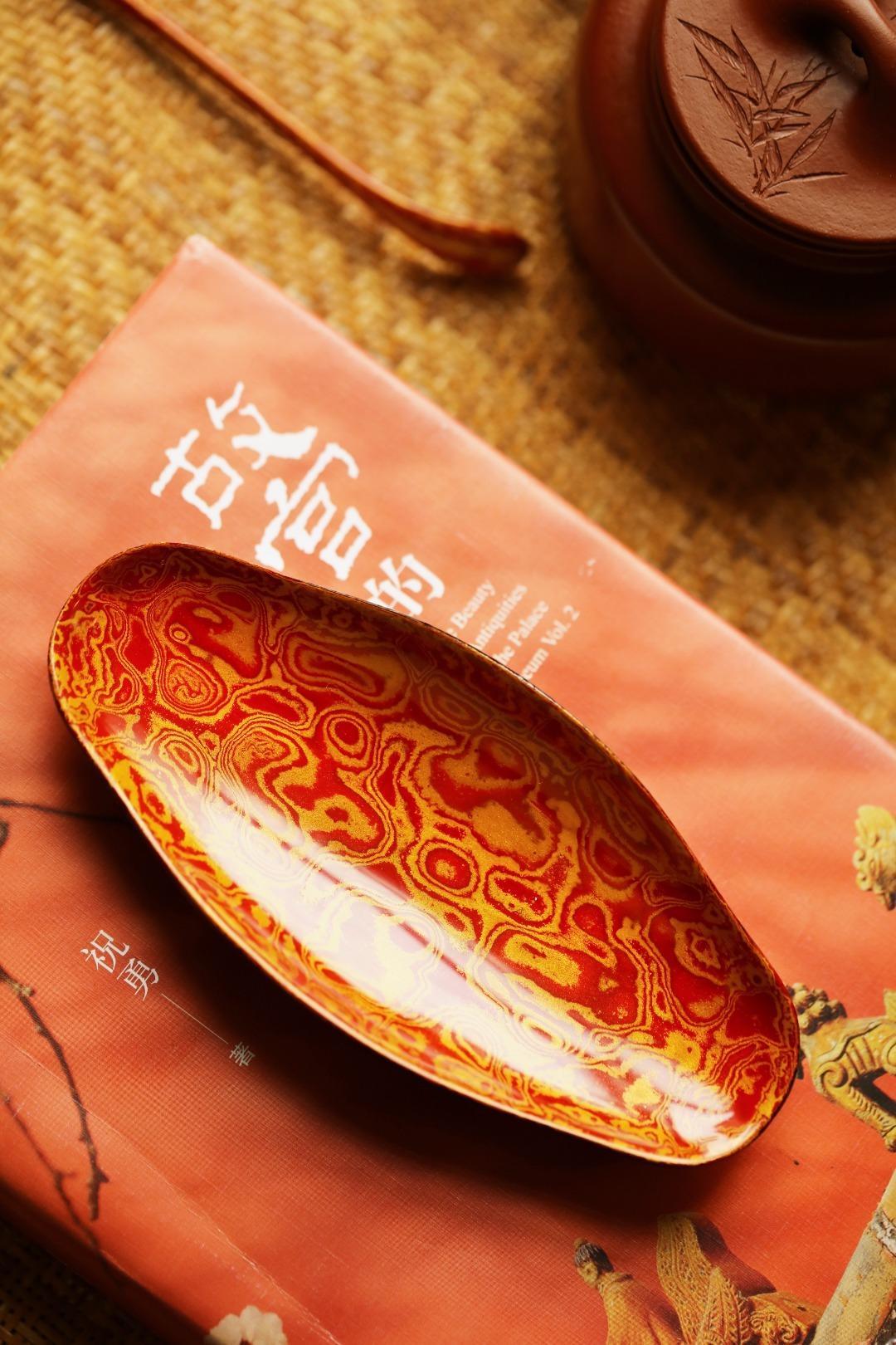 大漆 | 红金茶则非遗工艺,手作精品,逐层髹漆,反复推光打磨,触手温润细腻。入茶席之间,斑斓多彩,辅以茶事,百观不厌。茶则:13.9*6.3*1.6cm茶勺:长20cm 大漆 | 红金茶则