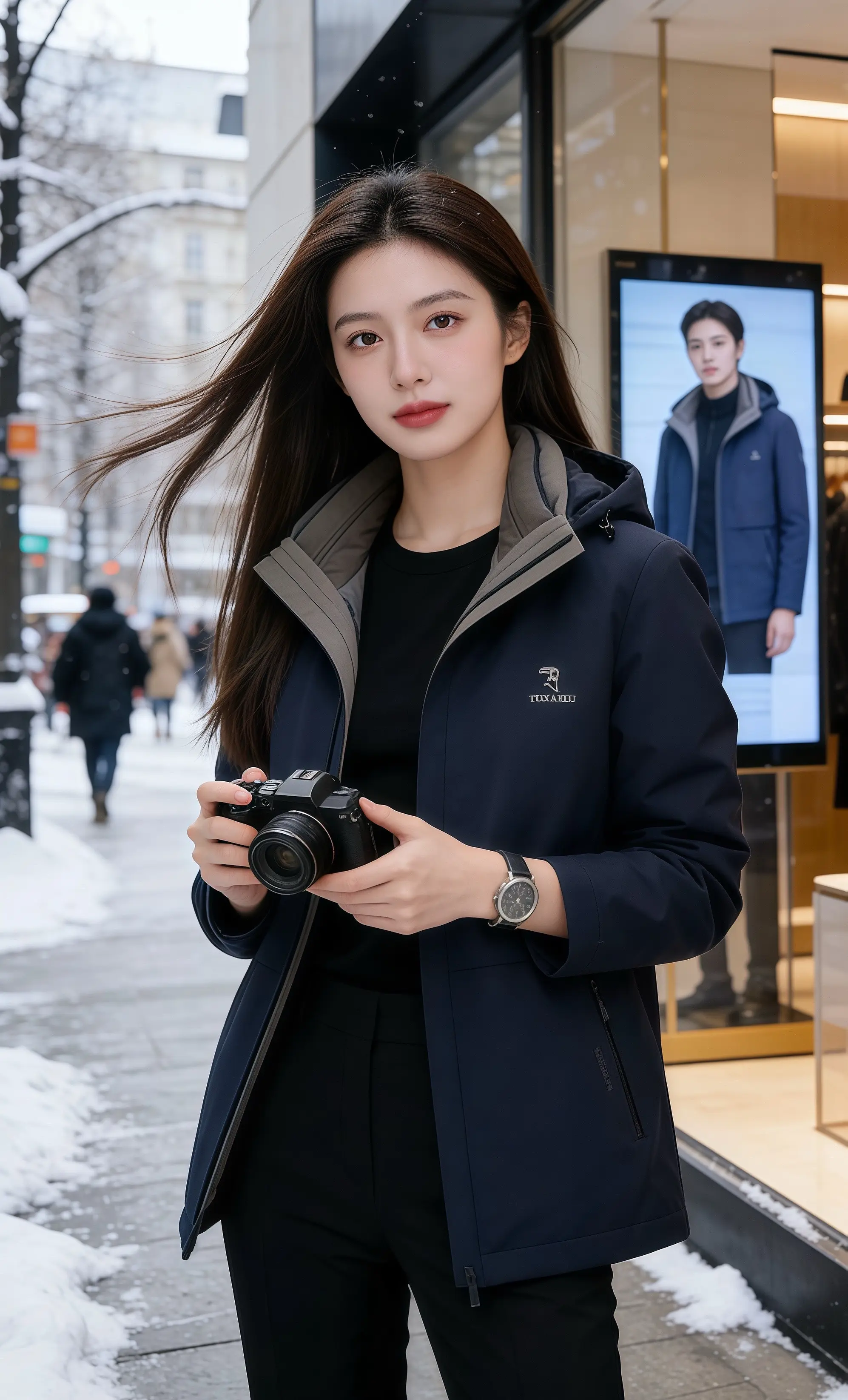 她穿的黑色连帽外套,廓形衬得身形舒展又利落,撞色领口添了几分层次质感;内搭黑高领衫贴合脖颈却不局促,腕表的点缀让整体多了几分精致,这般穿扮,像冬日里的热可可,沉稳中藏着温煦的格调。