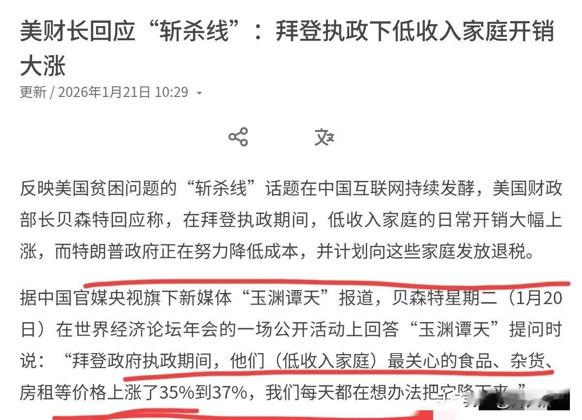 贝森特出来回应了!对于反映美国贫困问题的“斩杀线”问题,1月20日,美国财长贝森特对此表示,在拜登执政期间,低收入家庭的日常开销大幅上涨,而特朗普政府正在努力降低成本,并计划向这些家庭发放退税。如果你回顾特朗普总统的第一任期,会发现时薪工人生活条件比管理层更好。我相信你们所说的家庭,将会收到一笔可观的退税。 拜登政府执政期间,低收入家庭最关心的食品、杂货、房租等价格上涨了35%到37%,我们每天都在想办法把它降下来。 评几句: “斩杀线”概念走红,折射美国民生与发展的双重困局 “斩杀线”概念的流行,标志着美国民众对“美国梦”的普遍反思。从ALICE人群到“斩杀线”,这些新概念的出现本身就说明,传统贫困指标已经无法精准描述当代美国的社会现实。有相关机构公开调研显示,当相当一部分家庭连基本生活都难以维持时,我们看到的不仅是一个突出的社会问题,更是其特定经济社会发展模式暴露出的深层系统性困境。 贝森特的相关表态或许能暂时获得部分选民认同,但终究无法解决根本问题。美国当下的民生难题,并非某一政党的执政责任,而是特定经济社会发展模式长期积累下的必然结果。从里根时代的“涓滴经济学”到今天的“斩杀线”现象,美国用40年时间证明了一个道理:资本的逐利性若缺乏有效规制,容易引发系列社会问题,并不会因治理方式的调整而自发收敛。 在这个意义上,“斩杀线”不仅是一个经济概念,更是一个具有象征意义的社会隐喻——它标志着这种特定经济社会发展模式,正面临着难以回避的现实挑战。