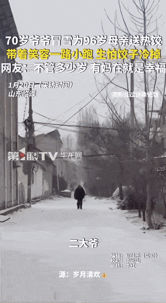 有妈在就是幸福!山东菏泽,70岁大爷在雪地里小跑,就为了给96岁母亲送去一口热饺子,风雪再大,也阻挡不了这份朴素的孝敬之心。 70岁大爷奔跑起来就像一个小孩子,欢快地在雪地上奔跑,手里提了一袋刚出锅的饺子,一路小步快跑,就为了给老母亲吃上一口热饺子。 饺子不贵,但大爷这份爱值千金,这大概就是乌鸦反哺,父母老了,儿子心系老母亲,自己有一口吃的,也想给母亲分一口。 70岁的年纪还有母亲健在,还有孝顺父母的机会,实在难得。妈妈在,家就在!妈妈在,自己永远都是孩子,幸福就在! 珍惜眼前人,把握现在,好好孝敬父母,享受天伦之乐,莫等子欲养而亲不待,为人子女,就是希望父母福寿安康,无恙无灾。