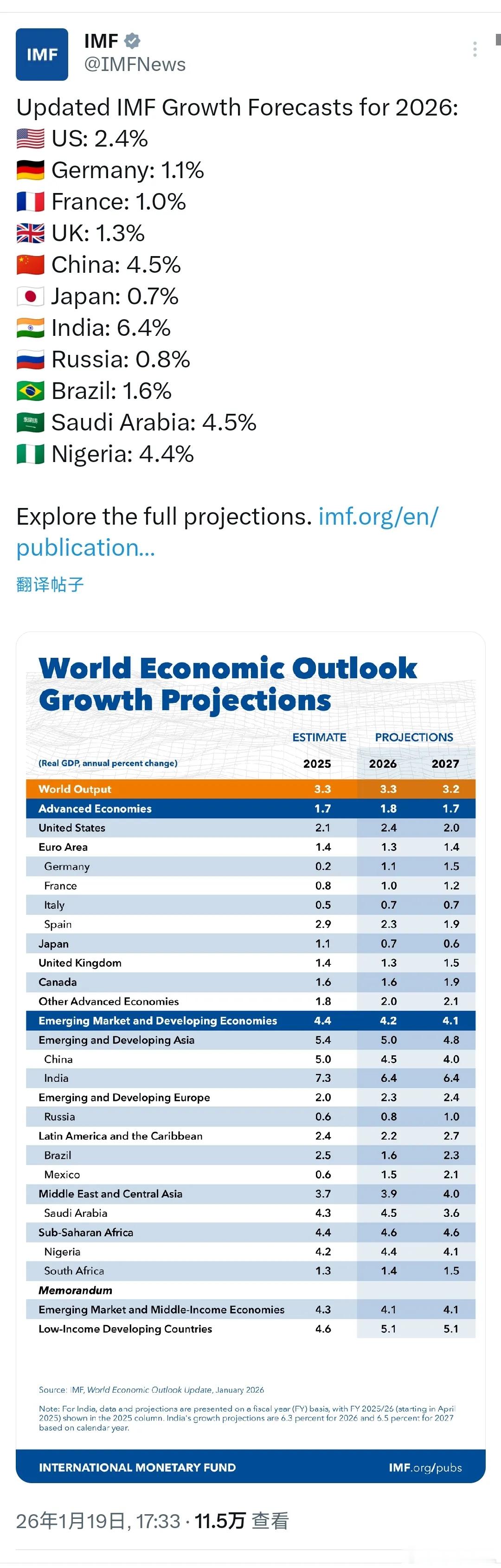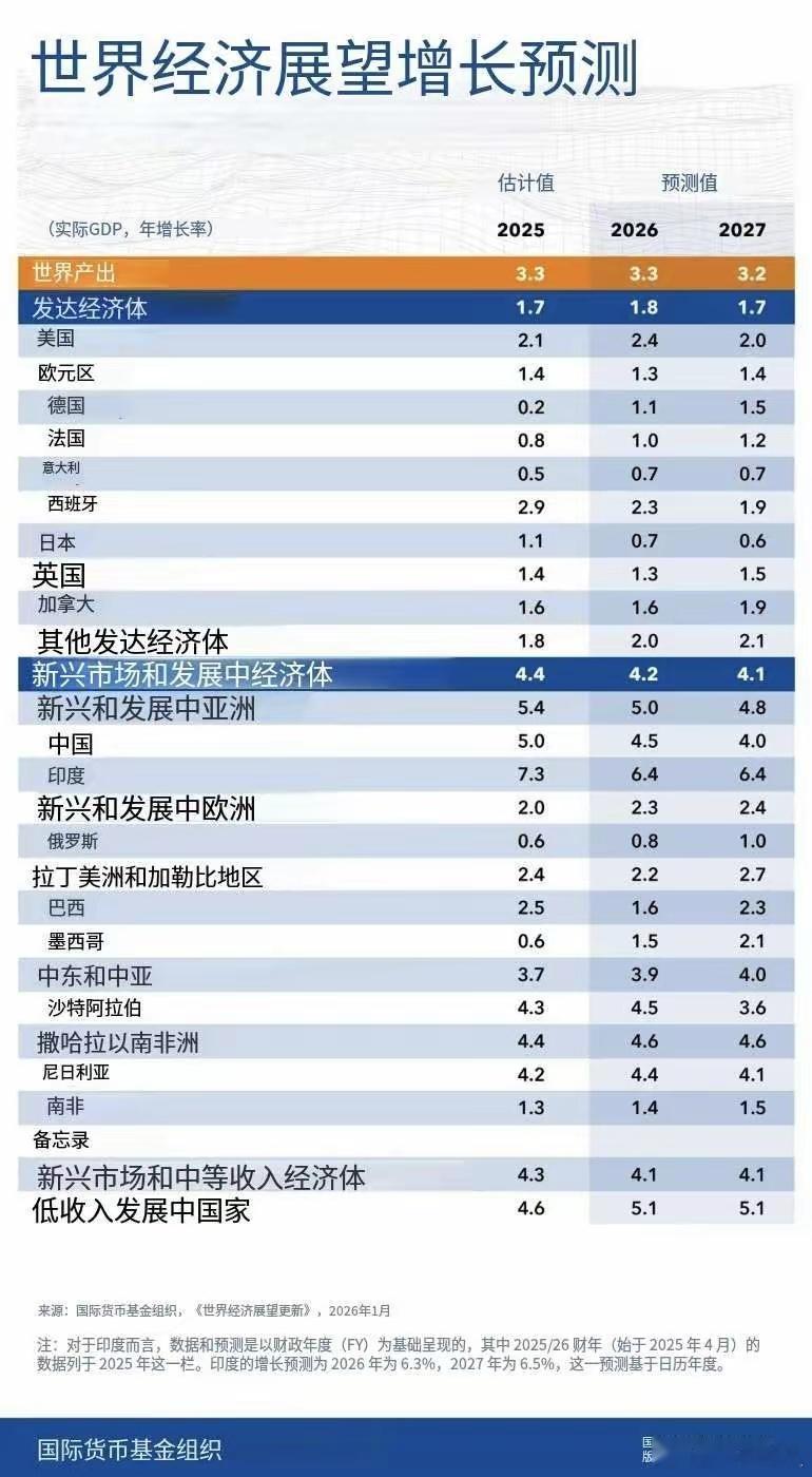 国际货币基金组织更新了2026年经济增长预测:🇺🇸美国:2.4%🇩🇪德国:1.1%🇫🇷法国:1.0%🇬🇧英国:1.3%🇨🇳中国:4.5%🇯🇵日本:0.7%🇮🇳印度:6.4%🇷🇺俄罗斯:0.8%🇧🇷巴西:1.6%🇸🇦沙特阿拉伯:4.5% 🇳🇬尼日利亚:4.4%今年IMF绝对会看走眼,因为他们没有看到人民币深圳大概会带来资金涌入和温和通胀,从而带动内需增长问题。