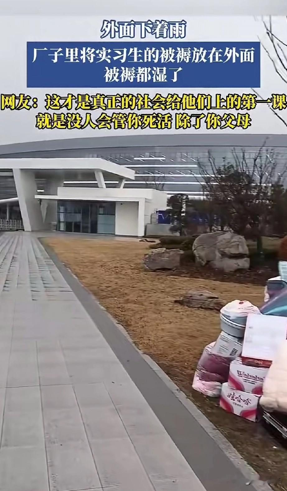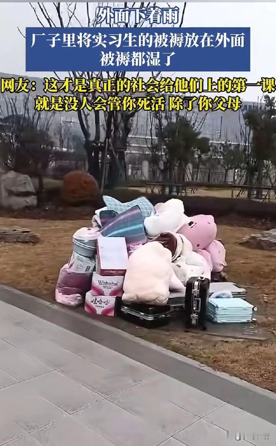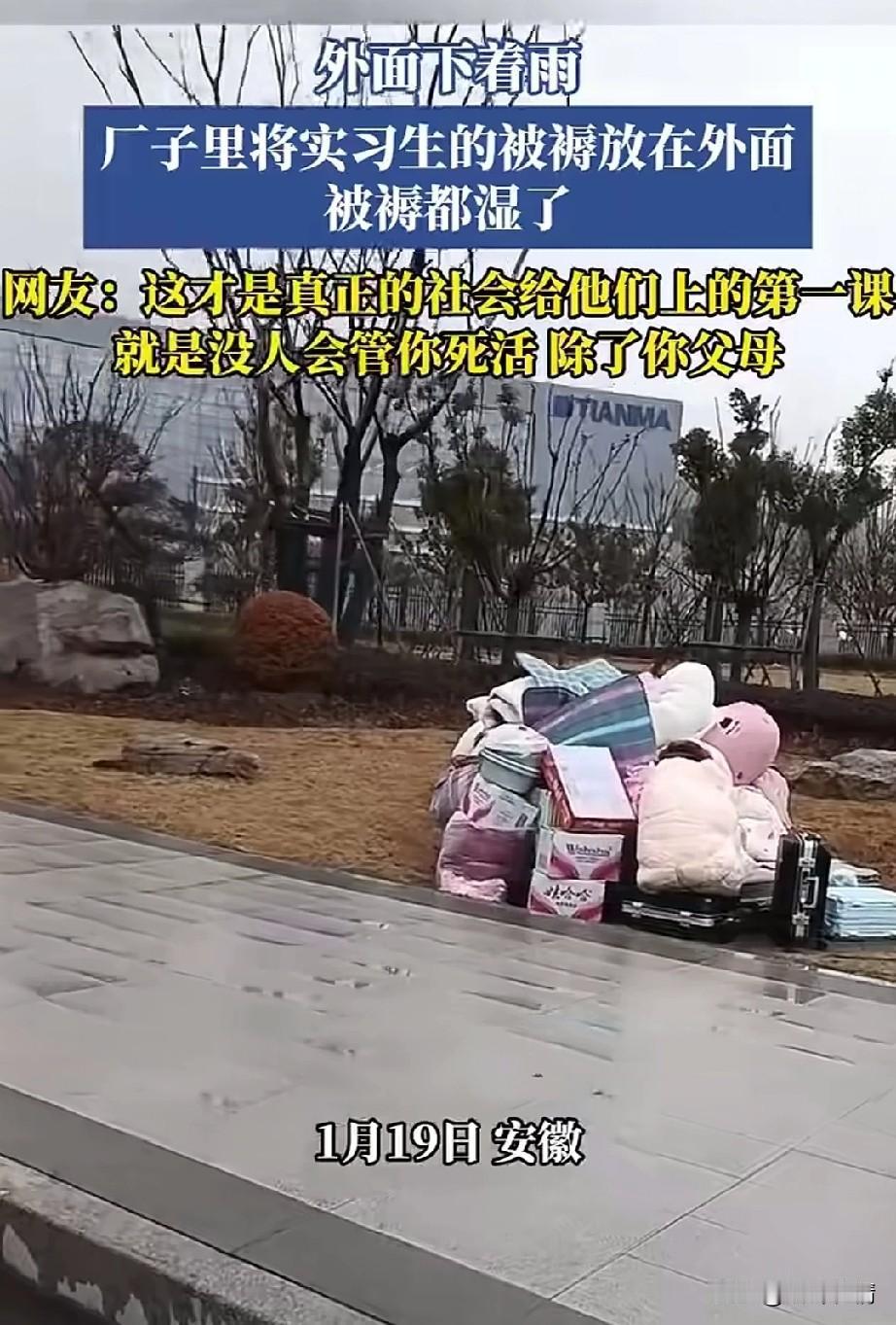 安徽一工厂,将实习生的行李放在外面,下雨了也没有人, 难道大专生不是大学生吗?为什么要这样区别对待?大专生实际上也不想去企业实习, 不都是学校要求去的,不去还不给毕业证,学生拿着1000多实习工资,还要被企业要求感恩,这简直是笑话! 更气人的是直接将他们的行李放在雨中淋湿,他们都是家庭的未来,没想到还没出社会,就让工厂上了一课! 都说现在的年轻人不想进工厂是吃不了苦,说这些话的人都应该进去工厂体验一个月! 你出来之后肯定不会再说了,目前工厂还是老一套,粗暴管理,天天给你灌输服从的思想! 想必这些大学生毕业后肯定不想去工厂,因为已经体验过了工厂的冷暖,不是中国的制造业难以为继,而是中国目前的工厂老板管理思想非常落后! 工厂的工人是人,不是冷冰冰的机器,与其天天想着扣工资,不如想着如何留下员工! 大家说是不是这个理! 安徽 第一批实习生 大专毕业实习 安徽见习生 大专强制实习