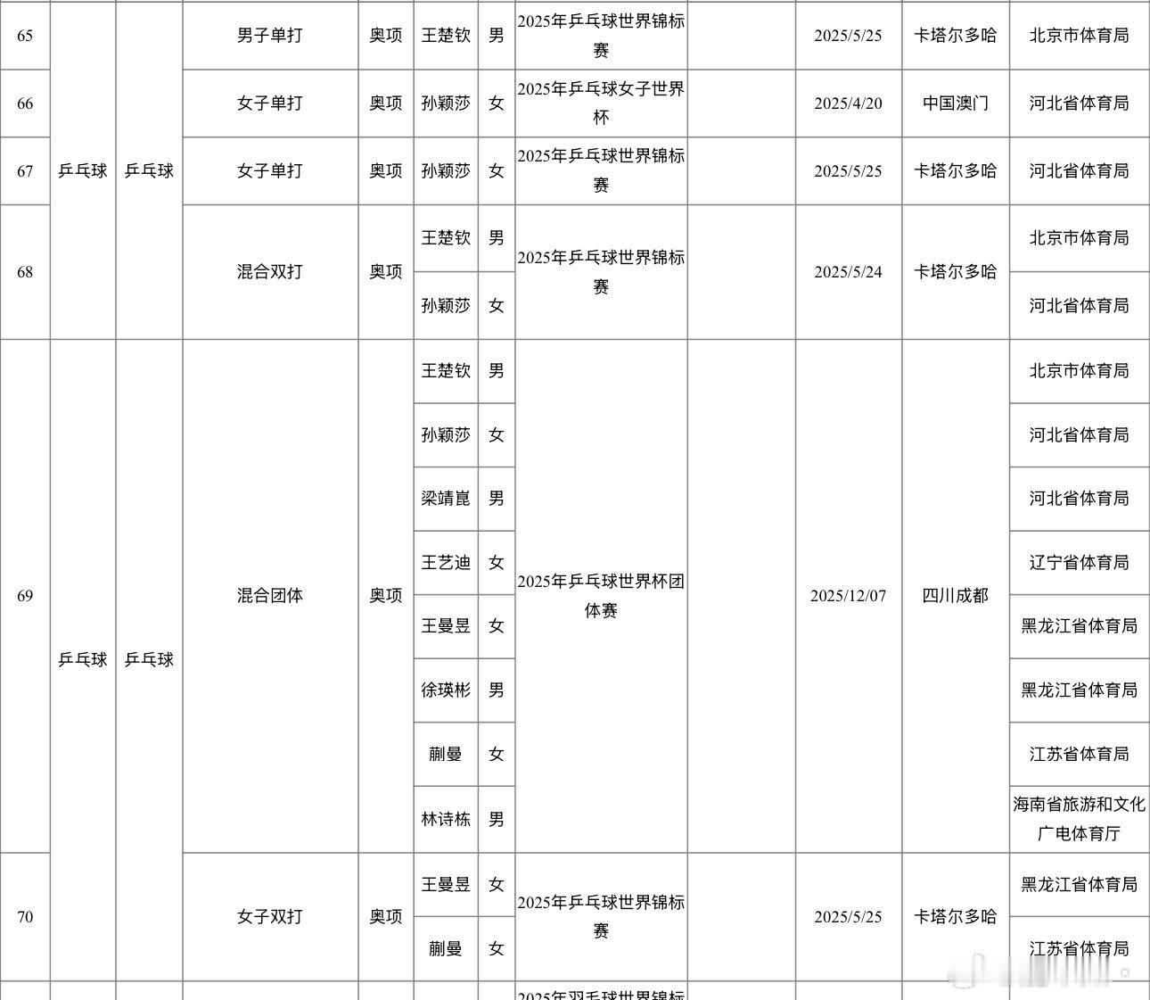 2025年我国运动员获世界冠军统计【乒乓球项目】恭喜孙颖莎选手荣获4个世界冠军,其中2个单打世冠,2025年国乒总共获得6项世界冠军,孙颖莎一人六占四拥有最多冠军,也是拥有最多单打冠军的选手孙颖莎作为世界杯和世锦赛女单卫冕冠军,女乒历史第一且目前唯一世锦双圈金满贯,单打和双打能力都顶尖,在混团赛制也发挥重要作用,孙颖莎这样的运动员就是不可或缺也无可替代的孙颖莎