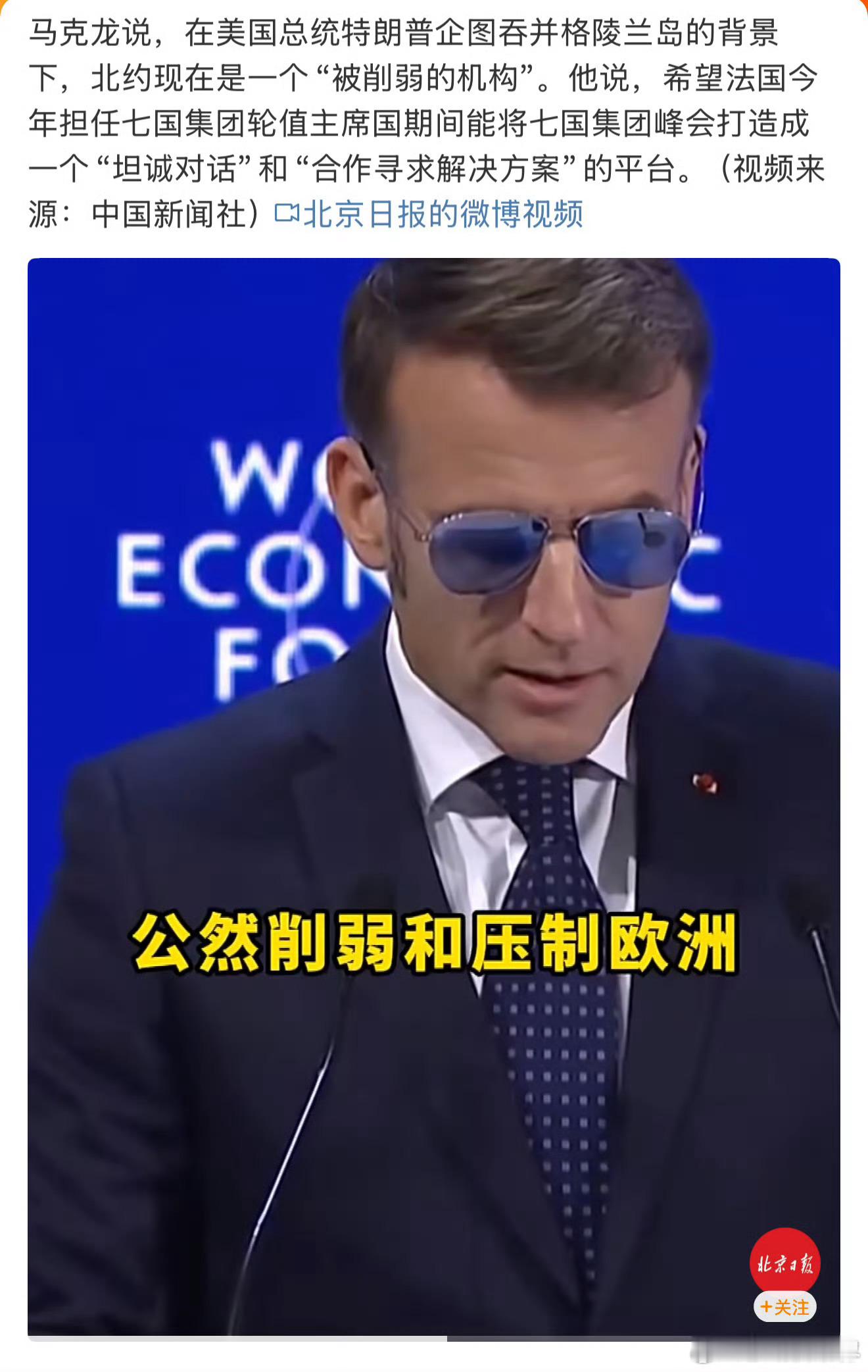 马克龙戴墨镜在达沃斯论坛喊话特朗普马克龙戴的墨镜,在达沃斯论坛上,与特朗普开撕了!实际上还是想找回特朗普公开他的短信的面子,但实际上他的面子已经睡到异地了,所有欧洲的小弟都看清了马克龙的想领导欧洲的想法,但是没这个能力。为什么戴墨镜?媒体猜测是被他老婆家暴了 济宁