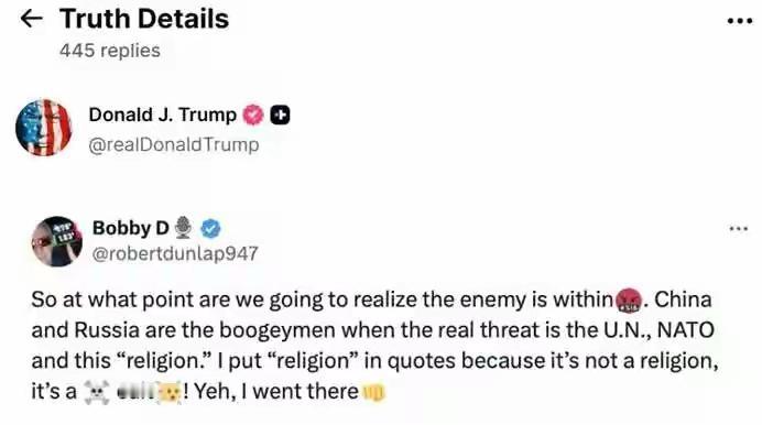 特朗普转帖:威胁并不来自俄罗斯和中国! 这家伙被暗杀过后看明白了,美国现在最大的