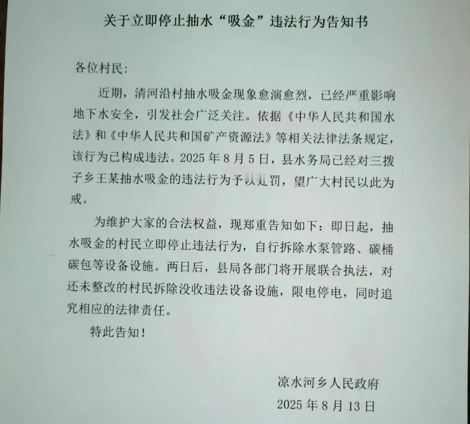 贪心不足蛇吞象!河北一村民抽地下水用,居然捞出了黄金,这可把他高兴坏了,压根没想着上报,转头就在自家院子打深井,连夜抽地下水炼黄金。这还不止,他还把这事告诉了村民,结果不少人都加入其中,一个月用电量超1万度,村里的“大户”一年纯利能超百万! 这村民姓李,平时浇菜都怕多耗一度电,见了金子直接变身 “淘金狂人”。连夜找打井队钻了 120 米深井,比村里老井深三倍,抽水泵一响,觉都不睡守在旁边。 消息没藏住半天就传遍全村,跟往热油里泼了把盐似的。外出打工的年轻人拎着行李就返乡,家家户户院墙里都架起铁桶,钻机声从早到晚没停过。 打井师傅都坐地起价,从每米 100 元涨到 150 元,钻杆磨得发亮还忙不过来。村民们攀比着加深井,张家钻 120 米,李家就硬冲 150 米,生怕少抽一勺含金石。 大家眼里只剩金灿灿的元宝,早把规矩抛到九霄云外。普通农户月用电才 100 度,淘金户单月直接飙到 1 万多度,一年电费近 8 万,却觉得 “一本万利”。 更魔幻的是供电部门,明知用电异常却添了四个变压器,美其名曰 “保障民生”,实则给非法淘金递工具,跳闸成了常态也没人敢断电。 其实这水里的金,根本不是什么天赐宝藏,是早年废弃金矿的 “毒遗留”。当年金矿用氰化物堆浸提金,废液没处理好渗进地下,才造出这含毒的 “黄金水”。 中国地质科学院苏德辰研究员说得直白,这就是捡污染漏子,活性炭只能吸附 70% 的金,剩下的重金属和氰化物全随尾水排进河道。 别小看这尾水,危害比砒霜还隐蔽。检测显示下游河道砷含量超标 1.8 倍,氰化物风险超安全值 17 倍多,长期接触能损伤神经系统,还会在人体累积。 村里的生态很快遭了殃,52 户村民的浅井彻底干涸,压水井抽半天只剩泥沙,大家只能每天跑 3 公里外拉水,浇菜都得省着用。 地面也开始闹脾气,三处地方沉降超 12 厘米,不少房屋墙体裂出指宽缝隙,夜里能听见房子 “咔咔” 响,老人吓得整夜不敢合眼。 可淘金户们被利润冲昏了头,村东头老王花五万买 “专业设备”,请外乡人当顾问,年纯利超百万,成了大家追捧的 “淘金标杆”。 小散户也不甘示弱,有的借钱打井,有的合伙买活性炭,甚至有人抵押耕地凑本钱,满脑子都是 “暴富梦”,压根没想过风险。 村里的氛围也变了味,北岸淘金户紧闭大门防同行偷学,南岸缺水村民骂骂咧咧,好好的村庄被贪心搅得鸡飞狗跳,邻里情分全抛脑后。 他们不知道,自己踩的可不是发财路,是法律和生态的双重红线。黄金和地下水都是国家的,无证开采就是非法采矿,50 克就够追究刑责。 之前陕西潼关就有类似案例,村民非法炼金获利 33 万,最后不仅钱被追缴,还赔了 103 万生态修复费,主犯获刑数年,得不偿失。 青龙县水务局也曾罚款 2.3 万,乡政府发过禁令,可这点惩罚在百万利润面前,连挠痒痒都算不上,村民白天歇着夜里干,跟执法队打游击。 执法队也有难处,就三个人管全村,打井不用备案,炼金点藏在院子里,根本管不过来,禁令最后成了贴在墙上的 “稻草人”。 更傻的是大家算不清长远账,老王一年赚百万,可生态修复费就得数百万,等污染扩散,赔的钱比赚的多十倍,还得坐牢。 南通就有个炼金户污染土壤,光处置费就花 9 万,损害赔偿金分两年缴,靠失业金过日子,暴富梦碎还背上债务,悔得肠子都青了。 有人说村民无知,可监管漏洞才是帮凶。打井无备案、用电不管控、处罚太轻微,层层失守才让这场闹剧愈演愈烈,不是一句 “贪心” 就能概括。 金价上涨本是市场规律,却成了非法采矿的催化剂。低品位矿产被重新盯上,废弃矿山的污染隐患被激活,监管得跟上节奏才行。 专家早给出了办法,比如甘肃的 “井电双控” 系统,实时监测异常取水,切断用电就断了淘金户的活路,比罚款管用多了。 其实合法上报才是正途,发现矿产上报最高能拿 50 万奖励,稳稳妥妥无风险,比顶着坐牢风险私采靠谱百倍,可没几个人愿意走正路。 这场淘金热终被联合执法按下暂停键,深井被封,设备被查,涉案人员逐个被追责,那些赚来的钱要么追缴,要么用来修复生态。 老王看着被填平的深井,算了笔总账,赚的百万不够交罚款和修复费,还落了个拘留记录,真是竹篮打水一场空,蹲在地上直抽自己耳光。 村里慢慢恢复平静,可干涸的水井、污染的河道、开裂的房屋,这些伤疤没那么容易愈合,子孙后代都得为这场贪心买单。 这事儿从来不是简单的 “村民贪财”,是监管缺位、认知不足和利益诱惑共同酿的苦果。黄金再贵,也换不回绿水青山,更换不来安稳日子。 贪婪就像氰化物,看似能换来黄金,实则会慢慢腐蚀家园和自由。所谓暴富捷径,往往都是通往深渊的歧路,脚踏实地才是真道理。 你觉得该如何堵住监管漏洞,避免类似 “淘金闹剧” 重演?欢迎在评论区留下你的观点。