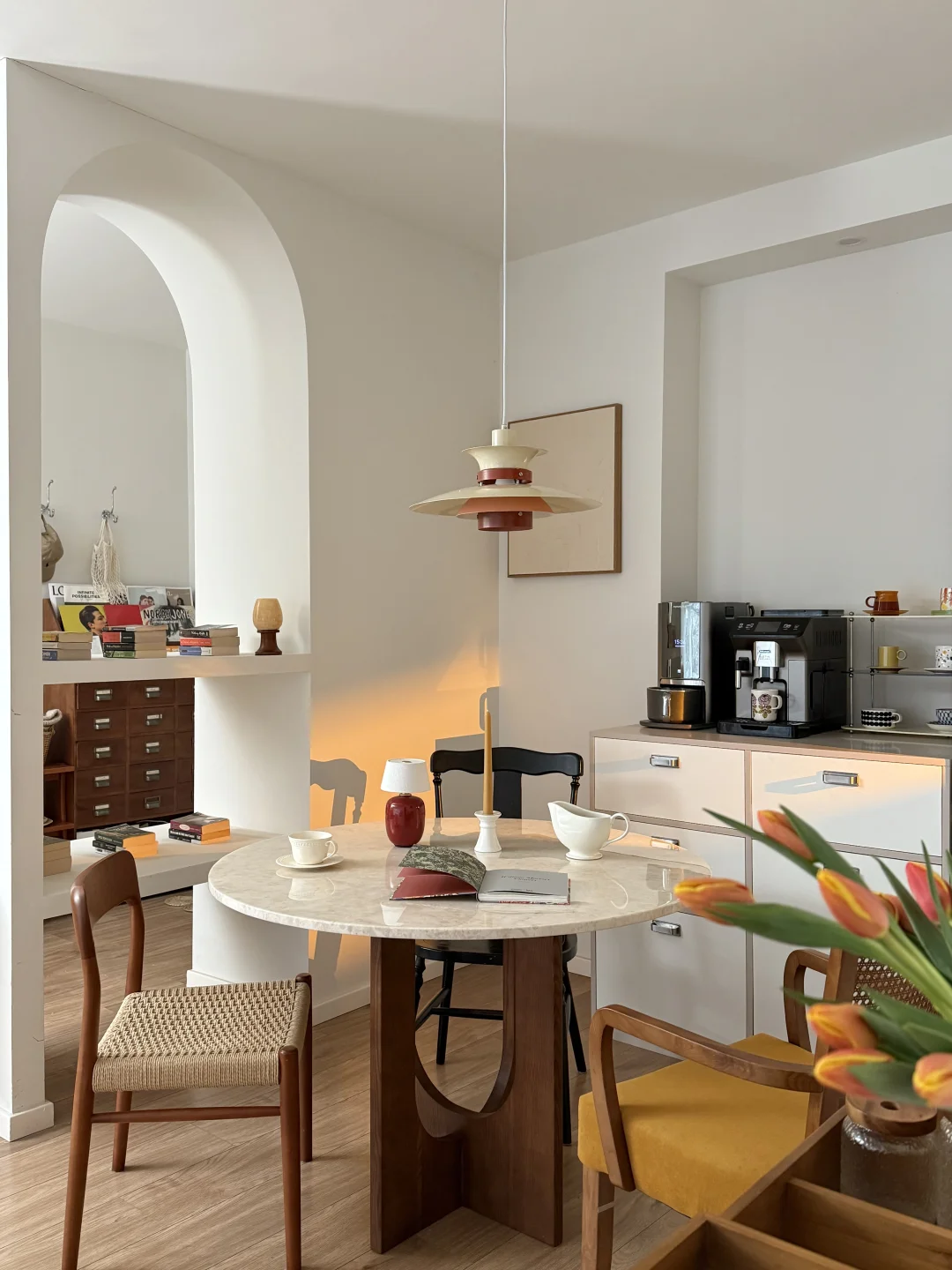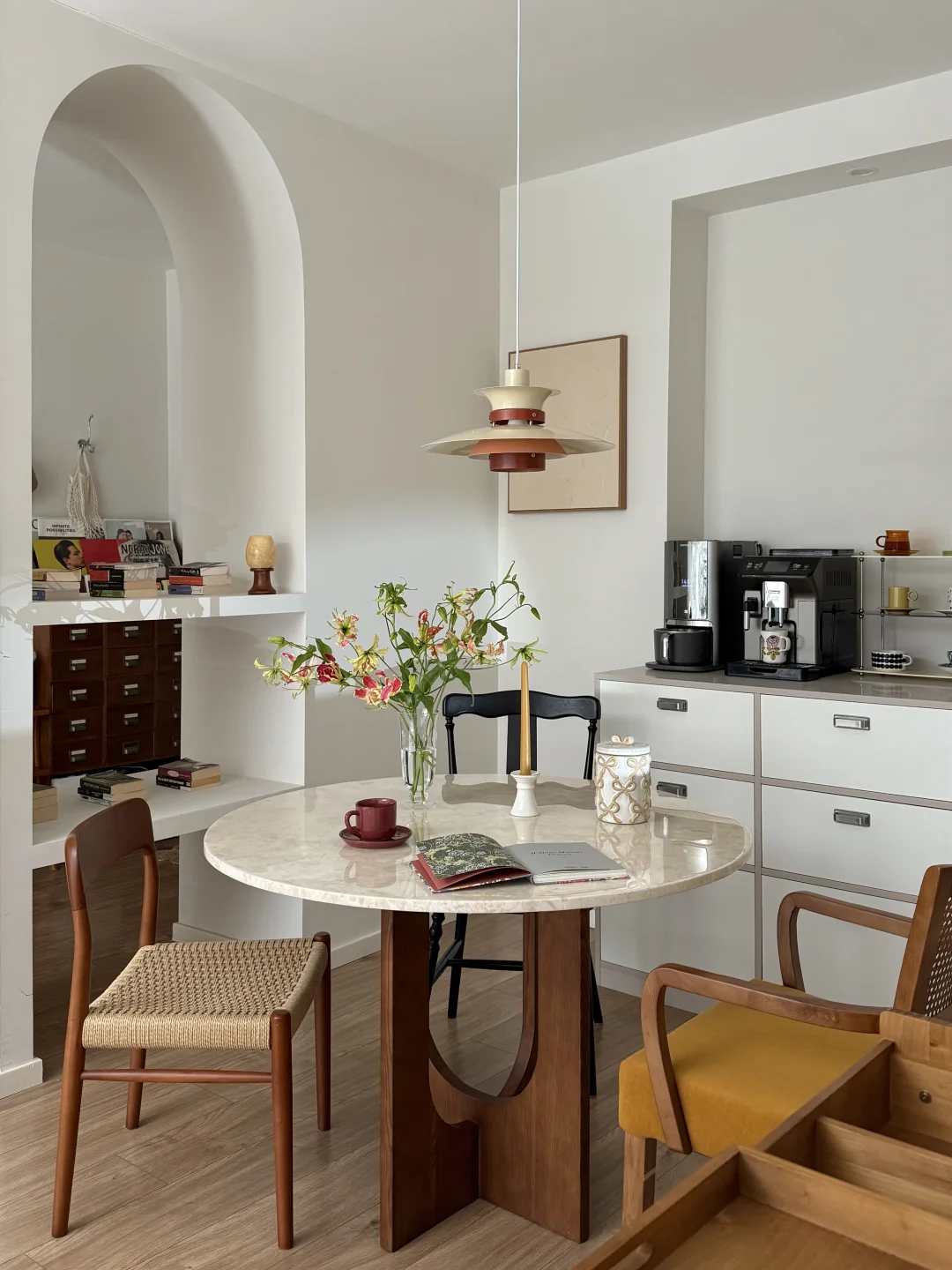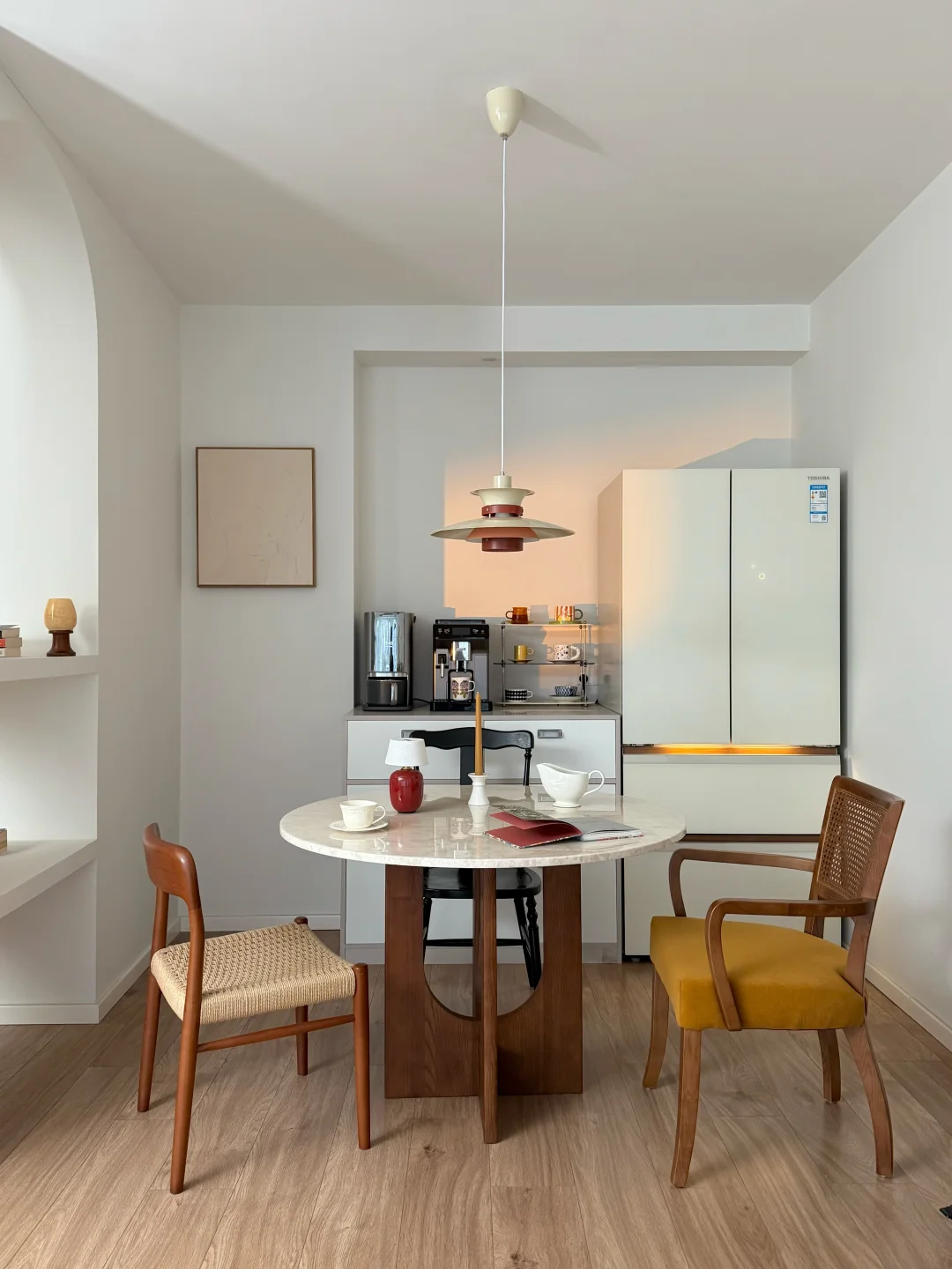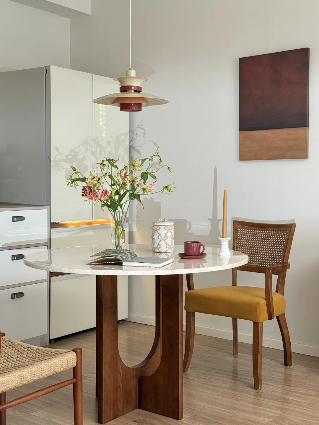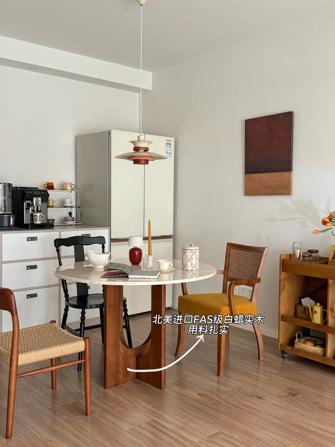 天然的进口大理石显贵质感撞上白蜡实木的温润,中古美学设计让圆桌兼具古朴与现代。在山脚下的小餐厅里,它用弧线围合三餐四季,用扎实材质承载日常,让平凡时刻都满是温度。