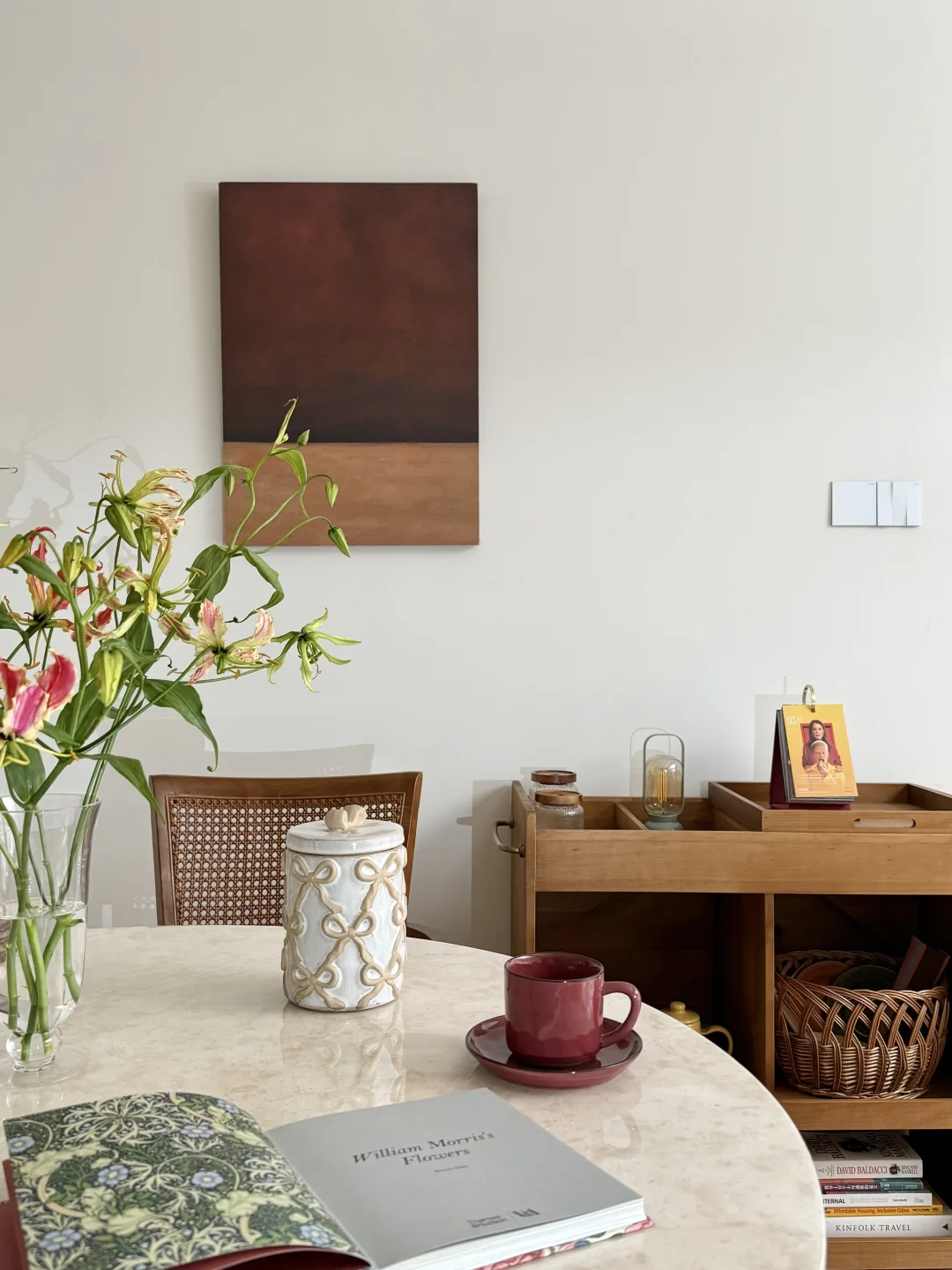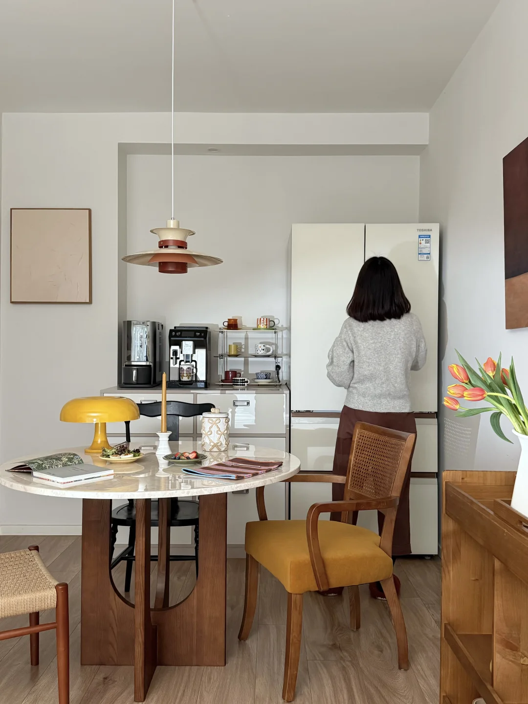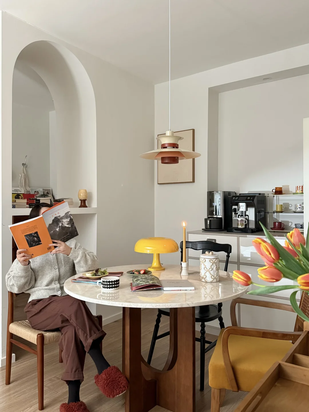 圆桌柔和弧形消解了棱角,围坐时满是温馨。而恰好餐厅的正对面就是我家的落地窗,这个区域不光是餐厅,也是咖啡角、办公区,我也喜欢坐在这里喝咖啡阅读,因为抬眼即是窗外美景,身心都被治愈,成了家里高频使用的幸福载体。