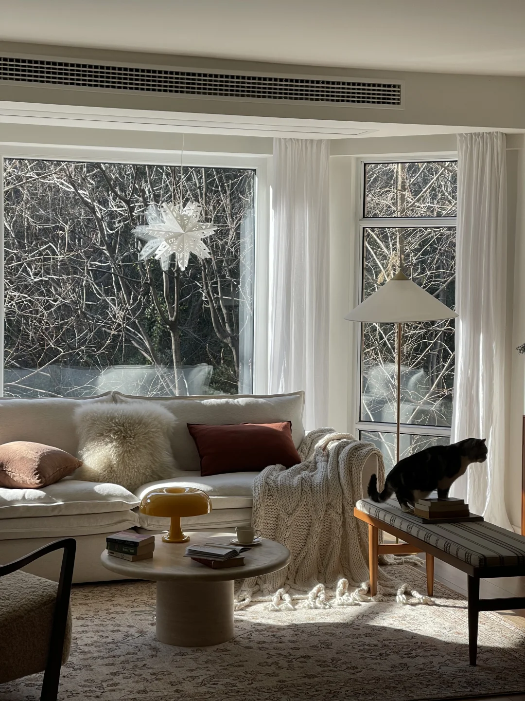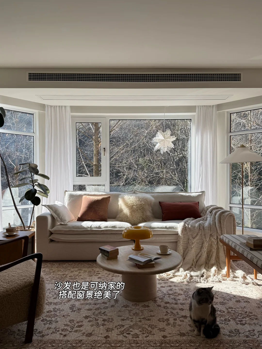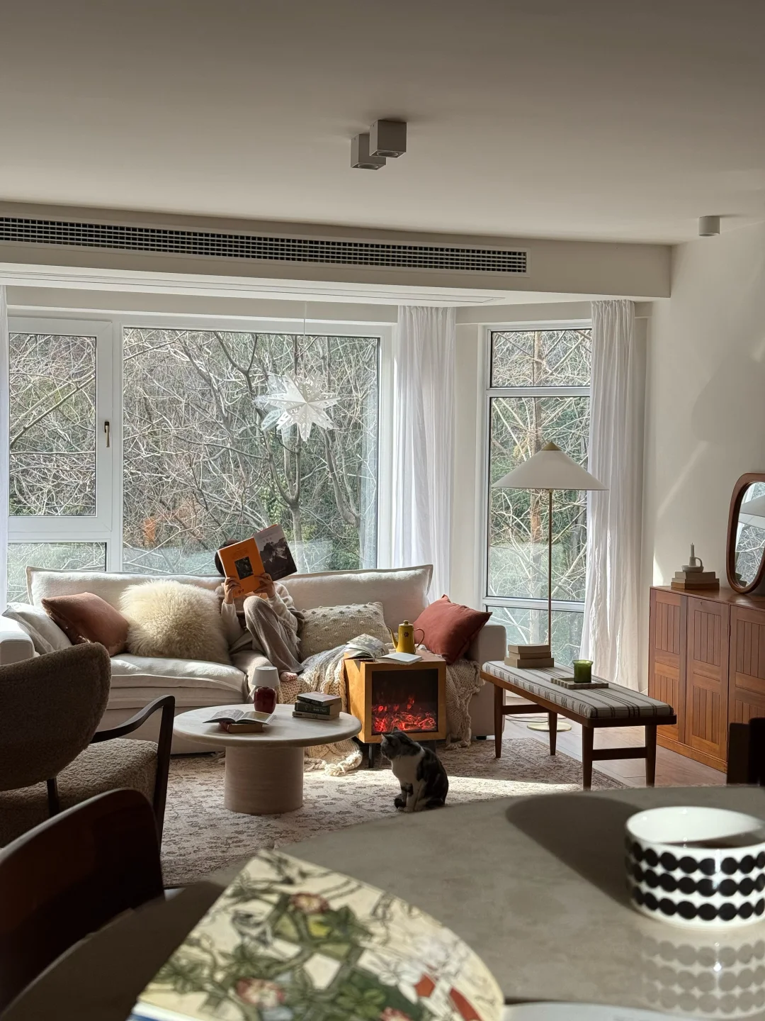 圆桌柔和弧形消解了棱角,围坐时满是温馨。而恰好餐厅的正对面就是我家的落地窗,这个区域不光是餐厅,也是咖啡角、办公区,我也喜欢坐在这里喝咖啡阅读,因为抬眼即是窗外美景,身心都被治愈,成了家里高频使用的幸福载体。