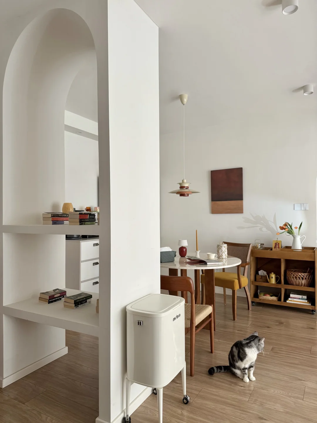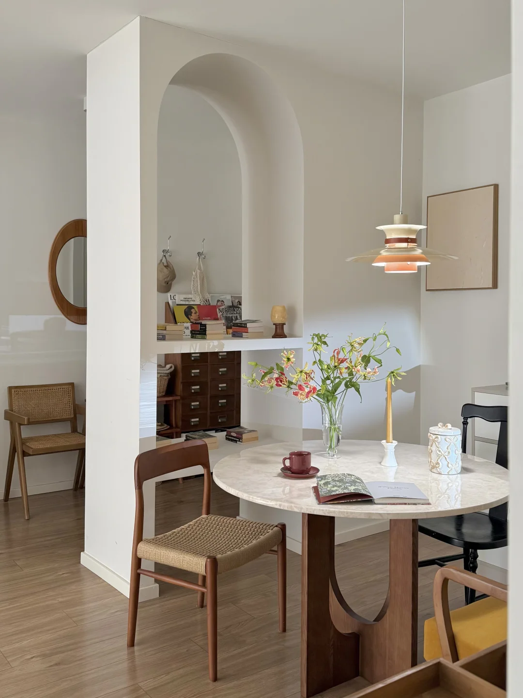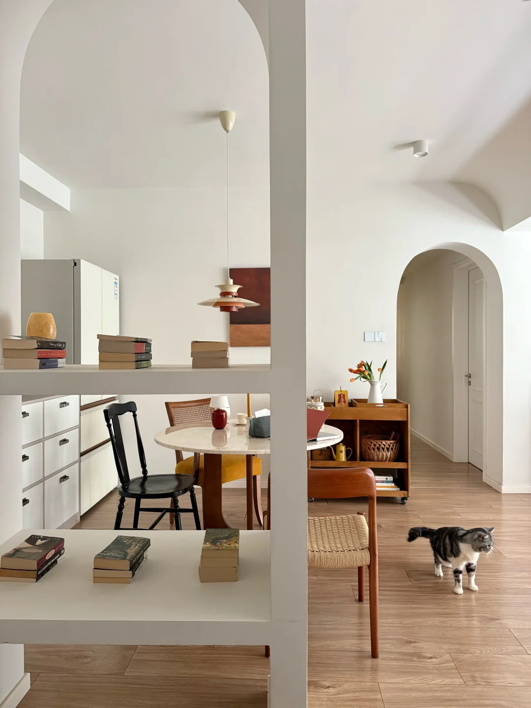 餐边柜是根据冰箱尺寸线下定制的中古款,拱形镂空玄关是我家餐厅硬装的一个亮点。玄关上面没有放置可能显杂乱的小物件,而是摆上了我心爱的书籍,这样一来,空间既整洁又充满艺术感。