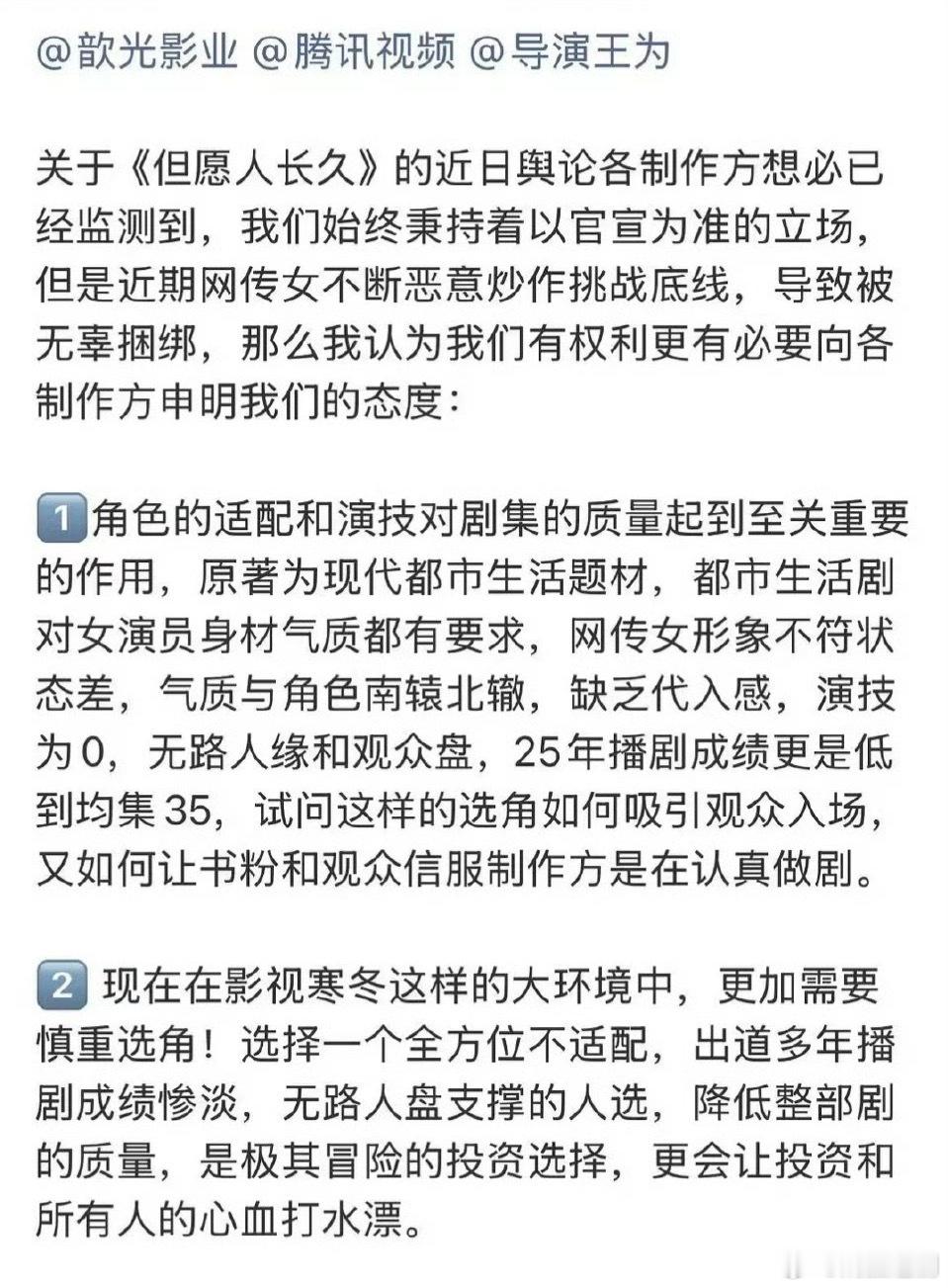 张晚意剧粉针对《但愿人长久》提出了几点建议。