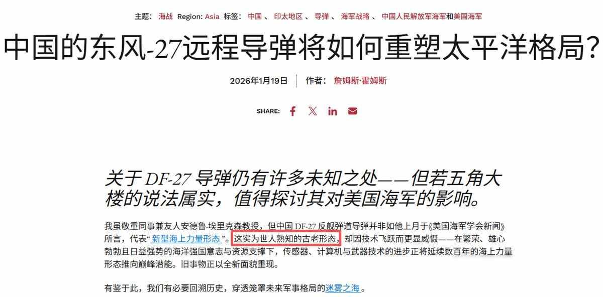 美国焦虑,中国导弹,权力悄然转移 2023年底,美国海军学会新闻网站发布消息称中国东风-27导弹已经服役,这种导弹的射程可以打到美国西海岸,并提到这是“新型海上力量”的开端,但没过几天,《国家利益》网站又解释说实际情况没那么严重,这就像先喊一声“狼来了”,再赶紧补一句别慌,那狼跑不远。 他们提出的第一个理由是这种导弹标称射程有八千公里,但实际打军舰只能达到五千公里,这话听着像是在减轻压力,但你仔细算一下,五千公里的覆盖范围包括关岛、冲绳、夏威夷和圣迭戈这些地方,航母只要一出港,基本就进入它的射程之内,虽然末端机动会消耗一些能量,但这不影响它能打到哪儿,只影响打得准不准,即便打不准也让人紧张,毕竟没人敢保证自己不在那个范围里。 第二个理由显得有趣,因为有人觉得导弹太贵,解放军买不了多少,但战略威慑不是光靠数量堆砌,美军有11艘航母和15艘两栖舰,这些都是高价值目标,就算中国只部署50台发射车,一次齐射也能让美军损失一两艘主力舰,而且中国造导弹的成本控制比美国好得多,美军那边军工费用年年上涨,我们这边却越做越便宜。 第三个说法用红海拦截胡塞导弹的例子,说宙斯盾系统可以拦住东风-27,其实这完全不是一回事,胡塞导弹飞得慢,弹道固定,制导简单,东风-27是高超音速滑翔体,速度达到八马赫,末端还能机动变向,使用复合制导方式,红海那边一次最多打三五枚,台海要是真打起来,就是多波次、多平台、多弹头的饱和攻击,宙斯盾的拦截弹库存和反应速度根本应付不了这种局面。 更关键的是,美军那些大基地——关岛、珍珠港、圣迭戈——以前都依靠纵深防御来维持安全,现在东风-27直接把缓冲区给消除了,航母不敢随便停靠港口,舰载机起降也得重新调整节奏,他们嘴上不说,但私下早就开始推行分布式部署和机动伪装基地,例如远征前进基地作战这种计划,其实就是被逼出来的应对方案。 美国人写文章总爱提到传统导弹形态和过时威慑,听起来他们的思维还停留在冷战时期,中国发展的是常规精确打击加上机动部署和信息欺骗的新体系,不需要动用核武器就能让航母战斗群失去作用,他们至今还没有同类武器投入使用,F-35B和标准-3系统对高超目标的拦截成功率连百分之二十都不到,这是实实在在的技术差距。 还有一个没人提到的重要地方是成本差距太大,东风导弹一枚花1500万到3000万美元,一艘福特级航母要130亿,一艘两栖舰也要45亿,拿几千万的导弹去换价值上百亿的舰队指挥中心,攻击和防守的成本比例变成一比五万,这已经不是打仗的事,完全是在算经济账,美军就算再有钱,也扛不住这样消耗。 我有时候会想,这些人是不是真的以为光靠嘴巴说说就能把威胁给说没了呢,技术跟不上趟,成本也压不下来,部署还总是慢半拍,到头来就只能靠着自我安慰过日子,可现实从来不会因为谁喊一句“没事”就跟着变样,东风-27可不是摆着看的,它实实在在是一股力量,美国媒体越是忙着解释,越说明他们心里头明白得很,这东西确实不好对付。