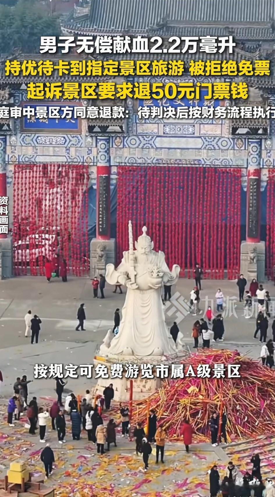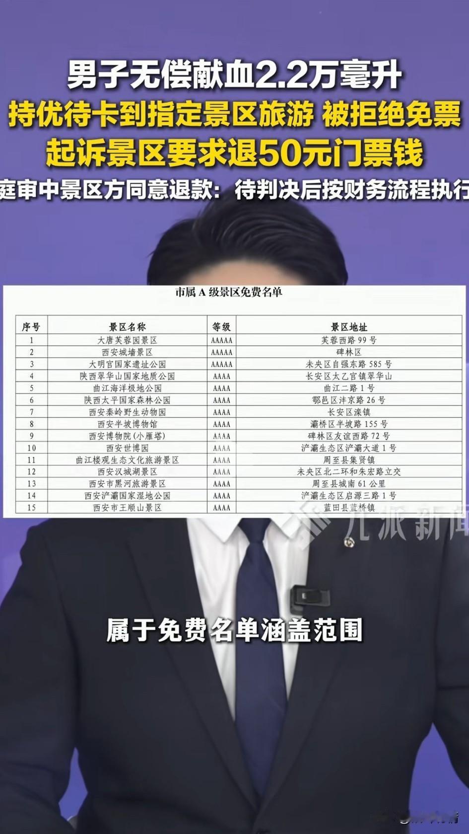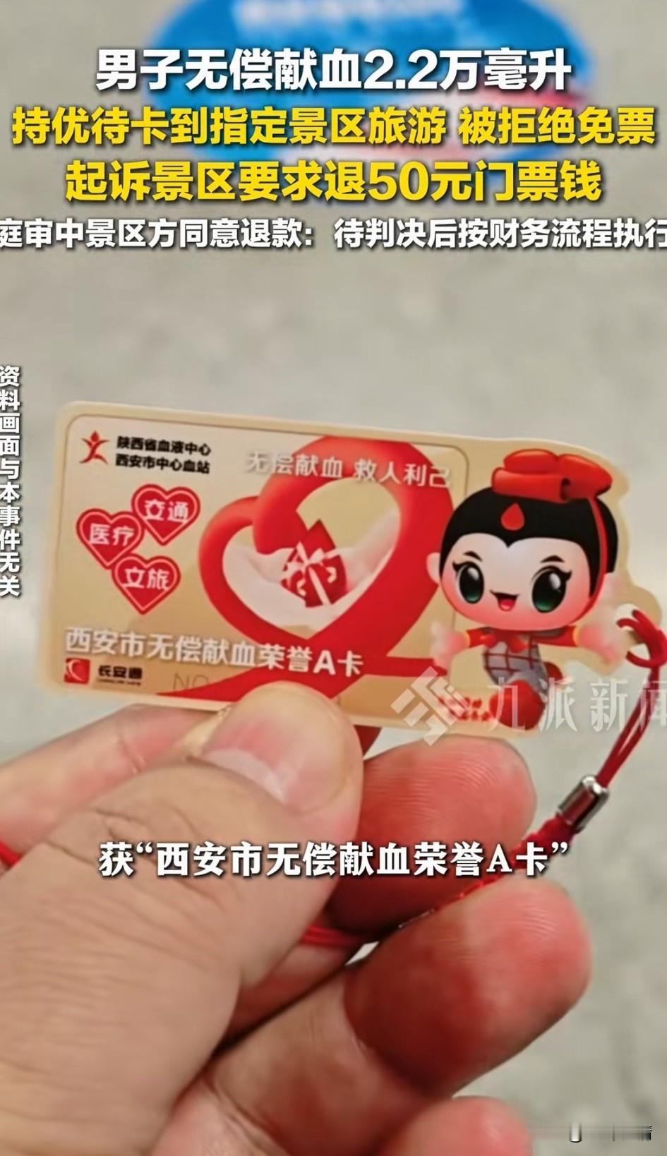 人心就是这么凉的,西安市民无偿献血2.2万毫升,获得了西安市无偿献血荣誉a卡! 这张卡按规定可以游览市属a级景区,然而他在去年12月,开心的带父母去赵公明文化景区! 本以为拿出了这张卡就可以免自己的门票,也算是自己多年献血的一种荣耀,结果却被工作人员告知不可以免门票! 这让他在周围游客面前丢了脸,看着那张献血获得的荣誉卡,心凉了半截,无奈只能自己花钱掏了门票! 之后他查询到,赵公明文化旅游景区是在市属文化景区的名单之上,让他越想越生气,于是一怒之下起诉了景区,要求退钱并追责! 1月19号,该案在周至县法院审理,明明很简单的事儿,景区非要复杂,这回还要闹上法庭!真是太丢人了! 结果可想而知,景区方果然败诉,但是负责人表示,景区管理失误,愿意退还款项,但是必须等判决之后 财务流程执行! 可以想象,景区估计拒绝过多少可以免门票的旅客,钱赚了但人心丢了,真是得不偿失! 如果优待卡不给免景区门票,那不发就得了,现在发了景区也不知情,这就让人不解了,大家对于陕西西安这个旅游景区的做法怎么看? 西安 献血待遇 献血权益