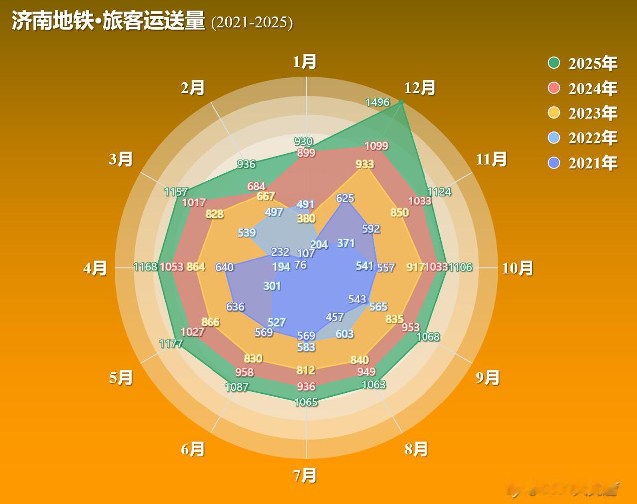 2025年12月济南地铁迎来开通高峰,当月济南地铁新增地铁运营里程85.2km,新增有轨电车里程36km,新增云巴里程30.2km[惊喜][惊喜],但由于大部分线路的开通日期较晚,因此对当月旅客运输量的拉动有限——12月济南地铁完成旅客运输量1496w人次,同比增长36.1%,环比11月增长33.16%[无辜笑][无辜笑];日均运送旅客48.26w人次,环比增长28.11%;加权计算日客流强度0.43w人次每公里,同比增长16.71%,环比增长10.5%[吃瓜群众][吃瓜群众]。从往年数据来看,济南地铁12月的日客流量通常略高于11月,前26日的日客流量应该在38w-39w,总客流量应该在1000w左右,地铁4/6/8号线开通后的日均客流应该在100w上下,但考虑到12.31跨年日的客流量达到了145w人次,所以实际上12.27-30日间的客流量大概在90w上下[红脸][红脸]。由于1月份距离春节尚远,地铁客流基本不受春运影响,日客流强度应该是12月底接近,预计2026年1月济南地铁总客流量可以达到2900w人次左右[惊喜][惊喜]