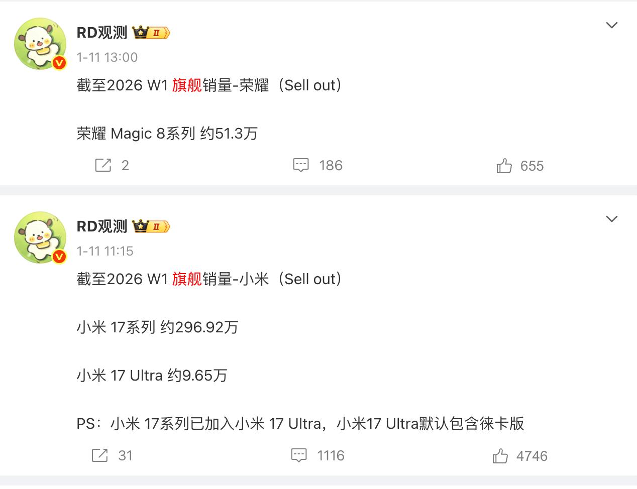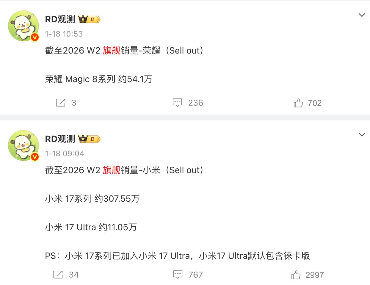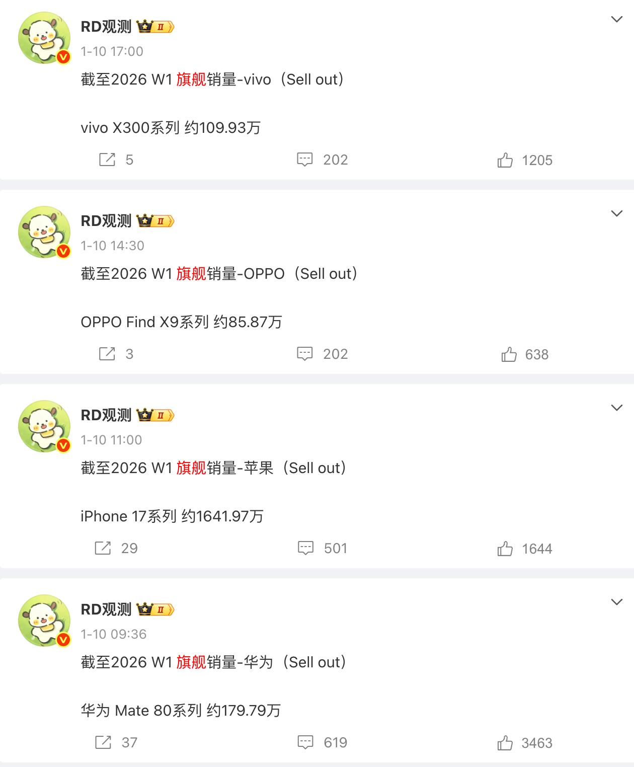 看了一下各家旗舰机累计销量,iPhone17依然一个能打的没有,华为Mate80超过小米17难度不小! 截止2026年第二周旗舰机销量数据出来了,我们简单罗列一下! 第一名、iPhone17系列 约1726.77万 第二名、小米17系列 约307.55万(其中小米17Ultra系列约11.05万) 第三名、华为 Mate 80系列 约205.73万 第四名、vivo X300系列 约116.25万 第五名、OPPO Find X9系列 约91.02万 第六名、荣耀 Magic 8系列 约54.1万 我们再看看上周的数据: 第一名、iPhone 17系列 约1641.97万 第二名、小米 17系列 约296.92万(小米17Ultra系列约9.65万) 第三名、华为 Mate 80系列 约179.79万 第四名、vivo X300系列 约109.93万 第五名、OPPO Find X9系列 约85.87万 第六名、荣耀 Magic 8系列 约51.3万 iPhone17系列是三款(没算iPhoneAir,不过Air的销量即使算上在17系列也可以忽略不计)、小米17系列是四款(算上Ultra和徕卡版)、华为80系列是四款、vivo和OPPO还有荣耀都是两款(荣耀Magic8 ProAir和RSR版本才刚刚发布,还没算进去)。 我们再来看看这一个周各家的增长量: iPhone17系列 84.8万 华为Mate80系列 25.94万 小米17系列 10.63万 vivoX300系列 6.32万 OPPO Find X9系列 5.15万 荣耀Magic8系列 2.8万 iPhone17系列依然一骑绝尘,一个周增长85万台,后面几家加起来才50万出头,差距非常明显,毫不夸张的说,iPhone17系列的平销期比别人的首发期还猛。并且更离谱的是,iPhone17系列卖得最好的并不是标准版,而是最贵的ProMax,单品销量已经达到785万了。 小米17系列和华为Mate80系列四款手机都已经发布完了,但是小米17系列先发,目前两家差距还有100万,就按照目前周销量差,Mate80系列一个周比小米17系列多卖15万部,想要赶超小米17系列,那还要6.6个周,也就是一个半月多一点的时间。 至于后面三家,vivo依然是仅次于果米花三家旗舰后的独一档存在,目前已经百万级销量,也是历史最好,个人觉得,vivo应该是继小米后下一个站稳高端旗舰的。 OPPO Find X9系列同比上一代有点下滑,荣耀也一样,两个都是难兄难弟!