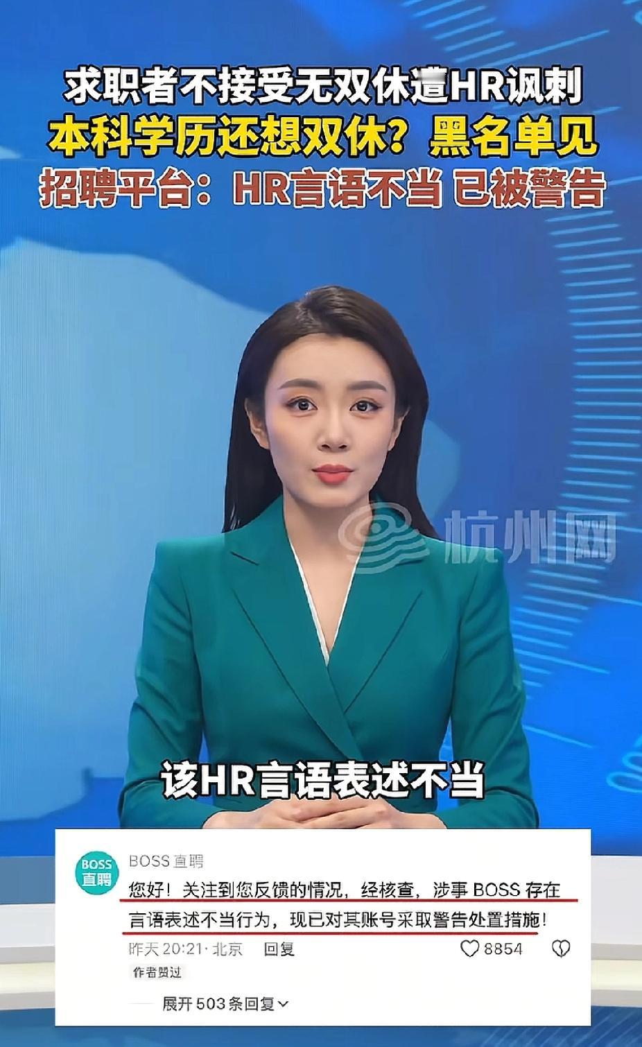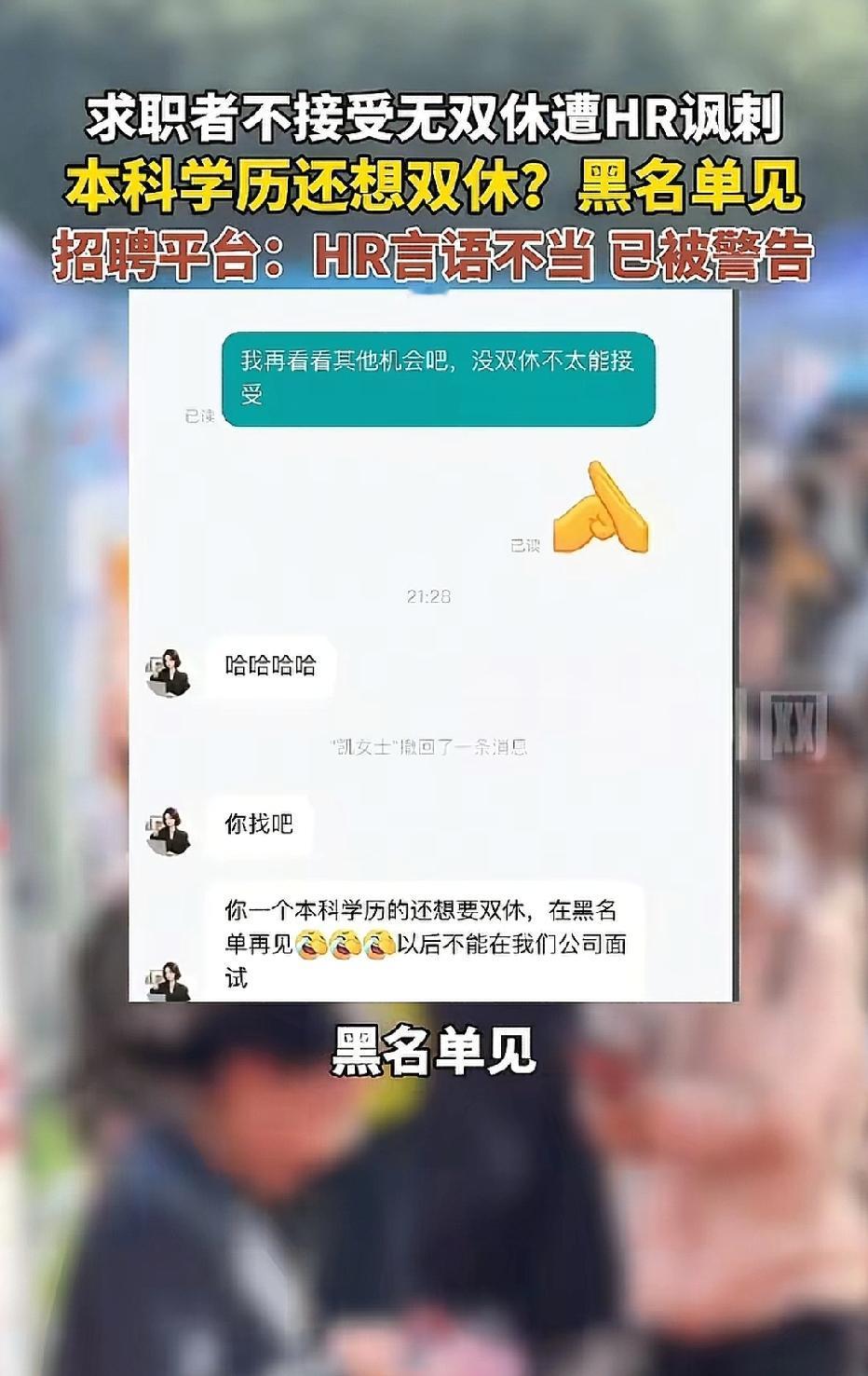 闹大了,一求职者在平台上求职,人事跟他说明岗位和休息。求职者不太接受没有双休的工作。不料,人事却嘲讽他:一个本科还想要双休,黑名单见,不能在我们公司面试。求职者于是曝光这一幕,人事被警告。 1月18日,一位网友发帖吐槽自己遇到的糟心事,他称自己在某平台上咨询一家公司工作内容。 他了解到公司是单休的,就拒绝了。 结果就被人事嘲讽得心里不是滋味。 这下网友懵了,找工作双向了解一下怎么了,现在求职者找工作,难道连一个要求都不能提?这也太不尊重人了吧! 那天,网友原本在求职平台上咨询中国人寿相关岗位的招聘信息。 沟通中人事向其明确了岗位工作内容以及休息制度。 网友得知该岗位为单休后,网友因自身对双休的工作需求,坦诚表示再看看其他机会吧,不太能接受单休。 整个沟通过程礼貌且明确,只是正常的求职双向了解。 结果人事直接嘲讽他,说一个本科还想双休,让他去找吧,甚至还放话:你一个本科学历还要双休,在黑名单见,以后不能在我们公司见面。 网友特别生气,觉得找工作本就是互相选择,要双休是正常要求,跟学历压根没关系,自己只是合理拒绝,凭啥被这么怼。 之后他就把俩人的聊天记录发出来曝光了,这事一出,网友们都骂这个人事不专业、没素质,还搞学历歧视。 后续中国人寿那边也有了处理,把这个涉事的人事给警告了。 此事引发大家热议,都觉得企业招聘得尊重求职者,双向选择不是白说的,不能因为求职者提了合理要求,就出言嘲讽还区别对待。 大部分网友分享了自己类似的求职经历,有人因问单双休被怼“不能吃苦”,有人因提合理诉求被区别对待。 大家感慨现在找工作连问双休都要小心翼翼,双休从职场标配变成了奢侈品,职场内卷也不能卷掉打工人的合法权益。 《劳动法》第36条规定,国家实行劳动者每日工作时间不超过8小时、平均每周工作时间不超过44小时的工时制度。 求职者有权了解工作的休息制度,并根据自己的需求进行选择,要求双休是其合法权益。 劳动法保障劳动者的休息权,双休是打工人最朴素的诉求,本科求职要双休天经地义,凭啥被嘲讽不配? 《就业促进法》第3条规定,劳动者依法享有平等就业和自主择业的权利,劳动者就业,不因民族、种族、性别、宗教信仰等不同而受歧视。第二十六条规定,用人单位招用人员、职业中介机构从事职业中介活动,应当向劳动者提供平等的就业机会和公平的就业条件,不得实施就业歧视。 人事以求职者是本科学历却要求双休为由进行嘲讽,将学历与休息权益不合理地挂钩,这种行为涉嫌就业歧视,侵犯了求职者平等就业的权利。 求职者礼貌询问、合理拒绝单休岗位,只是在行使自己的择业自由,要求双休更是贴合法律规定的正当诉求。 学历和休息权本就毫无关联,人事拿本科学历嘲讽求职者“不配要双休”,不仅是对劳动者的不尊重,更涉嫌就业歧视,触碰了法律红线。 一句“黑名单见”的蛮横表态,更是把招聘的平等关系变成了居高临下的刁难,完全忘了人事是企业和求职者的沟通桥梁,而非手握“生杀大权”的评判者。 对此,你怎么看?