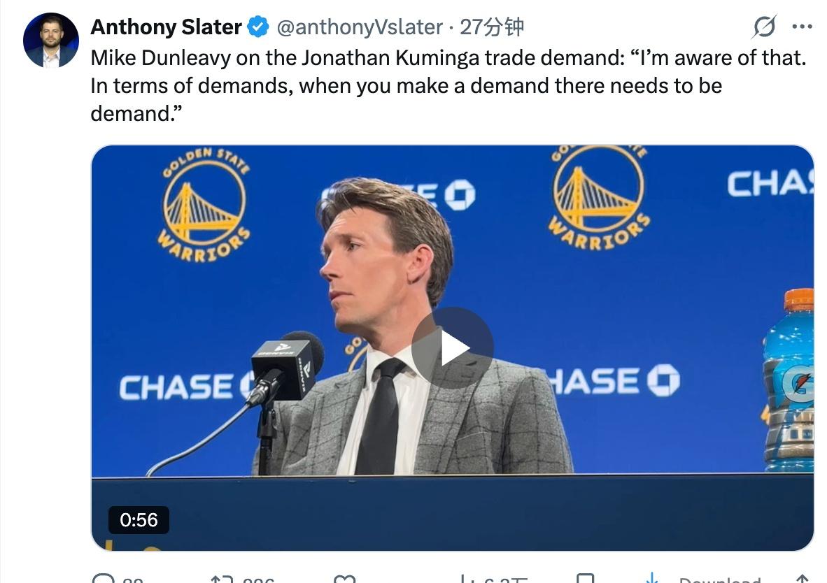 迈克·邓利维谈乔纳森·库明加的交易申请:“我知晓这件事。就‘要求’(demand)而言,当你提出一个交易要求时,市场上也得有相应的‘需求’(demand)才行。” “我很遗憾事情没能进展得更顺利。但事实就是如此……我知道交易申请已经提交了。但目前还没有什么迫在眉睫的进展。这个联盟里的局势瞬息万变,就像昨晚那样。所以,他必须做好准备。” “如果我们讨论的是交易那些在库里离队之后才会兑现的选秀权,那么我们换回来的球员,必须是我们认为在那些选秀权兑现时依然会留在队中的人。”