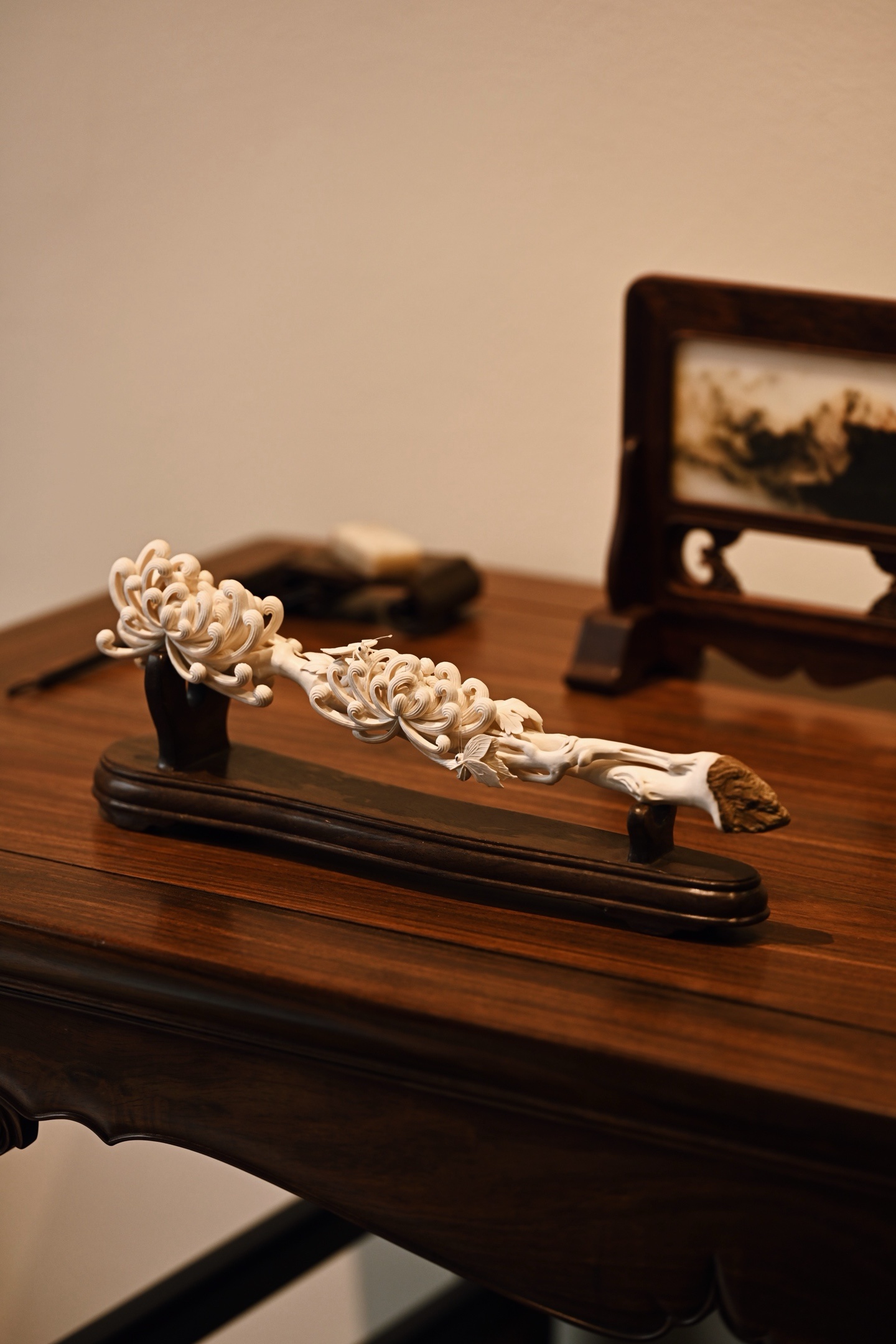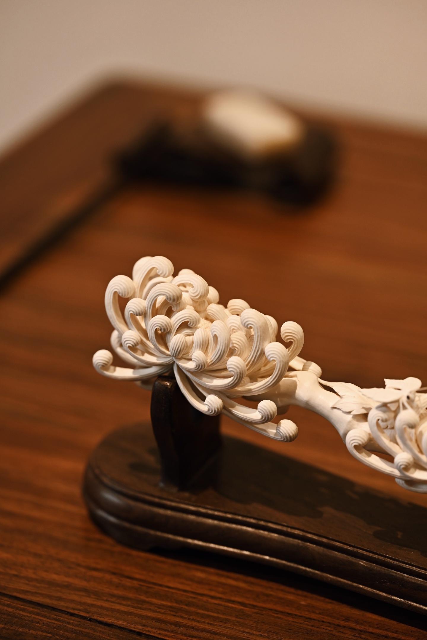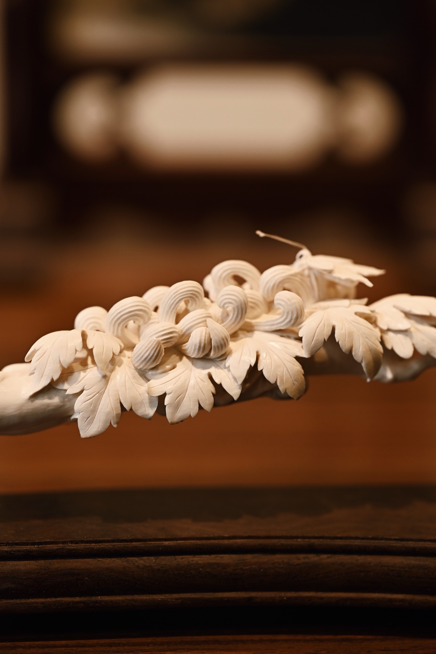 猛犸 | 秋英生香 如意摆件料白如凝霜,雕刻菊花瓣瓣层叠如卷云舒卷,取菊花凌冬不凋之姿,蝴蝶翩翩,刀工盘转往复间,将草木枯荣的意趣凝于方寸。置于案头,似有冷香浮散,成一室清寂风骨。30*6*11.5cm 净重157g