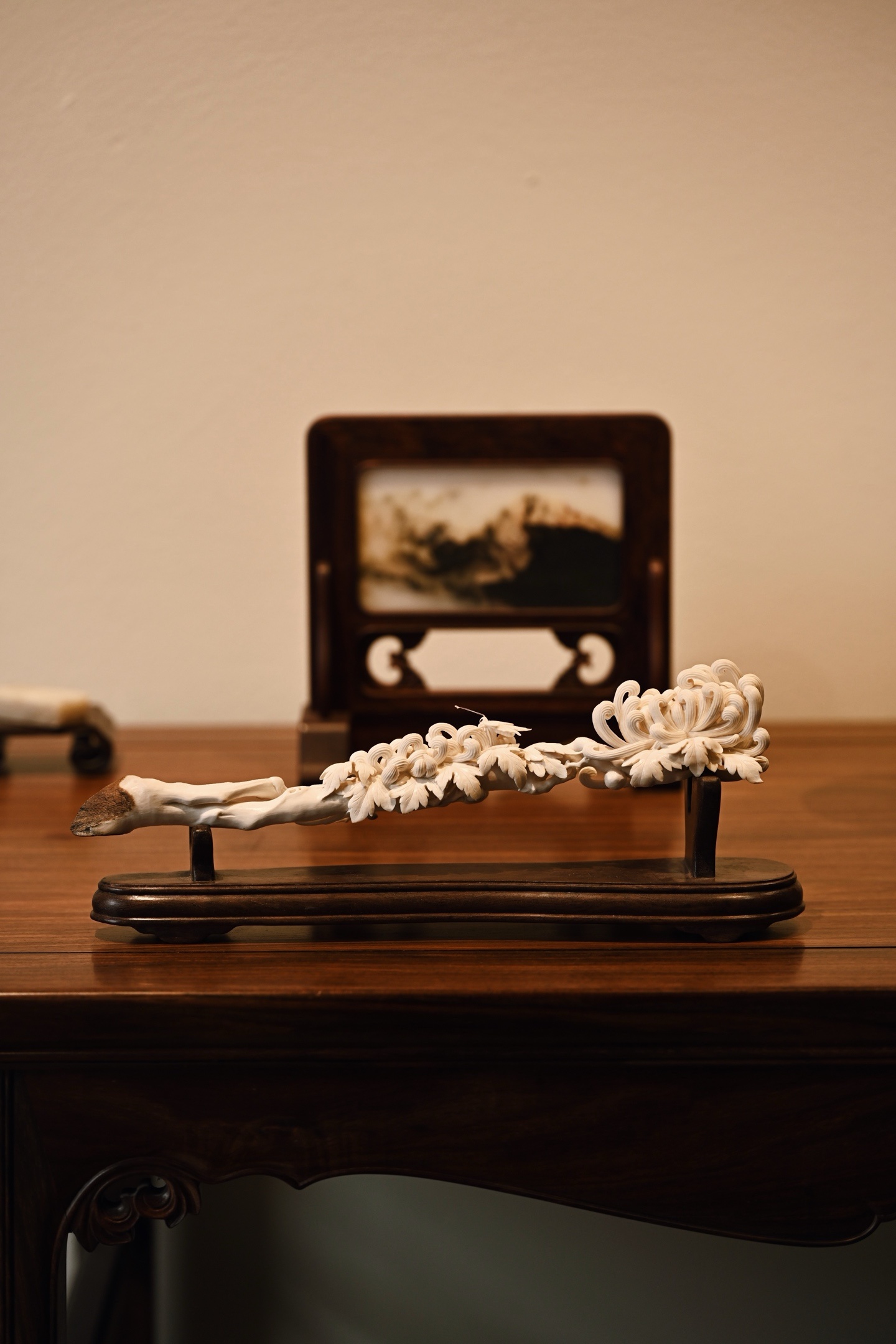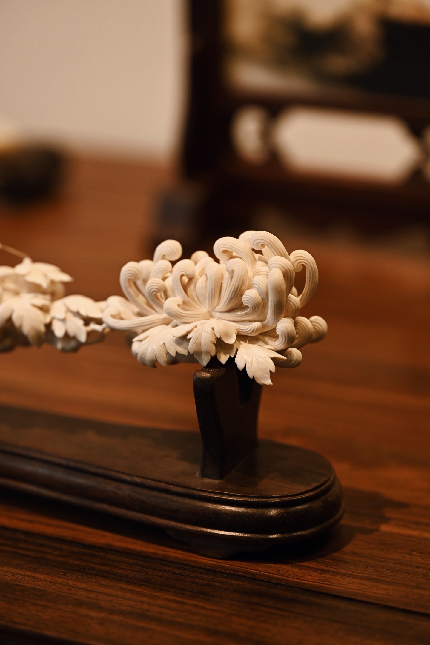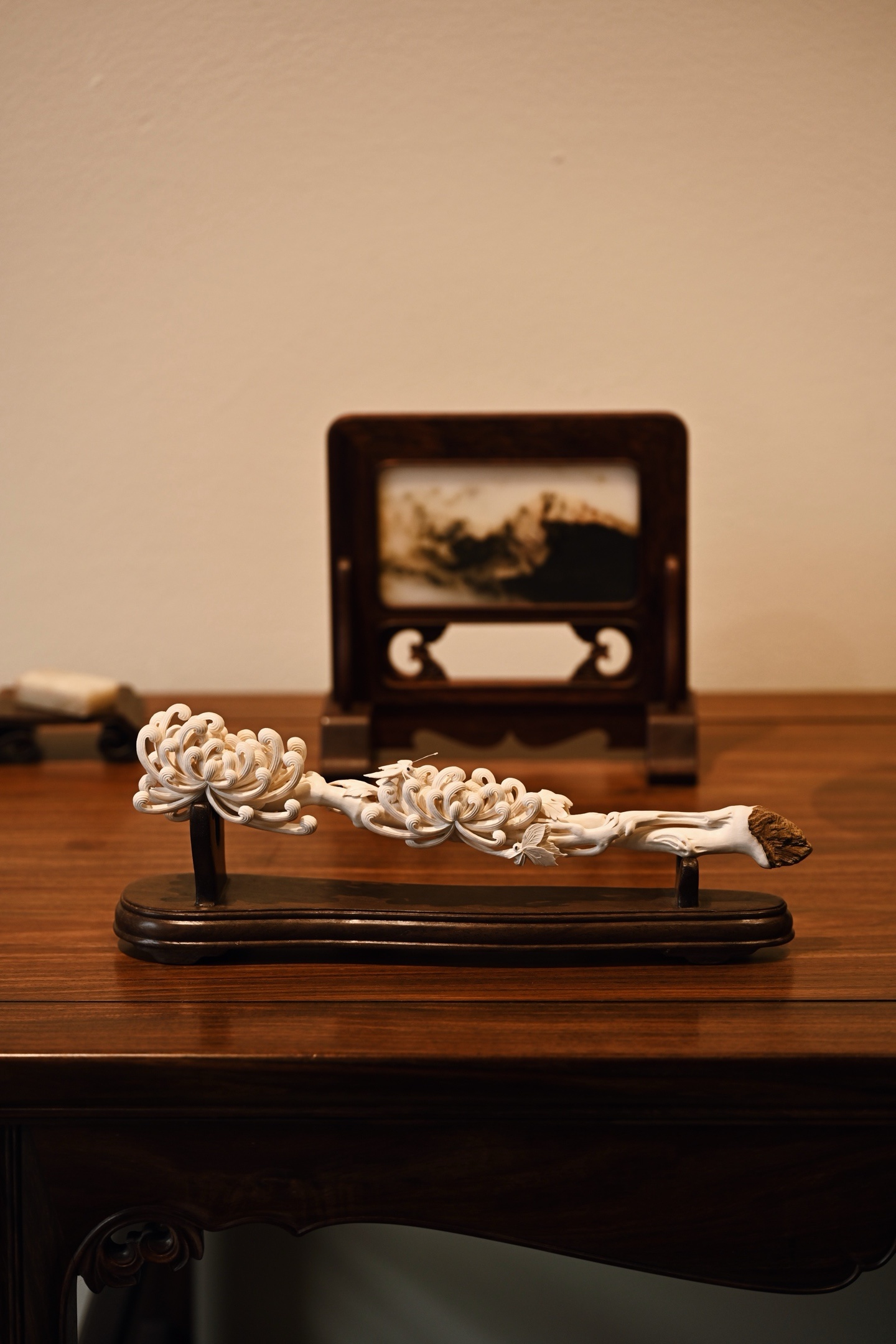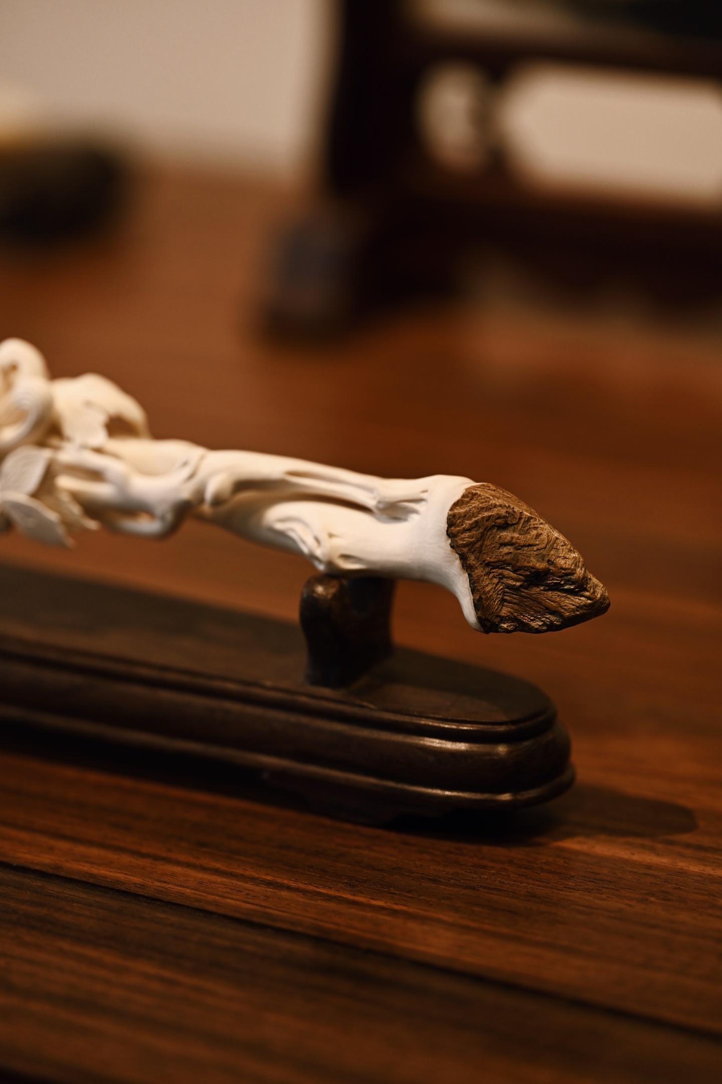 猛犸 | 秋英生香 如意摆件料白如凝霜,雕刻菊花瓣瓣层叠如卷云舒卷,取菊花凌冬不凋之姿,蝴蝶翩翩,刀工盘转往复间,将草木枯荣的意趣凝于方寸。置于案头,似有冷香浮散,成一室清寂风骨。30*6*11.5cm 净重157g