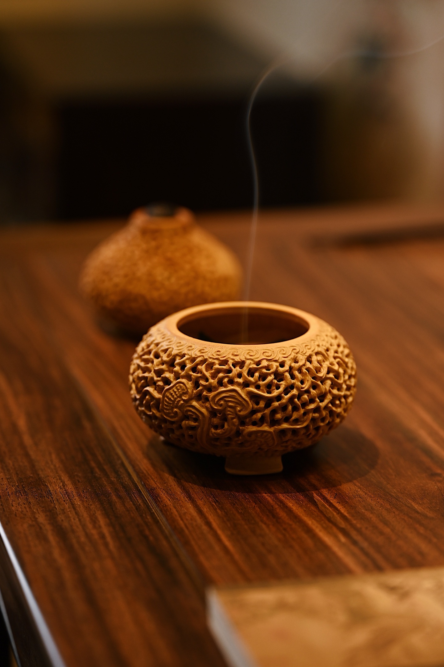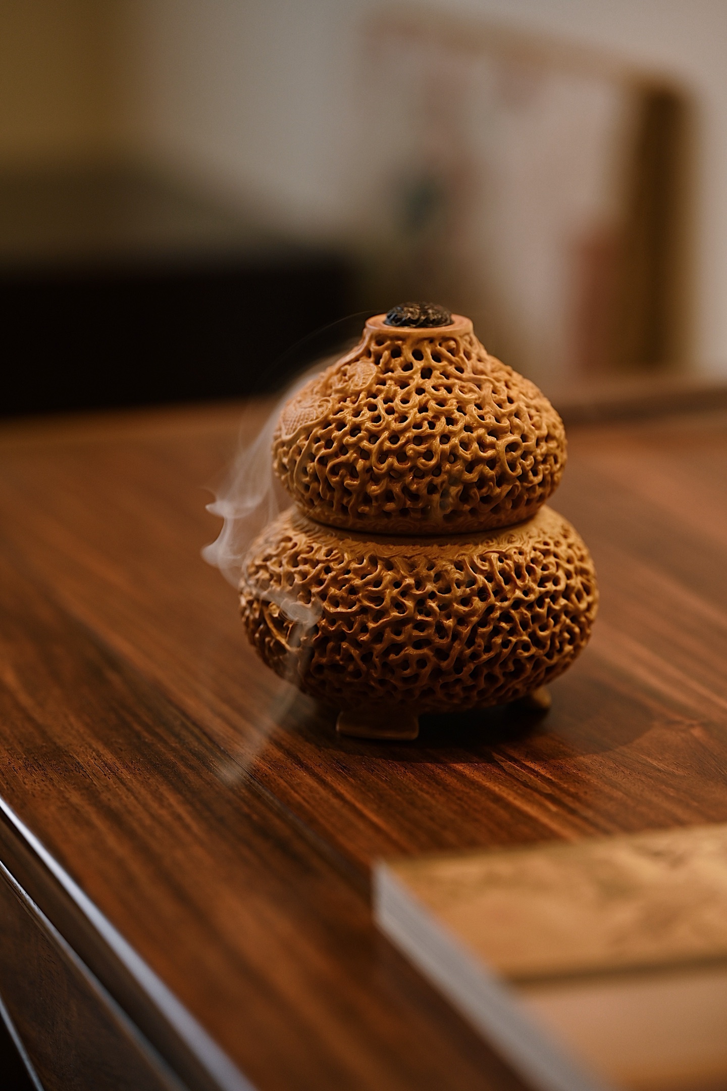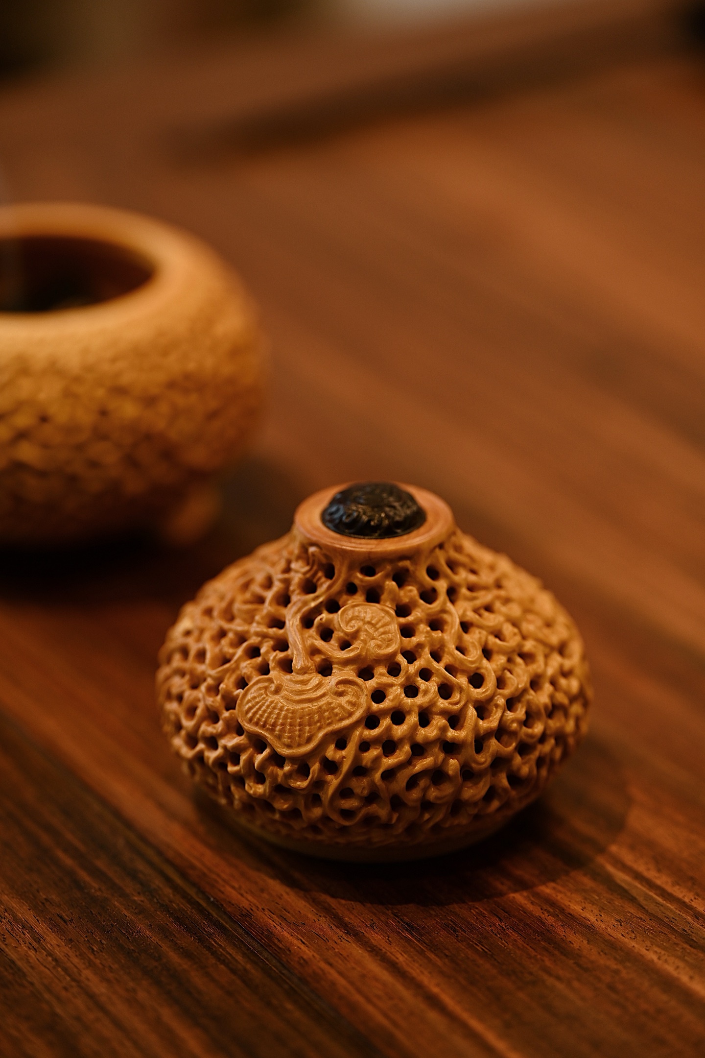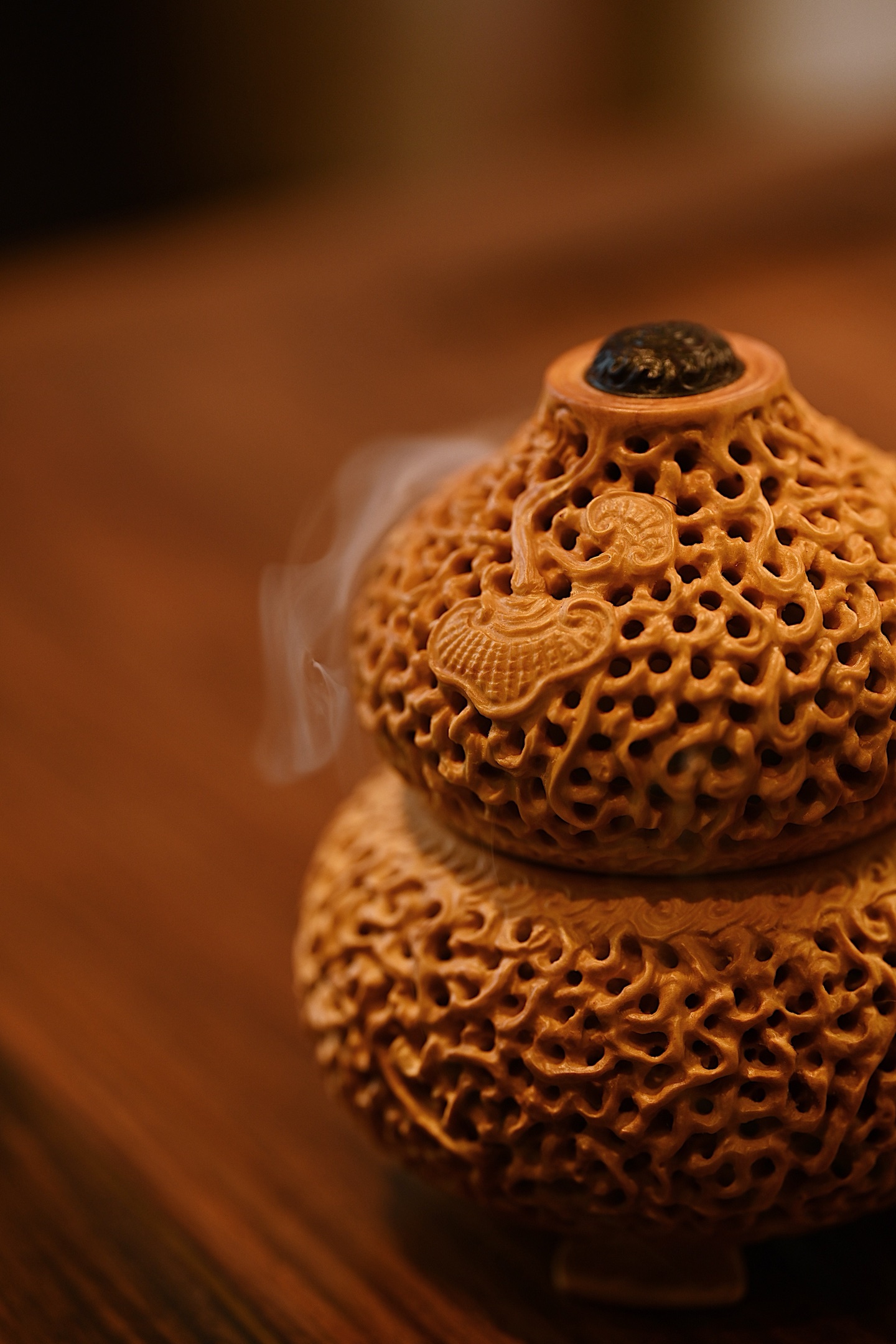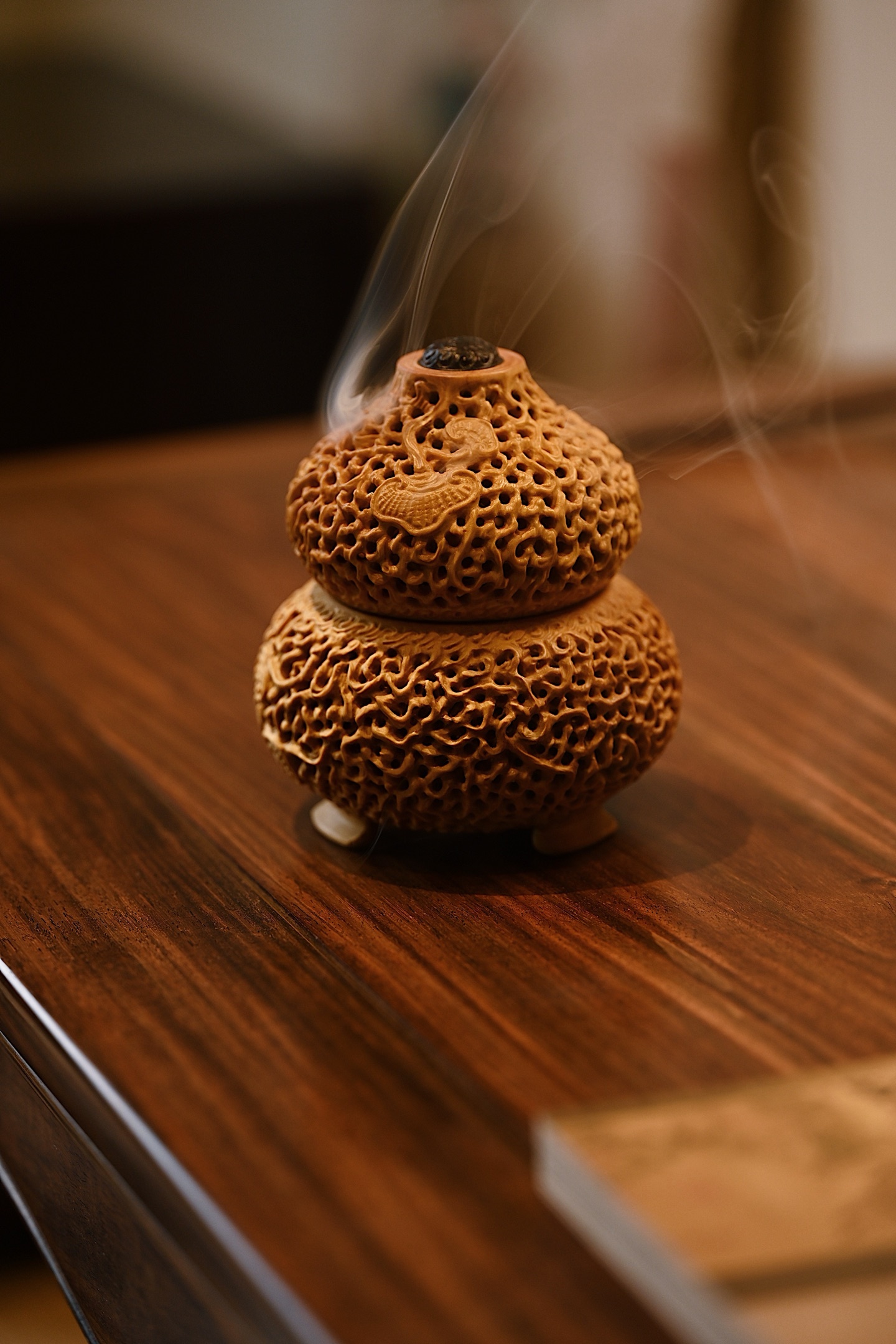 黄杨木 | 灵芝福禄 葫芦香炉造型饱满,端庄大气,纯手工镂空雕刻,线条古朴流畅,体量灵巧,谐音“福禄”,内膛掏空焚香,可观云烟雾绕,吉祥喜人。9.5*9.5*11cm 223g