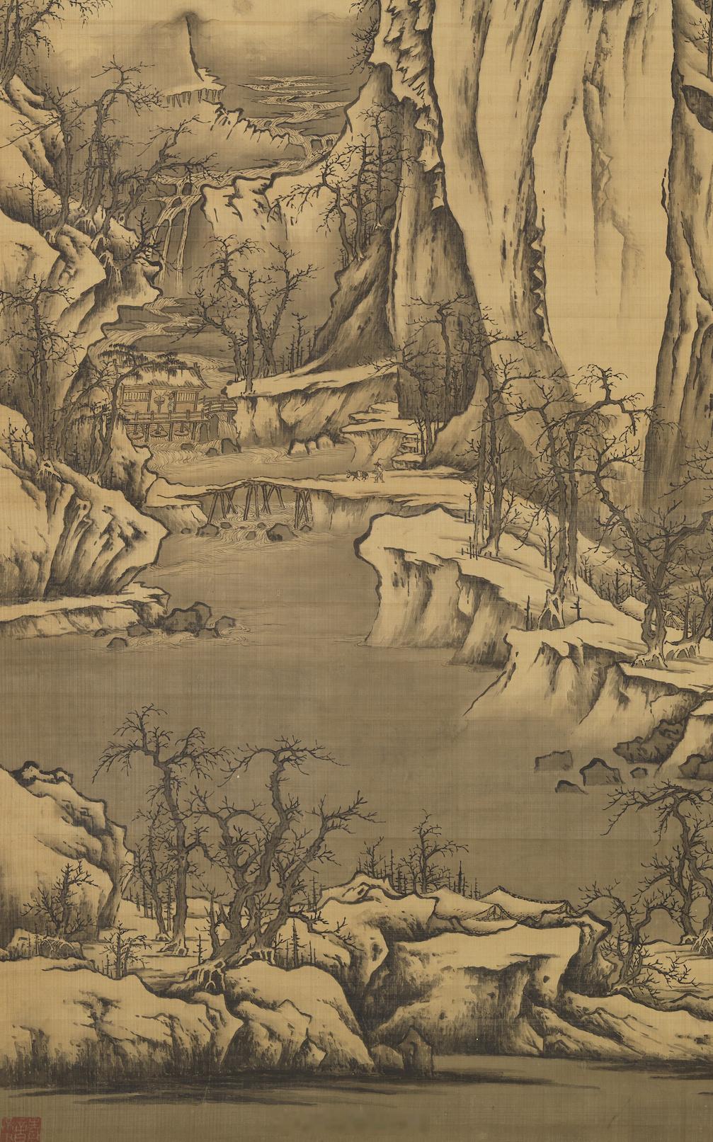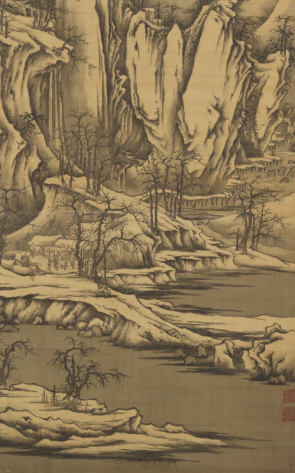 清 黄鼎画群峰雪霁 轴黄鼎(西元一六六○年-一七三○年),江苏常熟人。字尊古,号旷亭。初画山水跟丘园学习,后来以王翬、王原祁为师。此幅描绘满是白雪覆盖的山国中,峰峦陡直林立,涧水曲折迴流,寒林散列各处,由画面中传来一股凛冽的寒气。以山峰、涧水、寒林的画风来看,与宋朝许道宁相当近似。尺寸:260.3x168.8 公分来源:台北故宫博物院