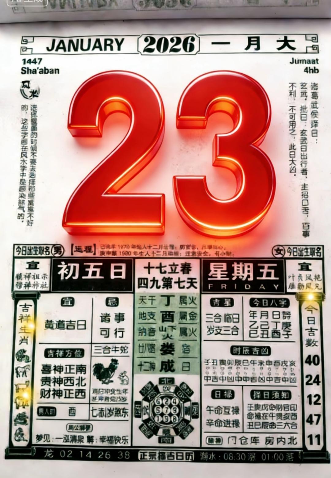 客官,来,看看腊月初五,2026年1月23日这天。这天呐,是个“黑道凶日”,值日的是“勾陈”凶神,老话说“勾陈缠绕,口舌生非”,所以整体气场是偏阻滞的。不过你细细看,它又有点特别,是个“成日”,“成”代表成就、完成,所以它像个“专科大夫”,能办的事很专一,不能办的事也特别明显。 这天适合做什么? 咱们先瞅瞅“宜”的那一栏,它主攻的是这么几件事: · 祭祀扫墓:这天非常适宜祭祀祖先、上坟扫墓,是“大吉”之日。 · 安葬修坟:与白事相关的,如安葬、立碑、修坟、破土等,也都适宜。 · 打扫与纳财:也能做些解除晦气的事,比如“扫舍”(大扫除),以及“纳财”(收账、理账)。 简单说,这天是处理“身后事”、告慰先人、除旧布新的日子。 这天忌讳做什么? 再看看“忌”,这就比较多了,都是些人生大事和喜庆事: · 婚姻喜庆:结婚、领证、订婚是万万不宜的。 · 搬家入宅:搬家、入伙、乔迁新居也最好避开。 · 远行赴任:出行、旅游、赴任这类出远门、开启新阶段的事也不建议。 所以啊,红事、喜事、动宅的事,这天都得绕道走。 给特定属相朋友的提醒 老黄历讲究合冲害,这天是“鸡日冲兔”,所以: · 属兔的朋友:这天是“岁冲”,诸事不宜,尤其要安稳,别做重要决定。 · 属鸡的朋友:这天“自刑”,自己容易跟自己过不去,也需多注意情绪。 · 属狗的朋友:与日相“害”,人际上要留心,避免误会。 · 属龙、蛇、牛的朋友:与日柱三合或六合,相对顺利,算是有点帮扶。 生活老讲究 还有两句老祖宗传下的“彭祖百忌”得知道: · “丁不剃头”:丁日不理发,老话说怕生头疮。 · “酉不宴客”:酉日不请客大吃大喝,怕醉酒失态。 财神、喜神的方位呢,各家说法有点小出入,有的说财神在西南,有的说在正西。稳妥起见,如果要求财,这两个方向都恭敬些总没错。喜神多在正南。 总结一下 (合上黄历,语气温和)总的来说,腊月初五这天,是白事的吉日,却是红事的忌日。它专精一面,就像一把好用的锹,适合用来“入土”“安顿”,但不适合用来“架梁”“开张”。要是家里正好要办祭祀修坟的事,这日子挺合适;但若是打算娶亲、搬家、出远门,咱们不妨翻翻后头,另择一个风和日丽的黄道吉日。过日子啊,心里有个谱,做事就多了分从容。冬月初五宜忌 乙巳年神煞 下年初五 初五禁忌 黄历忌宜 今日黄历 写作给你带来了快乐和进步吗? ---