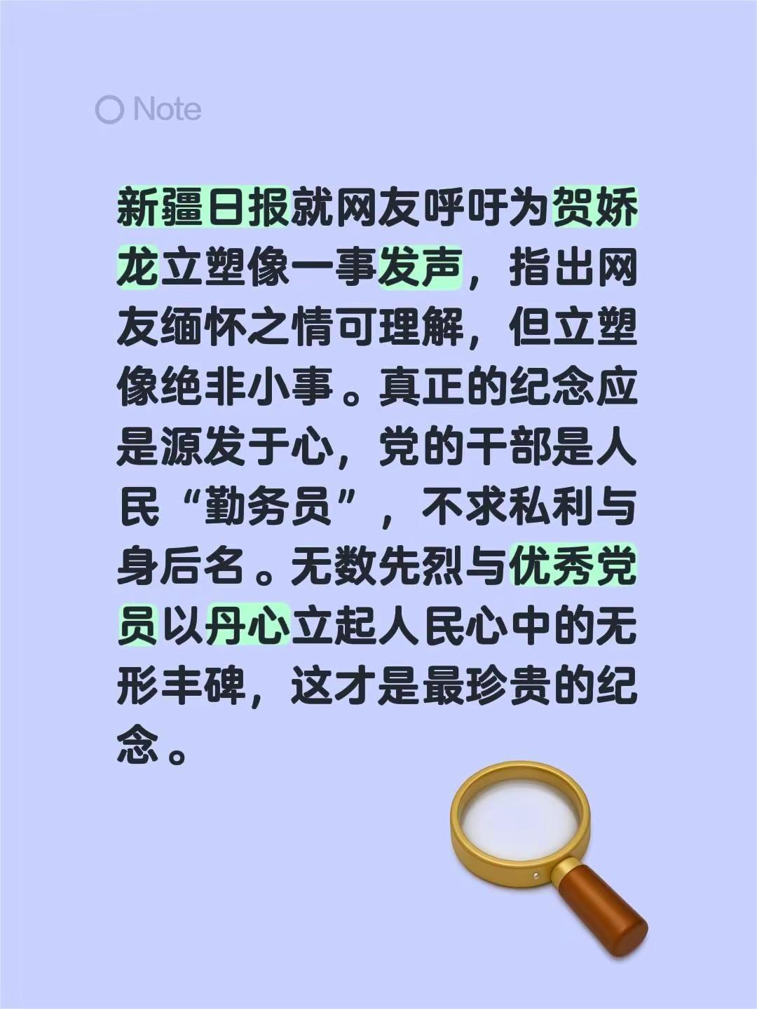 为贺娇龙立塑象?以心为碑,方是真纪念!新疆日报就网友呼吁为贺娇龙立塑像一事发声,指出网友缅怀之情可理解,但立塑像绝非小事。真正的纪念应是源发于心,党的干部是人民“勤务员”,不求私利与身后名。无数先烈与优秀党员以丹心立起人民心中的无形丰碑,这才是最珍贵的纪念。