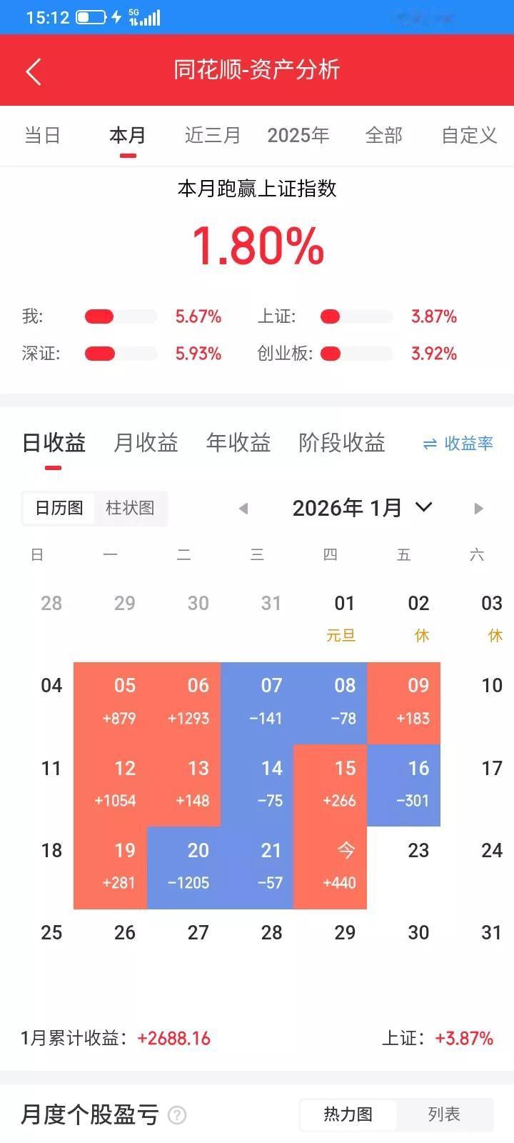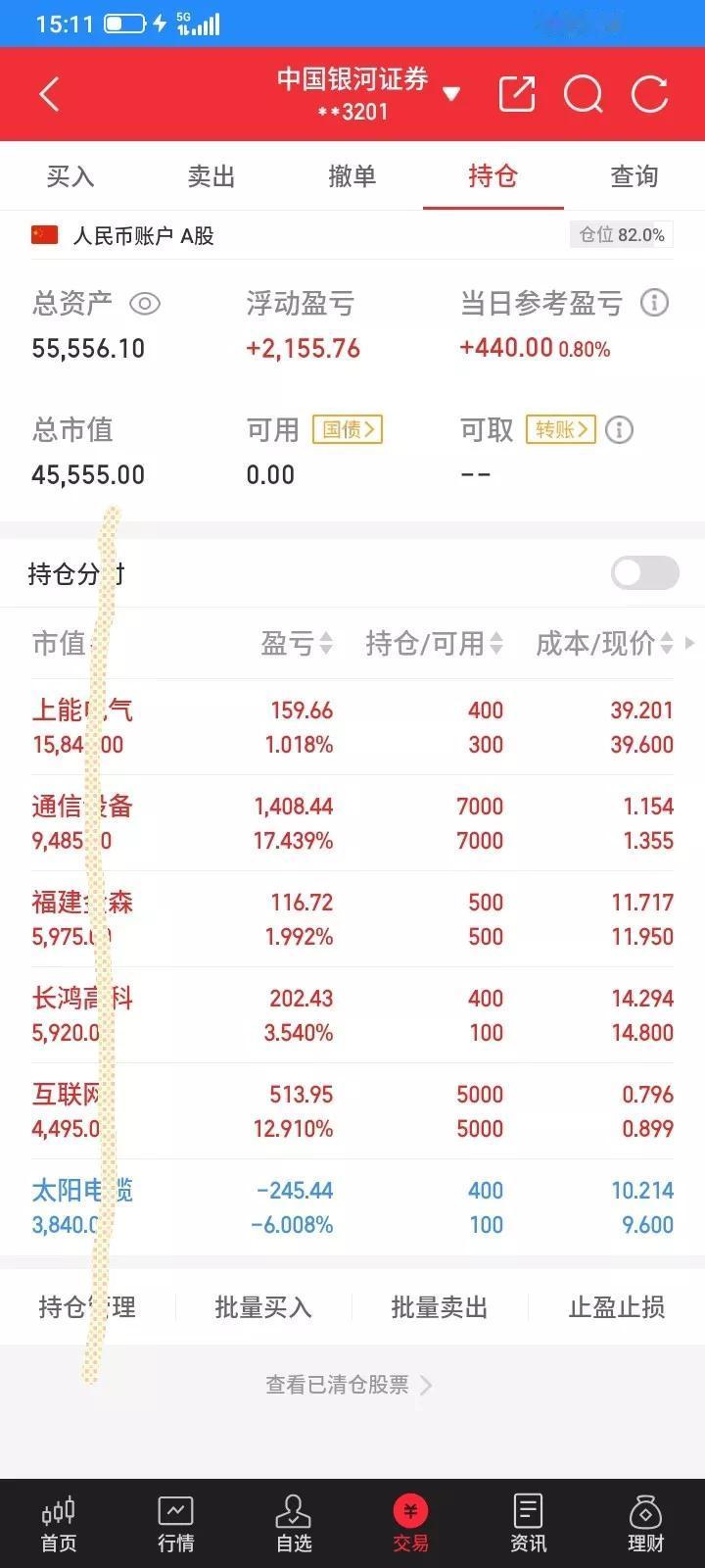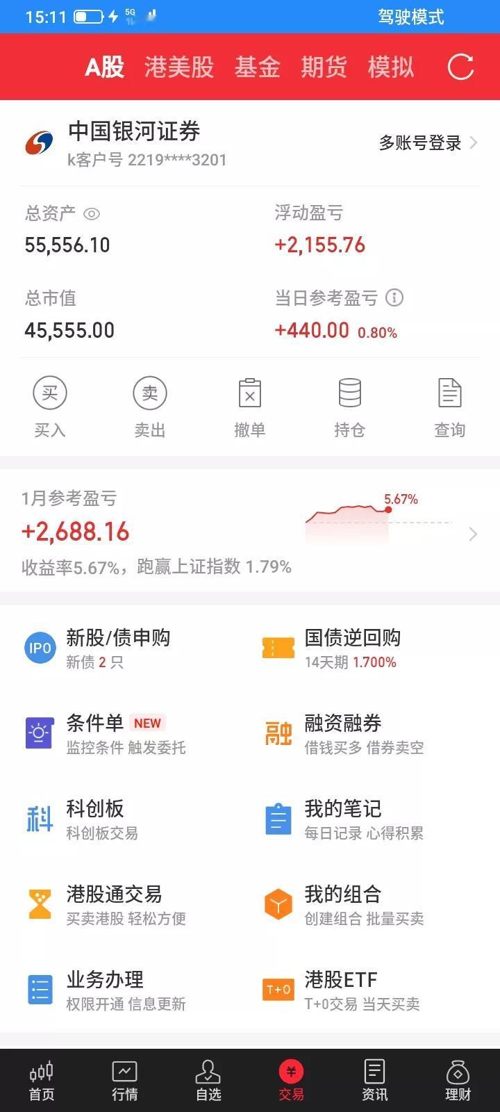 2026.01.22,今天上证指数继续顽强收红,大部分股票都上涨,我持有的除了互联网etf微跌,其它的也翻红反弹一点点 。 通信设备etf昨天收盘还是买对了,今天收阳线,继续持有。 互联网etf高开低走,收阴线,应该卖掉,但是又没有跌多少,折中一下,卖掉一部分,收盘以0.899卖掉2000股,先亏4块钱,留下一部分明天再看一看。 金森反弹上涨继续收阳线,继续持有。 太阳今天终于反弹了,收阳线了,重新买回来,收盘以9.60买入300股。 长鸿昨天卖错了,今天低开低走,触底反弹,收阳线,重新买回来,早上怕踏空了,以14.70提前买了100股,收盘以14.80再买入200股。 上能今天又是低开,估计应该会收阳线,昨天买入应该是对的,赢钱加码,应该再加重仓位,乘胜追击,买对的时候加重仓位,买错的时候要轻仓,开盘委托39.21买入100股,开盘后上下波动就成交了,但是成交之后还是下跌,最低跌到38.77,一下子浮亏200块,还是买错了,买贵了,但是忽略盘中波动,不能下跌就慌,不然容易被洗出来,跌到38.77,然后触底反弹,最高冲到40.19,但是不抄底,不逃顶,拉多高也不是我的,收盘还是收阳线,判断正确就继续持有。 今天总市值4.5555万元,总资产5.5556万元,总体账户反弹回本440元。