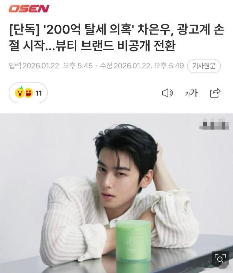 车银优代言广告被隐藏 据韩媒,因被指涉嫌逃税高达200亿韩元,车银优正遭遇广告界的“切割”,护肤品牌将其官方YouTube频道等平台上公开的车银优相关视频转为非公开状态。相关视频目前显示为“无法播放视频”“该视频为非公开视频”,处于无法观看的状态。车银优涉嫌逃税