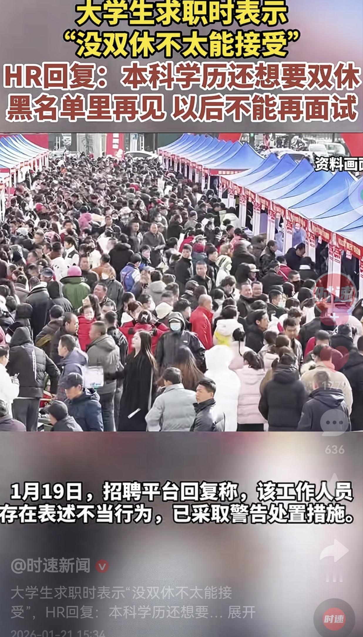 人家只是想要一份双休的工作,这不是正常需求吗?为什么要这么说人家呢?假如你们公司不接受双休,你正常说就可以了,求职者都能理解,为什么要“嘲讽”人家呢? 1月18日,一名大学生在求职时,只是很正常地表示,自己想要双休的工作,如果没双休,不太能接受。 本以为没有事,结果中国人寿的HR直接回怼:“你一个本科学历的还想要双休,在黑名单里再见,以后不能在我们公司面试。” 这名大学生很生气,就把自己的求职经历发到了网上,后引起广大网友的共鸣。 1月19日,招聘平台回应称该工作人员表述不当,已对其采取警告处置。 网友看到后评论说:“双休是法律规定的基本权益,怎么到了某些HR的嘴里,就成了高学历人才的特权?” 也有的网友说:“HR这种高高在上的态度,说白了就是把求职者当成了可以随意压榨的工具。” 还有的网友说:“本科学历怎么了?嫌人家学历低,人家凭自己的本事吃饭,不偷不抢,而且要求合理的休息,这有什么错吗?” 职场里最让人寒心的,就是这种“你不配”的傲慢。我们努力读书、认真工作,不是为了接受PUA,而是为了换来一份有尊严的生活。 这件事也提醒我们:好的公司,就应该正视求职者的需求,而不是一味地剥削和压榨,否则,名头再大的公司,也会受到影响。