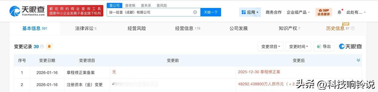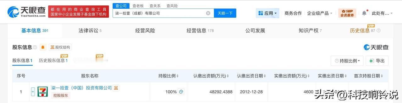【7-11成都公司增资至4.8亿】 天眼查工商信息显示,近日,柒一拾壹(成都)有限公司发生工商变更,注册资本由约4.7亿人民币增至约4.8亿人民币。 该公司成立于2010年12月,法定代表人为福田达也,经营范围含食品经营、特殊医学用途配方食品销售、保健食品销售、邮件寄递服务、互联网销售、日用品销售、文具用品零售等。股东信息显示,该公司由柒一拾壹(中国)投资有限公司全资持股。 天眼查信息: