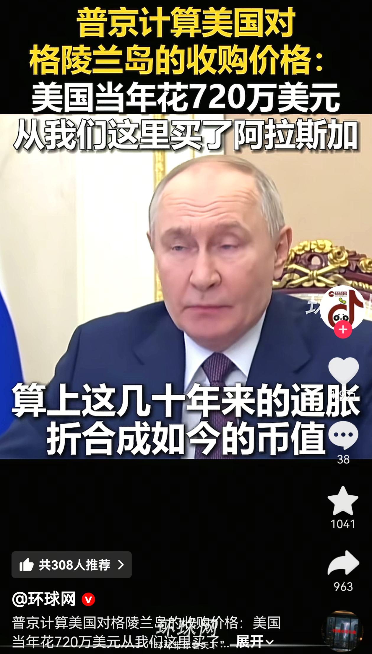 普京不嫌事大,给欧洲火上浇油,亲自帮特朗普计算购买格陵兰岛要花多少钱, 普京拿美国当年购买阿拉斯加的钱,他说美国当时花了720万美元购买阿拉斯加,按照通胀来换算成如今的钱的话,大概1.58亿美元,参考购买阿拉斯加的话,美国购买格陵兰岛大概要2-2.5亿美元, 如果按照当时的黄金来算的话,美国要花10亿美元来购买格陵兰岛,普京认为美国出得起这笔钱。 俄罗斯现在的心思就是想用格林兰岛来让欧美互咬,自己坐岸上看戏,至于私下有没有与特朗普达成什么,这个必须防一防,没有永远的朋友。