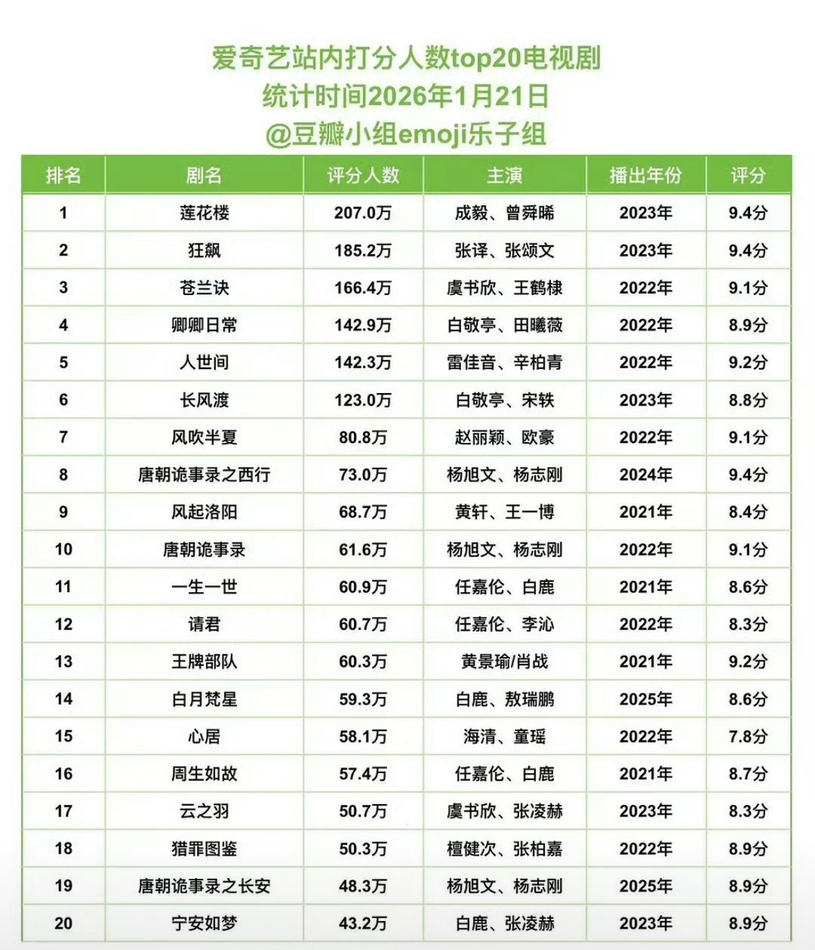 爱奇艺站内打分人数top20,成毅一番大男主剧莲花楼破200w,全站断层第一。☝🏻