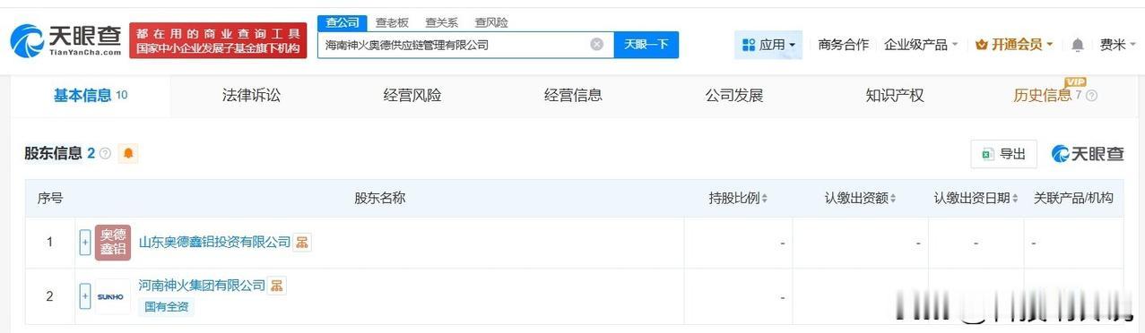 【神火集团等在海南成立供应链管理公司 注册资本1亿】 天眼查工商信息显示,近日,海南神火奥德供应链管理有限公司成立,法定代表人为刘超,注册资本1亿人民币,经营范围包括保税仓库经营、海关监管货物仓储服务、供应链管理服务、以自有资金从事投资活动等。股东信息显示,该公司由山东奥德鑫铝投资有限公司、河南神火集团有限公司共同持股。 天眼查信息:
