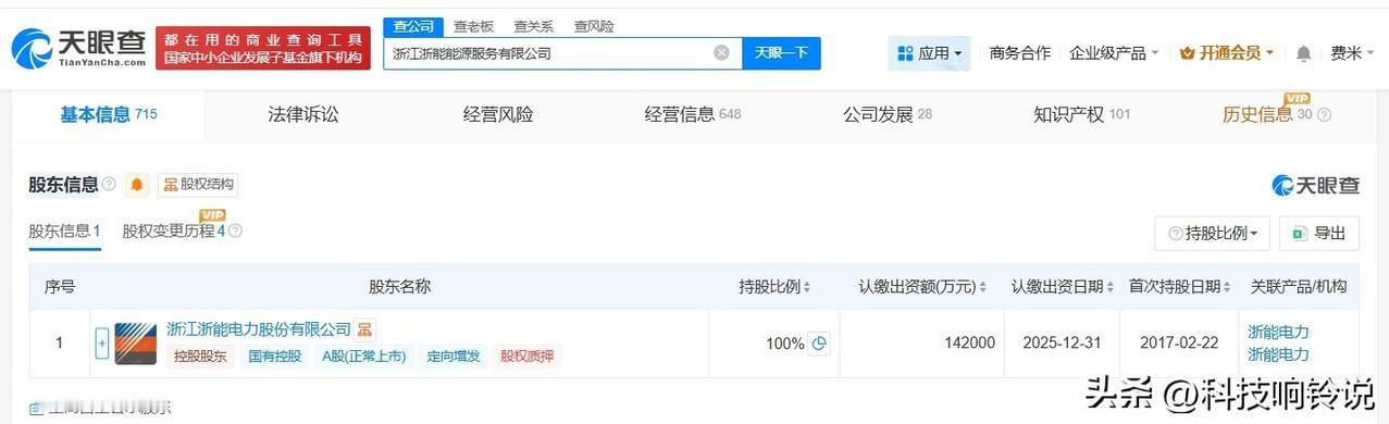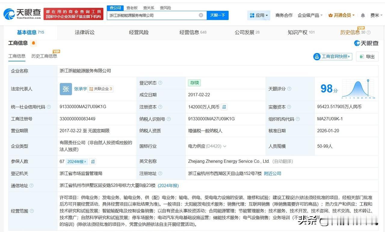 【浙能电力旗下能源服务公司增资至14.2亿 增幅约15%】 天眼查工商信息显示,近日,浙江浙能能源服务有限公司发生工商变更,注册资本由12.35亿人民币增至14.2亿人民币,增幅约15%,同时,部分主要人员发生变更。 浙江浙能能源服务有限公司成立于2017年2月,法定代表人为张承宇,经营范围包括供电业务、发电业务、输电业务、供(配)电业务等。股东信息显示,该公司由浙能电力(600023)全资持股。 天眼查信息: