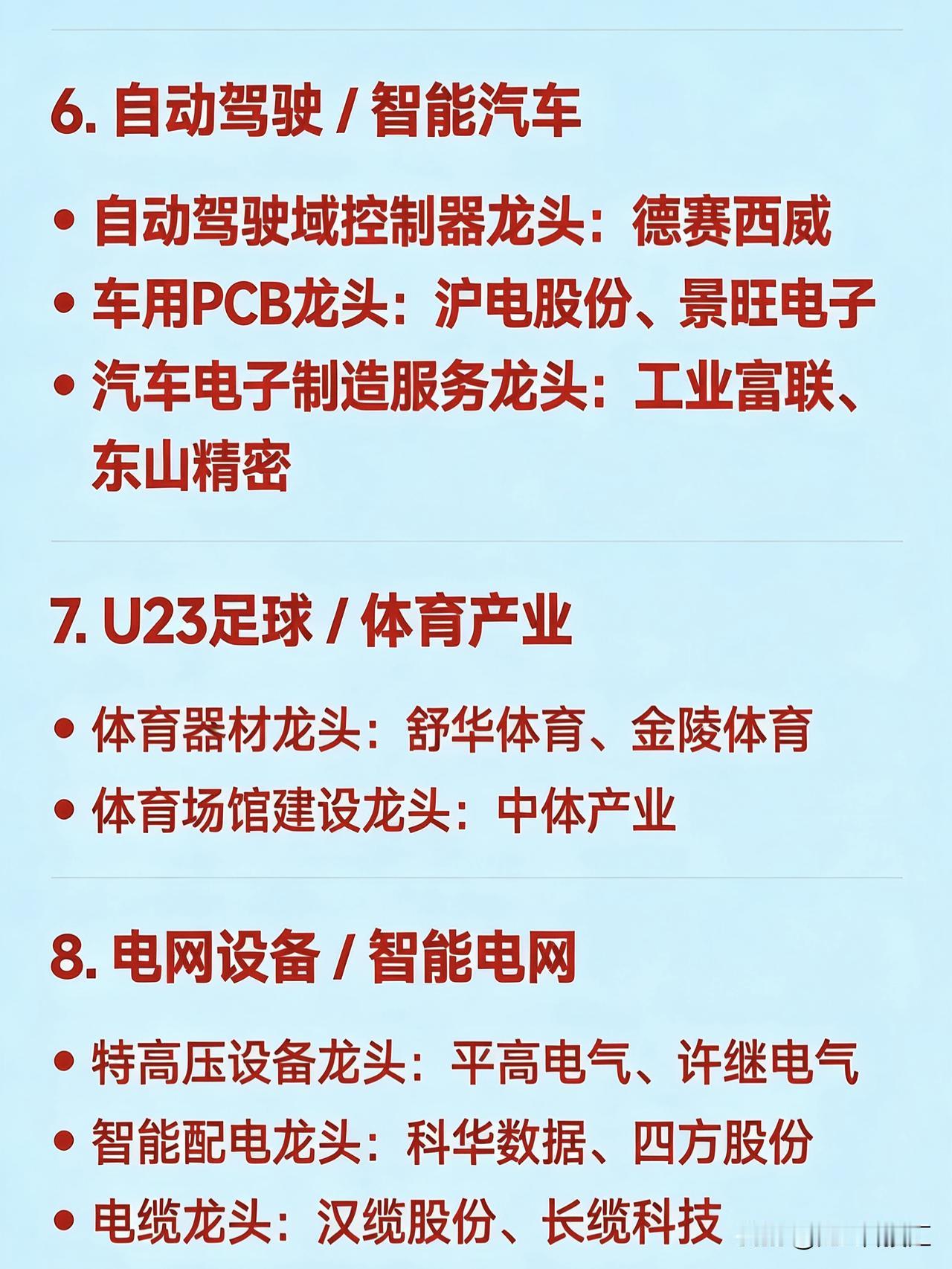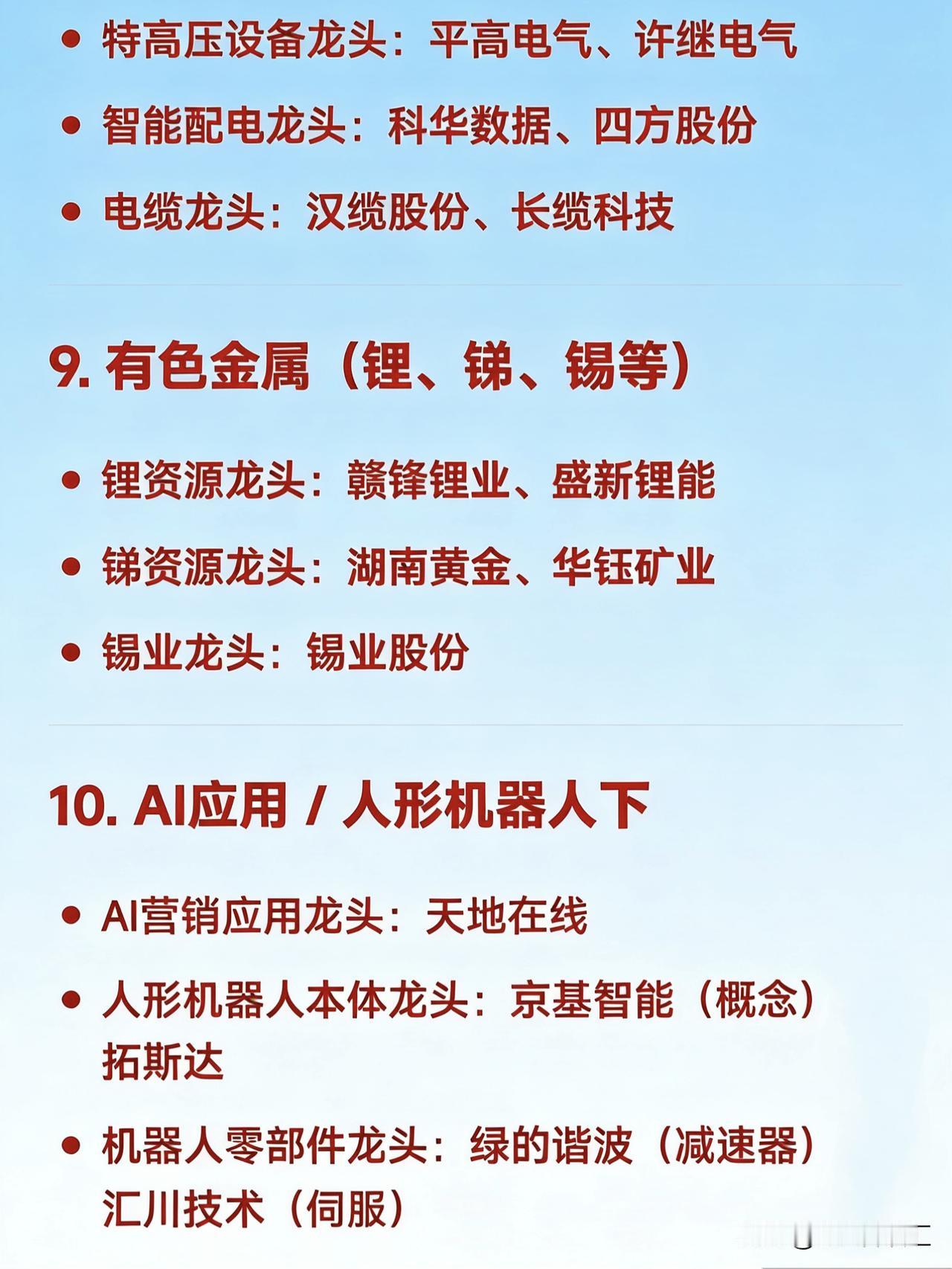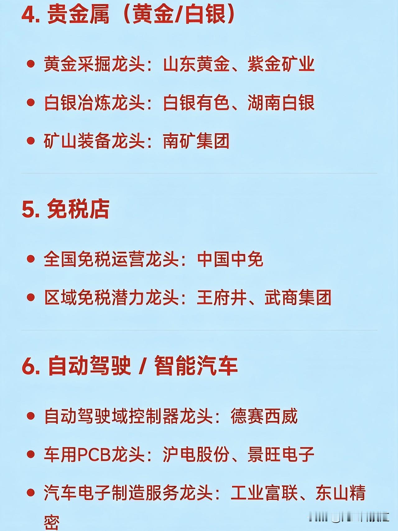 2026年1月22日十大热点科技及其产业链核心龙头 1. PCB(印制电路板) 覆铜板龙头:生益科技 AI服务器PCB龙头:胜宏科技、沪电股份 封装基板龙头:深南电路、兴森科技 PCB设备龙头:芯碁微装   2. 算力芯片 / 存储芯片 存储芯片龙头:兆易创新(NOR Flash)、北京君正(DRAM) 芯片封测龙头:通富微电、华天科技 半导体材料龙头:江化微(湿电子化学品) 芯片设备国产替代龙头:中微公司、北方华创   3. 商业航天 卫星制造龙头:长光卫星(未上市,关联:航天电子) 航天发动机龙头:航发动力 测控与地面系统龙头:国睿科技 火箭发射服务龙头:中国火箭(关联:航天科技、航天晨光)   4. 贵金属(黄金/白银) 黄金采掘龙头:山东黄金、紫金矿业 白银冶炼龙头:白银有色、湖南白银 矿山装备龙头:南矿集团   5. 免税店 全国免税运营龙头:中国中免 区域免税潜力龙头:王府井、武商集团   6. 自动驾驶 / 智能汽车 自动驾驶域控制器龙头:德赛西威 车用PCB龙头:沪电股份、景旺电子 汽车电子制造服务龙头:工业富联、东山精密   7. U23足球 / 体育产业 体育器材龙头:舒华体育、金陵体育 体育场馆建设龙头:中体产业   8. 电网设备 / 智能电网 特高压设备龙头:平高电气、许继电气 智能配电龙头:科华数据、四方股份 电缆龙头:汉缆股份、长缆科技   9. 有色金属(锂、锑、锡等) 锂资源龙头:赣锋锂业、盛新锂能 锑资源龙头:湖南黄金、华钰矿业 锡业龙头:锡业股份   10. AI应用 / 人形机器人 AI营销应用龙头:天地在线 人形机器人本体龙头:京基智能(概念)、拓斯达 机器人零部件龙头:绿的谐波(减速器)、汇川技术(伺服)