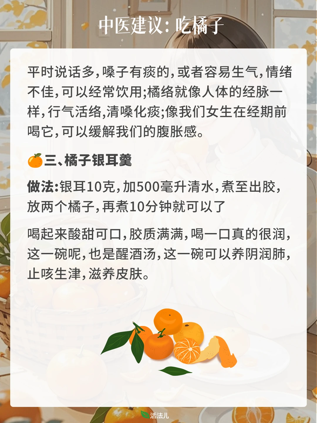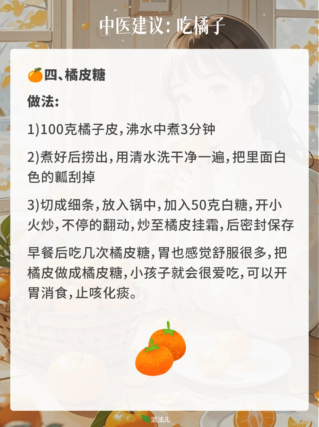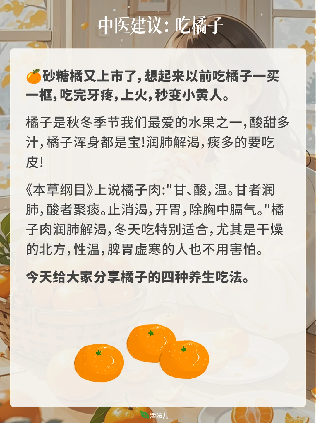 砂糖橘又上市了,想起来以前吃橘子一买一框,吃完牙疼,上火,秒变小黄人。 橘子是秋冬季节我们最爱的水果之一,酸甜多汁,橘子浑身都是宝!润肺解渴,痰多的要吃皮! 《本草纲目》上说橘子肉:"甘、酸,温。甘者润肺,酸者聚痰。止消渴,开胃,除胸中膈气。"橘子肉润肺解渴,冬天吃特别适合,尤其是干燥的北方,性温,脾胃虚寒的人也不用害怕。 今天给大家分享橘子的四种养生吃法。