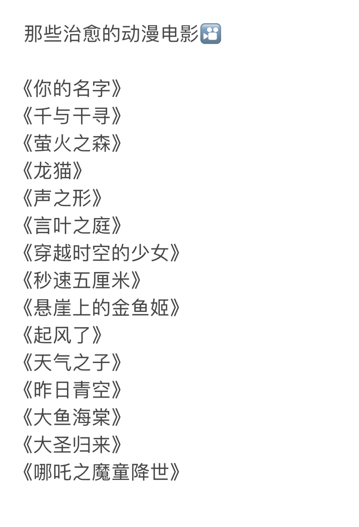 推荐十五部部超好看的动漫电影🎦《你的名字》《千与干寻》《萤火之森》《龙猫》《声之形》《言叶之庭》《穿越时空的少女》《秒速五厘米》《悬崖上的金鱼姬》《起风了》《天气之子》《昨日青空》《大鱼海棠》《大圣归来》《哪吒之魔童降世》2025动漫嘉年华次元新星计划