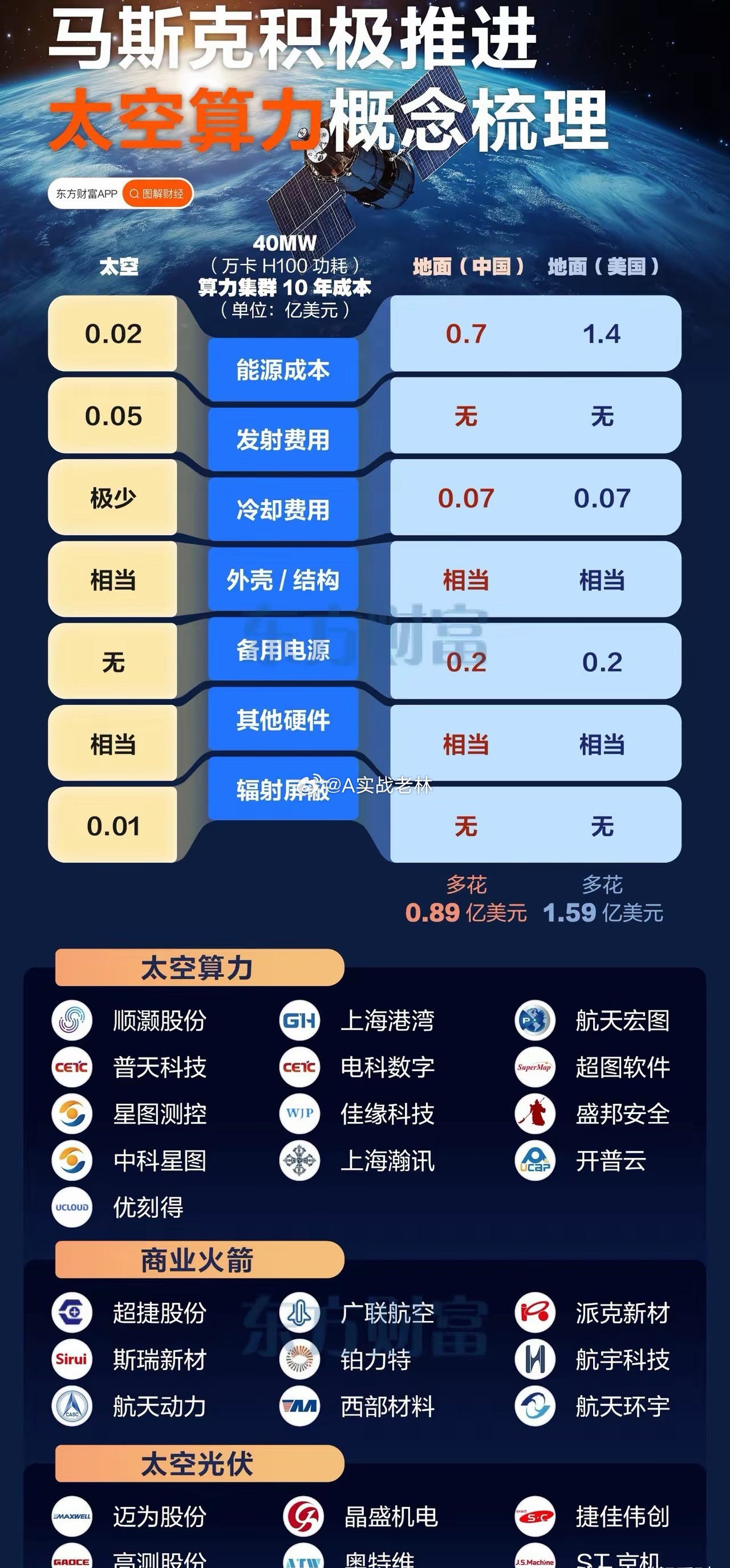 马斯克放大招!SpaceX 2026年7月前上市,打开太空算力新黄金赛道!刚刚,马斯克官宣:SpaceX 2026年7月前上市!这家估值超2500亿美元的航天巨头,终于要登陆资本市场,而更震撼的是,其野心不止火箭,而是太空算力。为什么全球科技巨头疯狂押注太空?无限太阳能:太空中无昼夜、无云层,光伏效率碾压地面3倍以上;超低成本建数据中心:真空环境天然散热,省下90%冷却能耗;低延迟+高安全:近地轨道部署算力节点,未来AI训练或直接上天。SpaceX已悄然布局,星链卫星搭载边缘计算模块,与微软、谷歌探讨轨道云计算合作,太空光伏+算力一体化,正成下一代数字基建核心。对中国意味着什么?商业航天竞争升级为空天算力战争;国内亦庄“火箭大街”、银河航天等加速追赶;太空能源、卫星AI、空间电源产业链迎爆发窗口。普通人虽买不起SpaceX股票,但盯紧A股商业航天+太空光伏+星载计算三重概念,就是抓住2026最硬核风口。